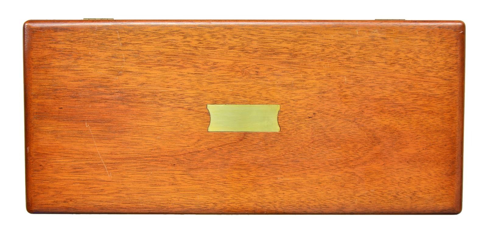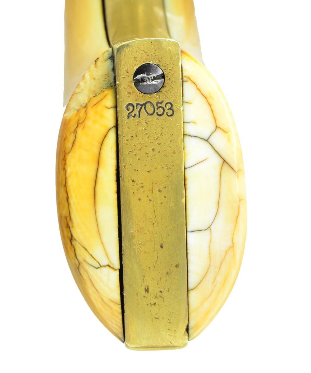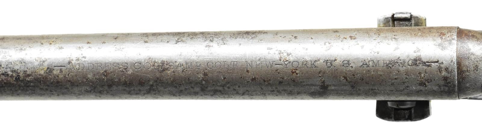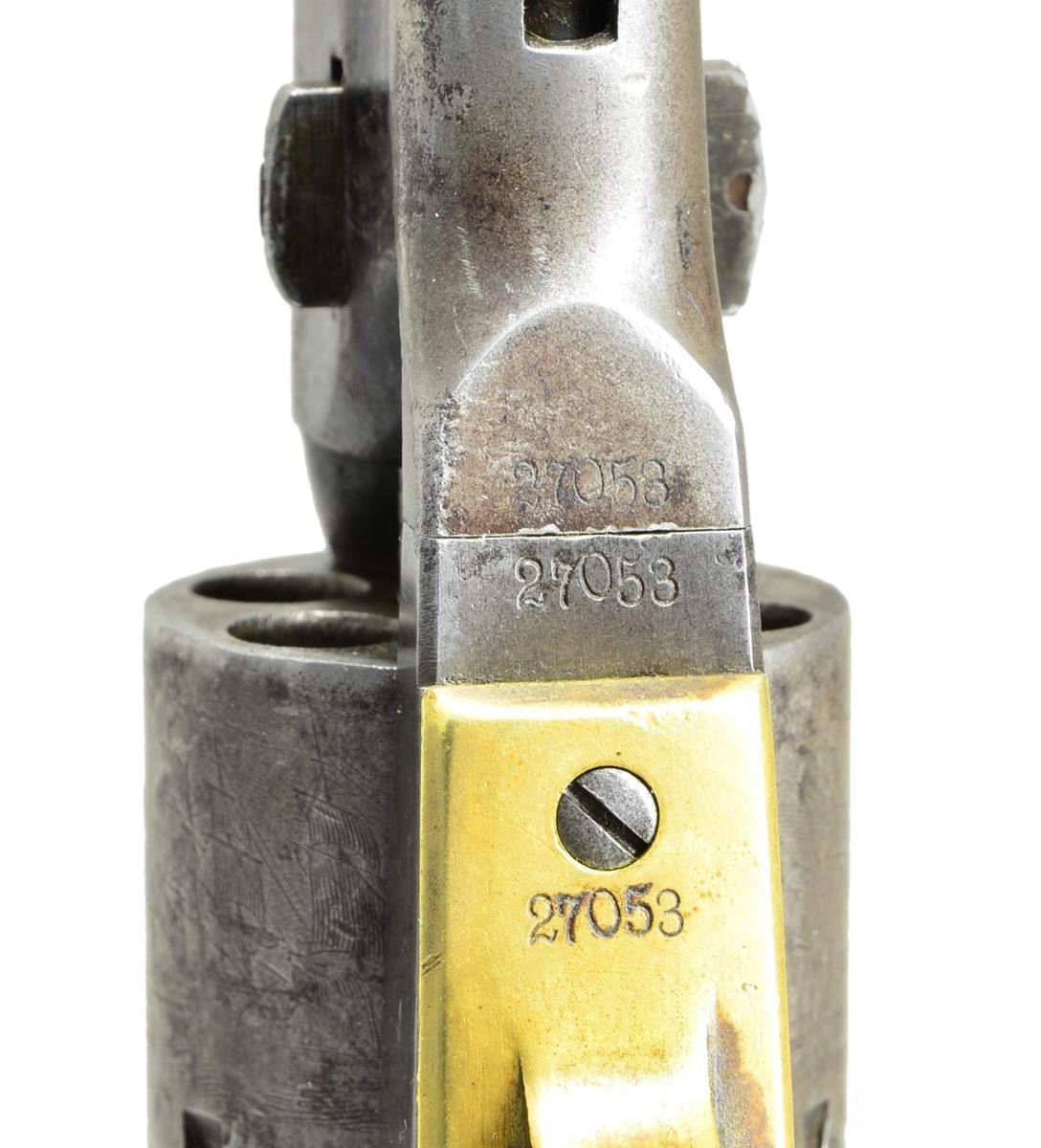 Cal. 36. S# 27053. Bbl. 7 1/2" round with New York address. German silver blade front sight. Round 6 shot cyl. has naval engagement roll engraving. Blue & case colored finish. Silver finished trigger guard & backstrap. 1 Piece ivory grips. Barrel, frame, grip straps, cyl & wedge have matching numbers. Mfg. 1865. UNATTACHED ACCESSORIES: added contemporary hardwood casing with brass rectangular nameplate on lid. Segmented interior with green cloth lining that shows wear. Case contains "Colt's Patent" marked Naval sized flask with Patriotic themed ornamentation. Flask has acquired a dark patina & shows light dents. Also included is a 2 cavity brass mold, turnscrew, bullets, round balls, cap tin, replacement screws & case key. Chip from toe of right grip panel is safely stored in the case. CONDITION: very good. Bbl. retains 40% lightly faded blue in protected areas fading to gray showing scattered corrosion with small dents in wedge area. Cyl. has faded to gray showing spots of light corrosion & 90% Naval scene. Frames & sides of hammer show faint traces of case colors. Grip straps show small amounts of silver in protected areas acquiring dark tarnish around trigger guard bow. Grips are slightly undersized with pronounced age related yellowing having grain checking at butt. Right panel is chipped at toe. Sound action. Lightly pitted bore retains strong rifling. (01-22270/DS). ANTIQUE. $3,000-5,000