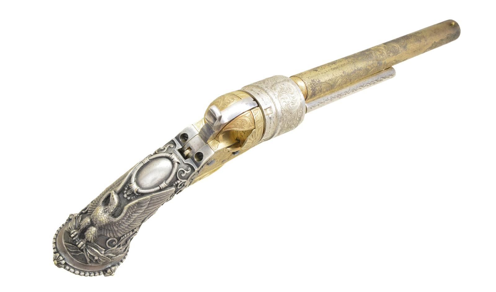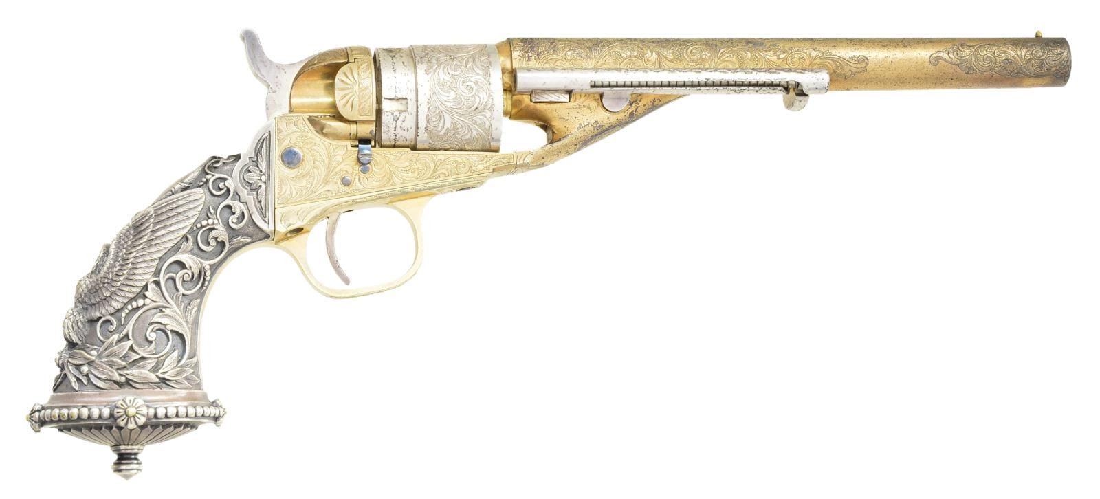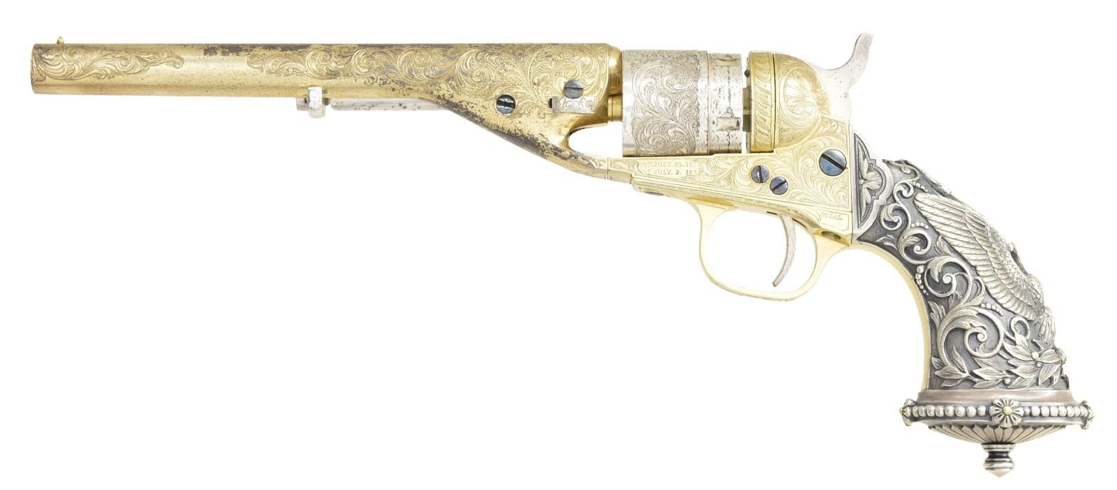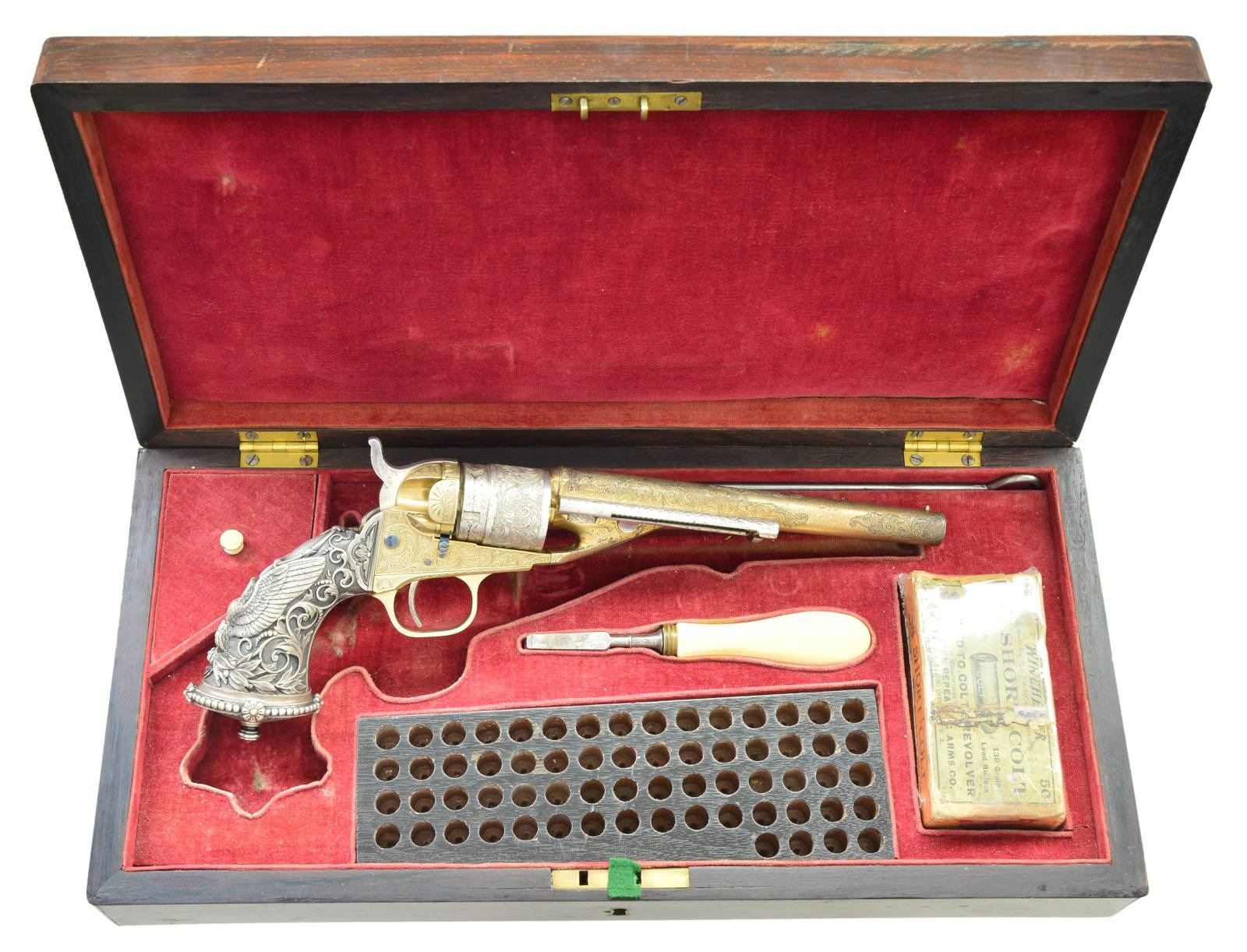 CONVERSION REVOLVER WITH "TIFFANY" EAGLE GRIPS. Cal. 38. S# 5772. Bbl. 6.5". 6.5”round barrel, 1-line New York address, ejector housing, gold & silver plated, Nimschke-style New York engraving on entirety of frame and en suite arabesques and punch dot backgrounds on barrel & cylinder. Classic Nimschke-style radiating fan design on recoil shield & loading gate door. Perfectly fit Wexell & Degress raised relief “eagle” silverplated grips. For many years these rare grips were associated with Tiffany of New York, but research by Marlin Pohemus proved manufacture and 1874 patent. This revolver was originally made in percussion in 1861, conversion among the earliest in 1874. Revolver is cased in French fitted case with the original ivory handled screwdriver, steel cleaning rod, and added pack of Colt cartridges. This is probably the finest gold & silver New York engraved revolver extant.