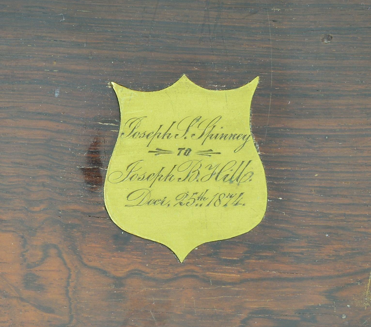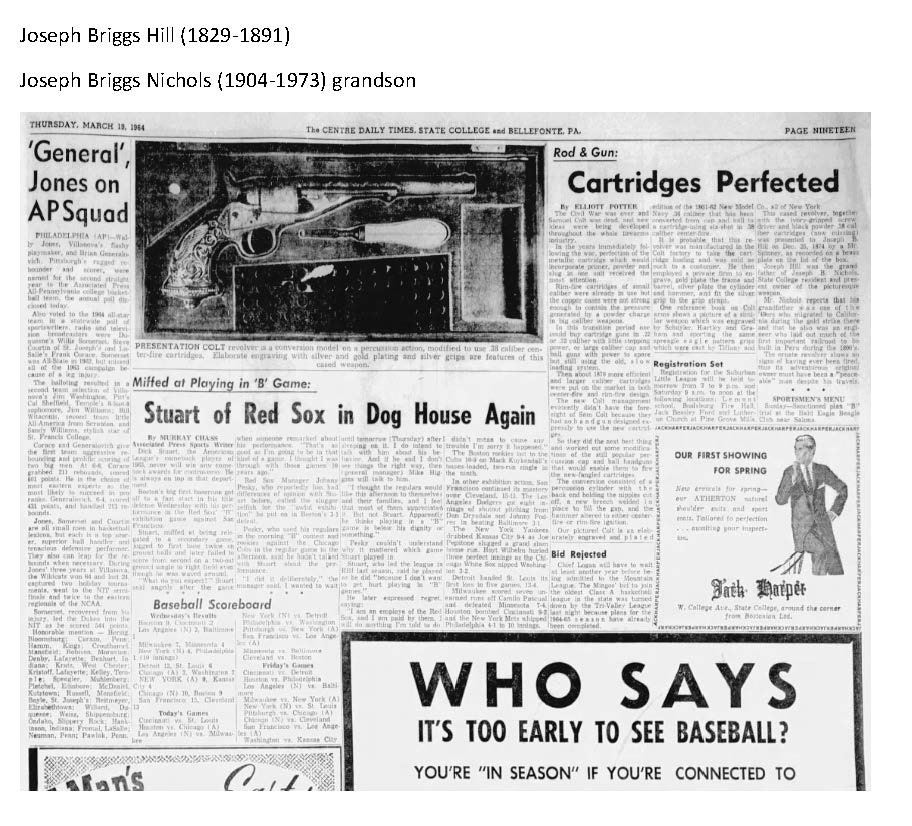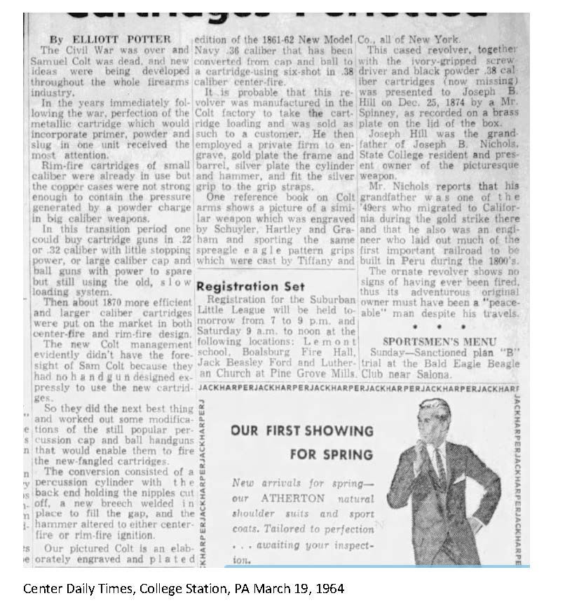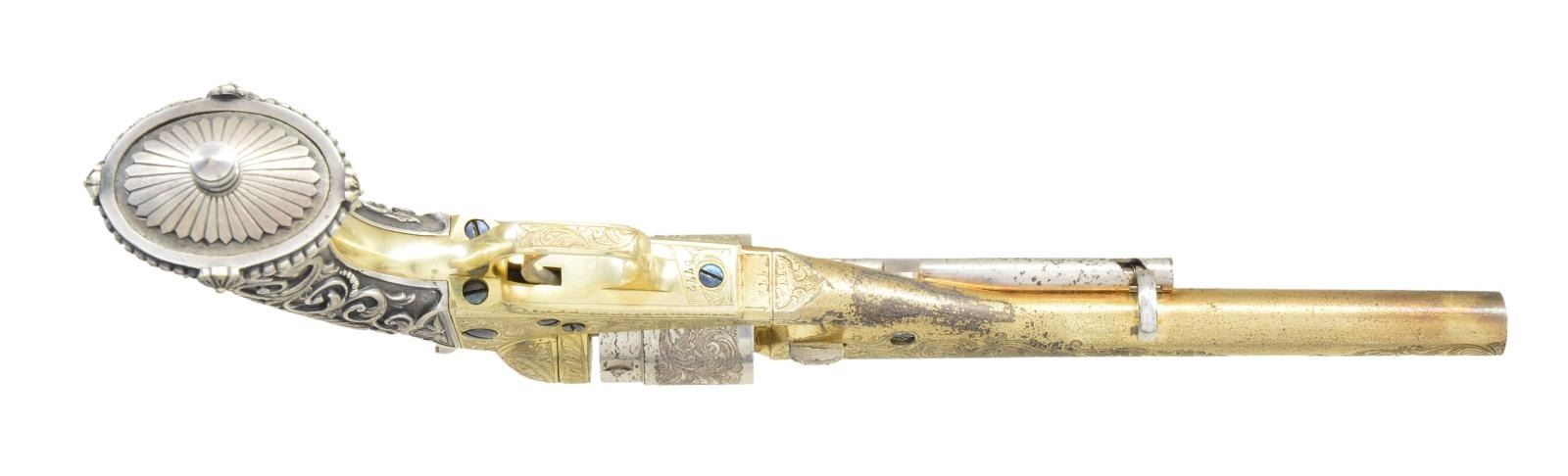 Presentation plaque on top of case finely engraved: “Joseph S. Spinney / to / Joseph B. Hill / Dec. 25th 1874” Joseph Briggs Hill (1829-1891) led colorful life of adventure & engineer. Born in NY, lived in California during gold rush, lived in Morendo, Peru in 1860s till returning to NYC in 1875 when Joseph S. Spinney presented him with this magnificent pistol as a Christmas present. Joseph S. Spinney (1805-1882) was wealthy New York City merchant and “sea captain”. His son Joseph S. Spinney, Jr was executor of Joseph B. Hill’s estate, so families were close. Both men were intimately involved in the building of the Central Railroad of Peru, Hill being engineer 1870-1875, and Spinney being American purchasing agent. The RR was multi-million-dollar enterprise. Both left very large valuable estates, especially Spinney. This revolver was retained in the Hill family till recently. Hill’s grandson Joseph Briggs Nichols (1904-1973) had this revolver and its story published in State College, PA newspaper article in 1964 (copy accompanies). UNATTACHED ACCESSORIES: copy of cited newspaper article and research notes. CONDITION: Excellent overall, retaining most of the original gold & silver finish as when engraved & cased in 1874. Screws retain most of their bright blue finish. Mechanically crisp, bright shiny bore. Casing is equally fine, light wear. The added cartridge pack is plastic wrapped, damaged illustrated label. (01-22990/JS). $20,000-30,000.