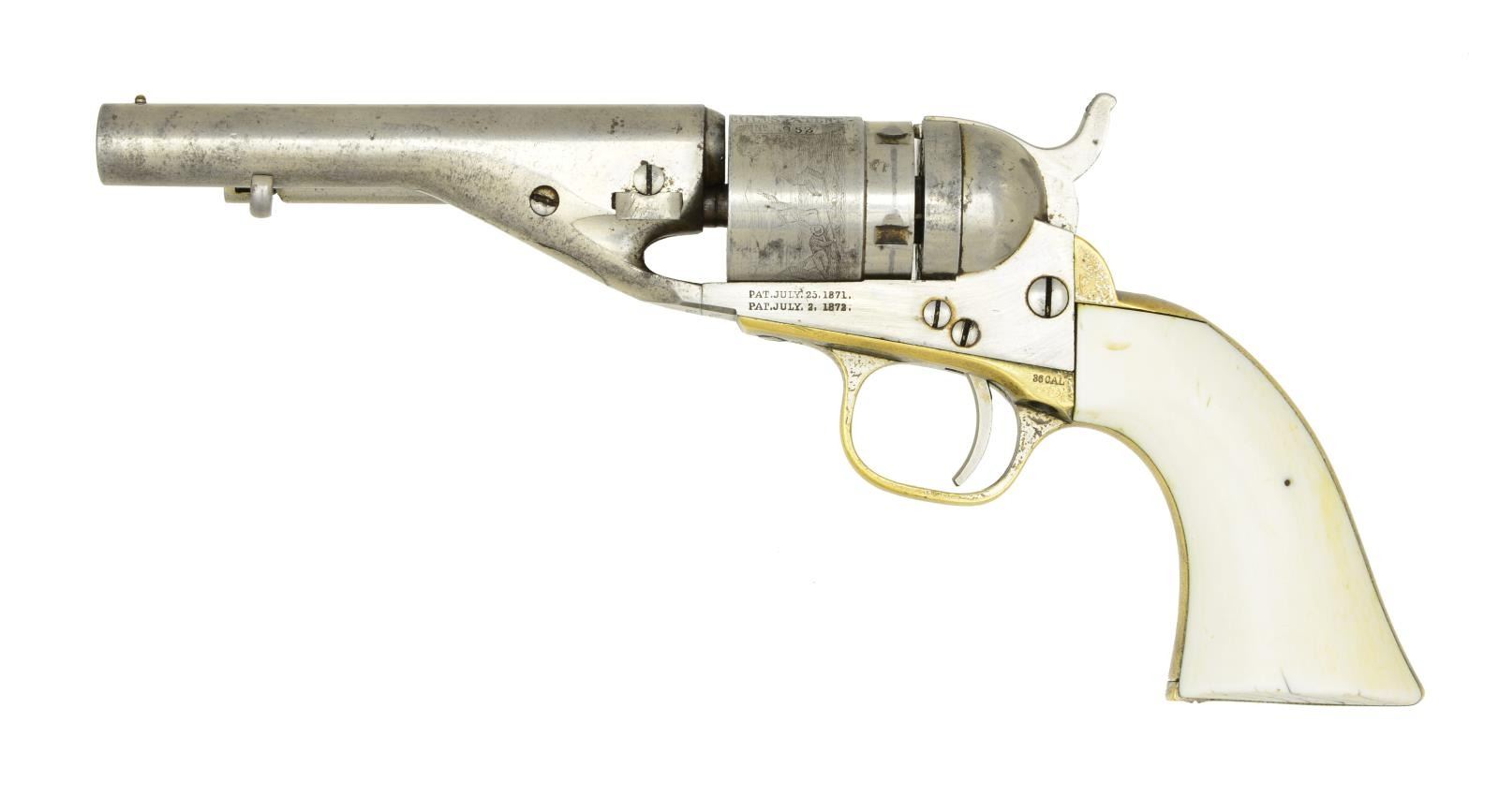 WITH EJECTOR. Cal. 38 RF. S# 7952. Bbl. 4 1/2" rnd. w/ bead front sight & New York address. Loading lever slot is plugged. Rnd. rebated 5 shot cyl. w/ stage coach scene roll engraving. Brass backstrap triggerguard. Left side of frame has July 25, 1871 & July 2nd, 1873 patent dates. Full nickel finish. Bbl., frame, grip straps & cyl. have matching numbers. Wedge has non-matching number "3245". One piece ivory grips. Est. quantity of 65,000 produced 1873-1875. CONDITION: bbl., cyl. & frame retain over 80% nickel. Grip straps retain sm. amounts of plated finish in protected areas. Ivory grips show some age related checking & shrinkage. Strong mechanics. Lightly pitted bore retains sound rifling. PROVENANCE: From the Collection of James B. Taylor. (01-20562/DS). ANTIQUE. $2,000-2,500.