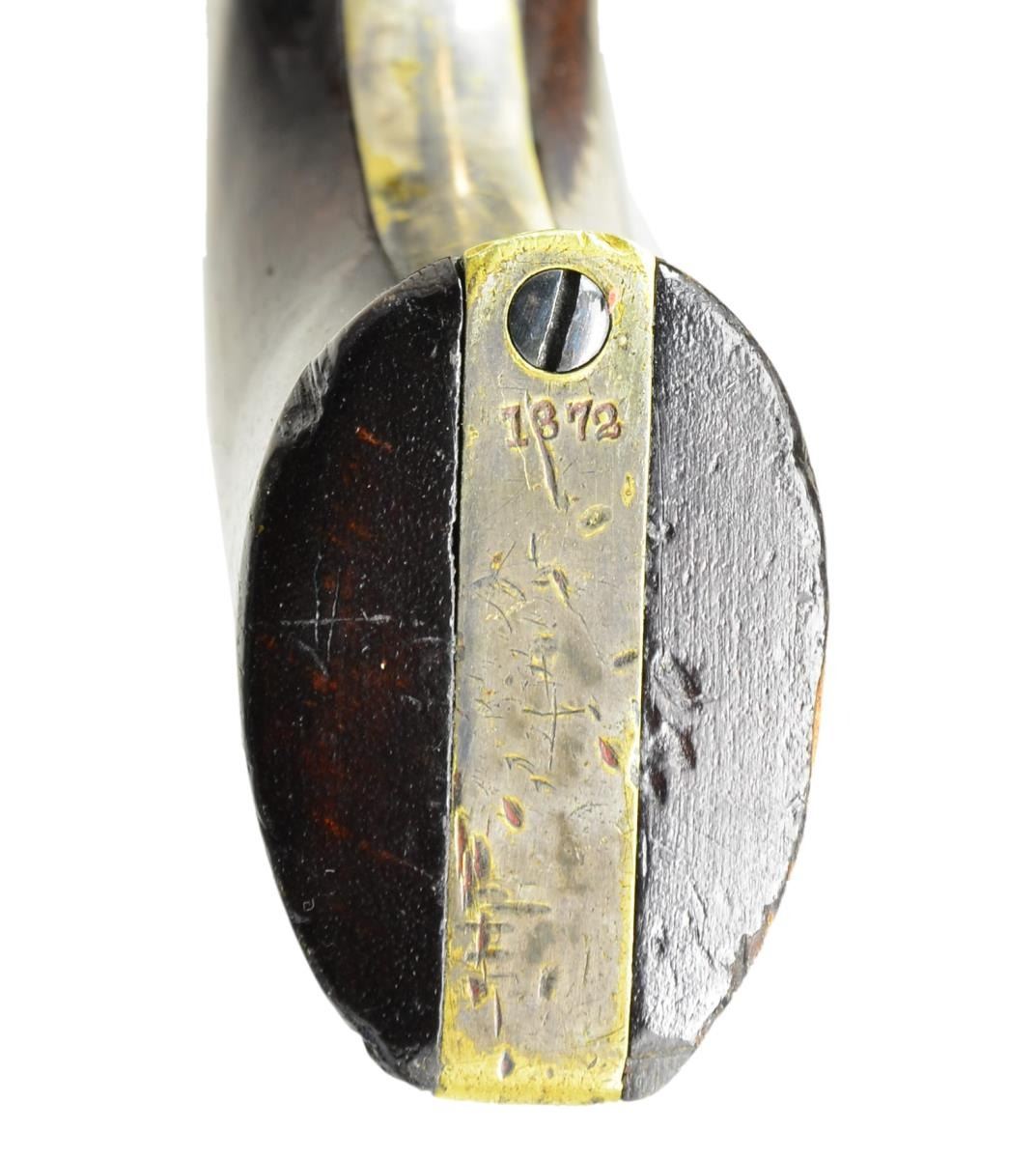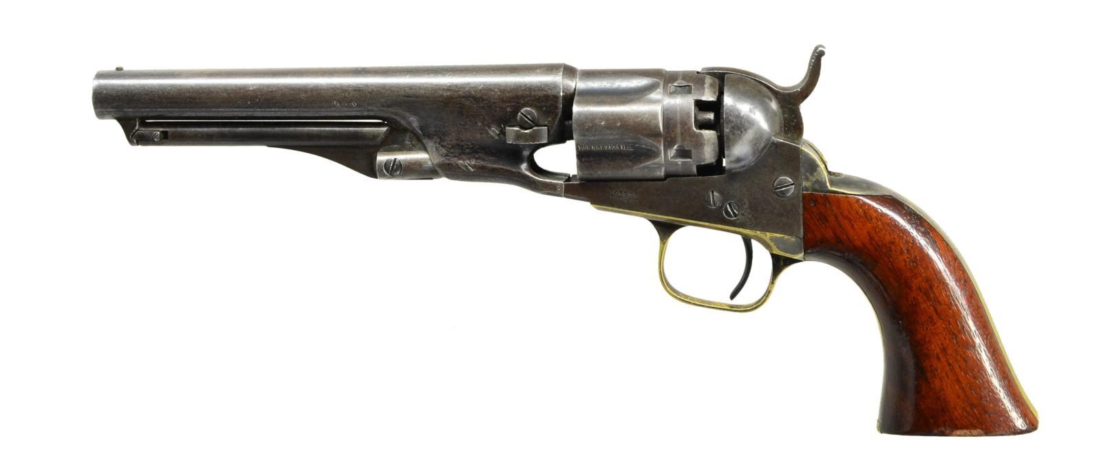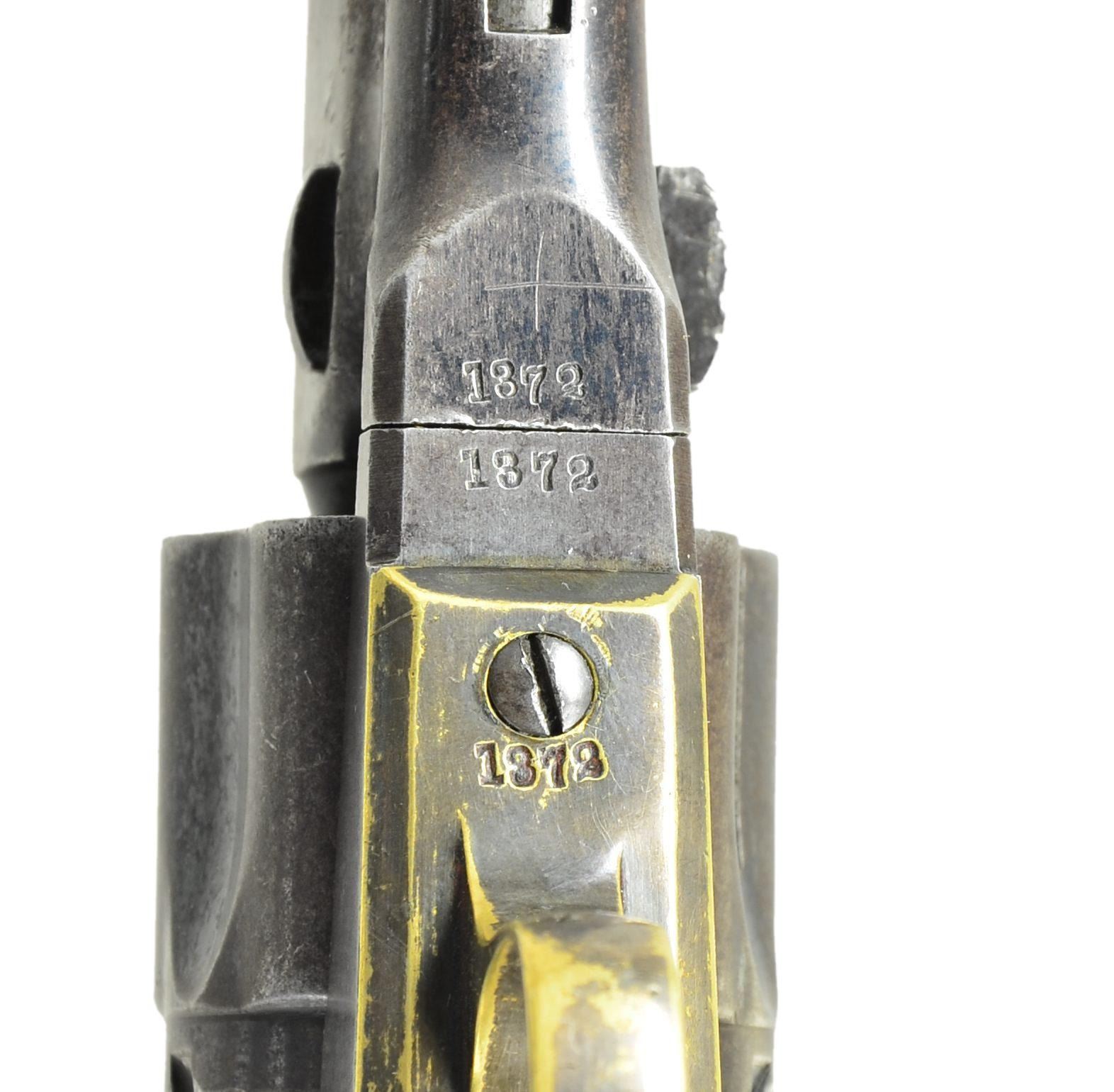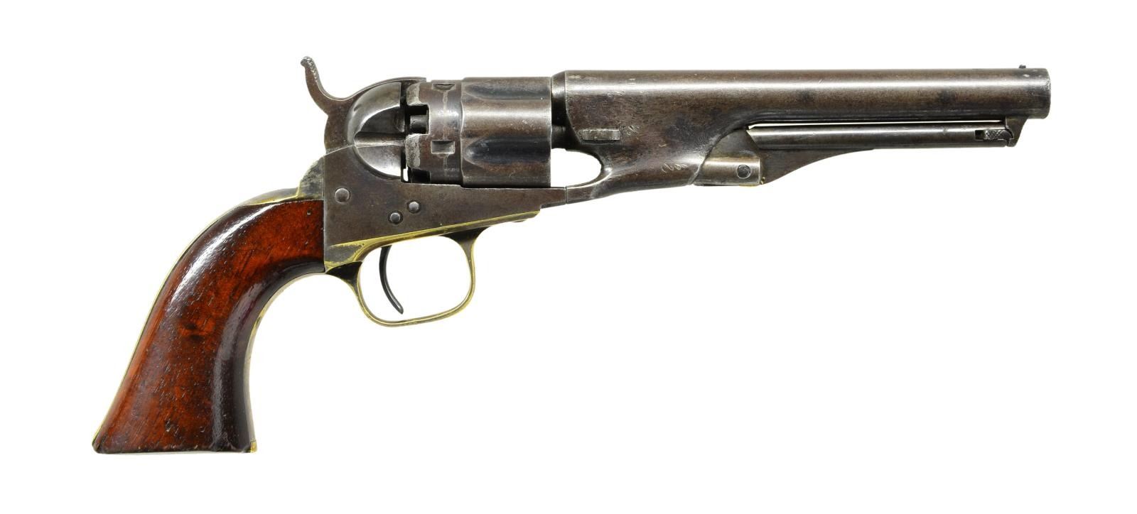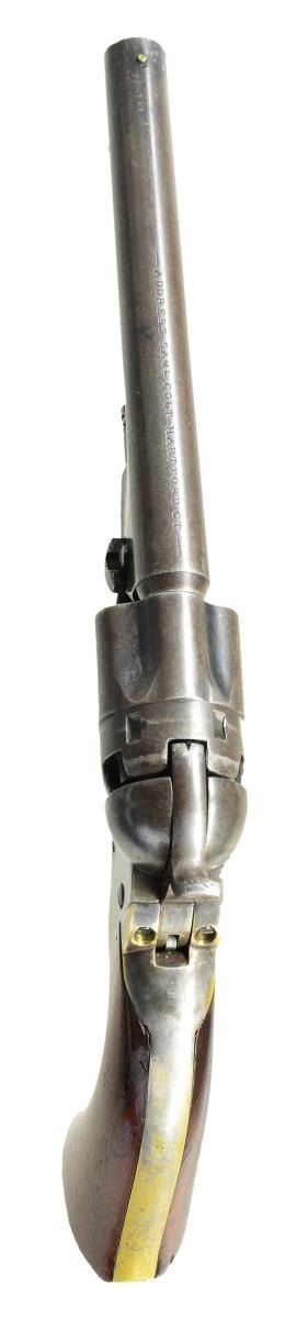 Cal. 36. S# 1872. Bbl. 5 1/2" round w/ Hartford address & bead sight. Fluted rebated five shot cyl. Blue & case colored finish w/ silver finish brass grip straps. 1 piece walnut grips. Bbl., frame, grip straps, cyl. & wedge have matching numbers. Mfg. 1861 during the American Civil War. CONDITION: fine. Bbl. & cyl. retain 50% dull fading blue w/ areas of dents particularly around the wedge. Action has traces of dark lightly visible case colors. Grip straps retain 50% silver finish having acquired a dark tarnish. Grips have lightly worn finish w/ dents at butt. Sound action. Bore has intact rifling w/ spots of pitting. (01-22982/DS). ANTIQUE. $1,500-2,000.