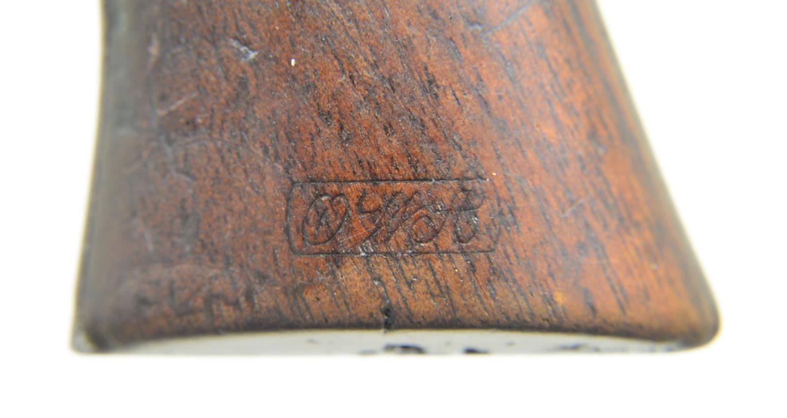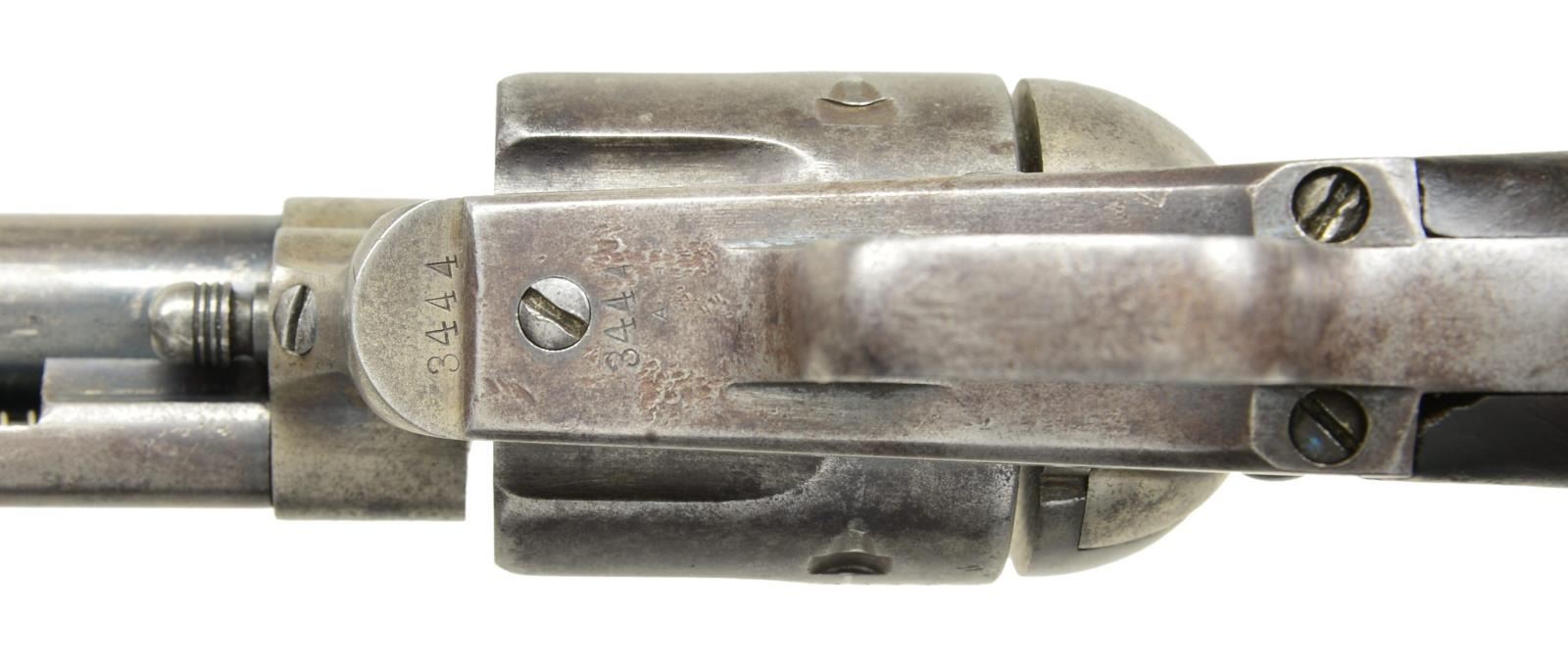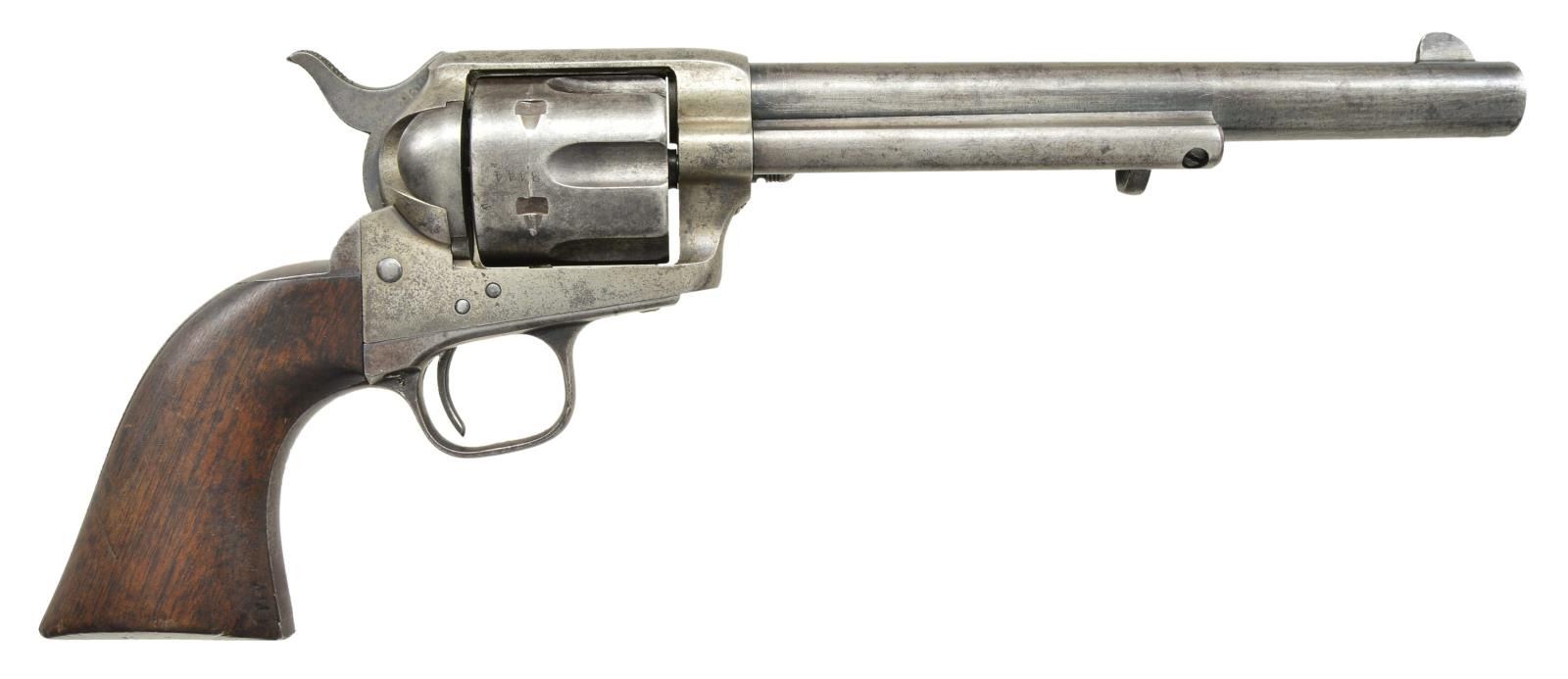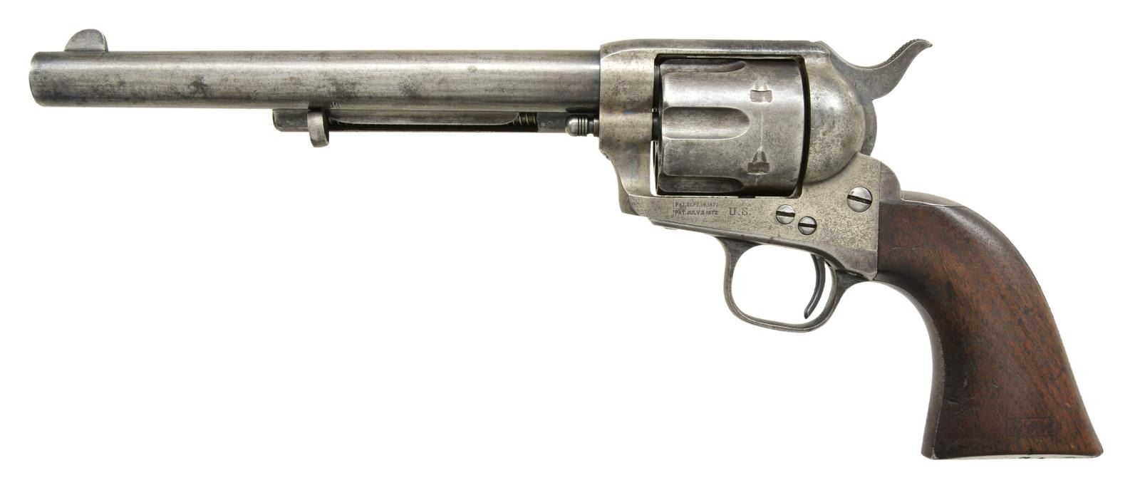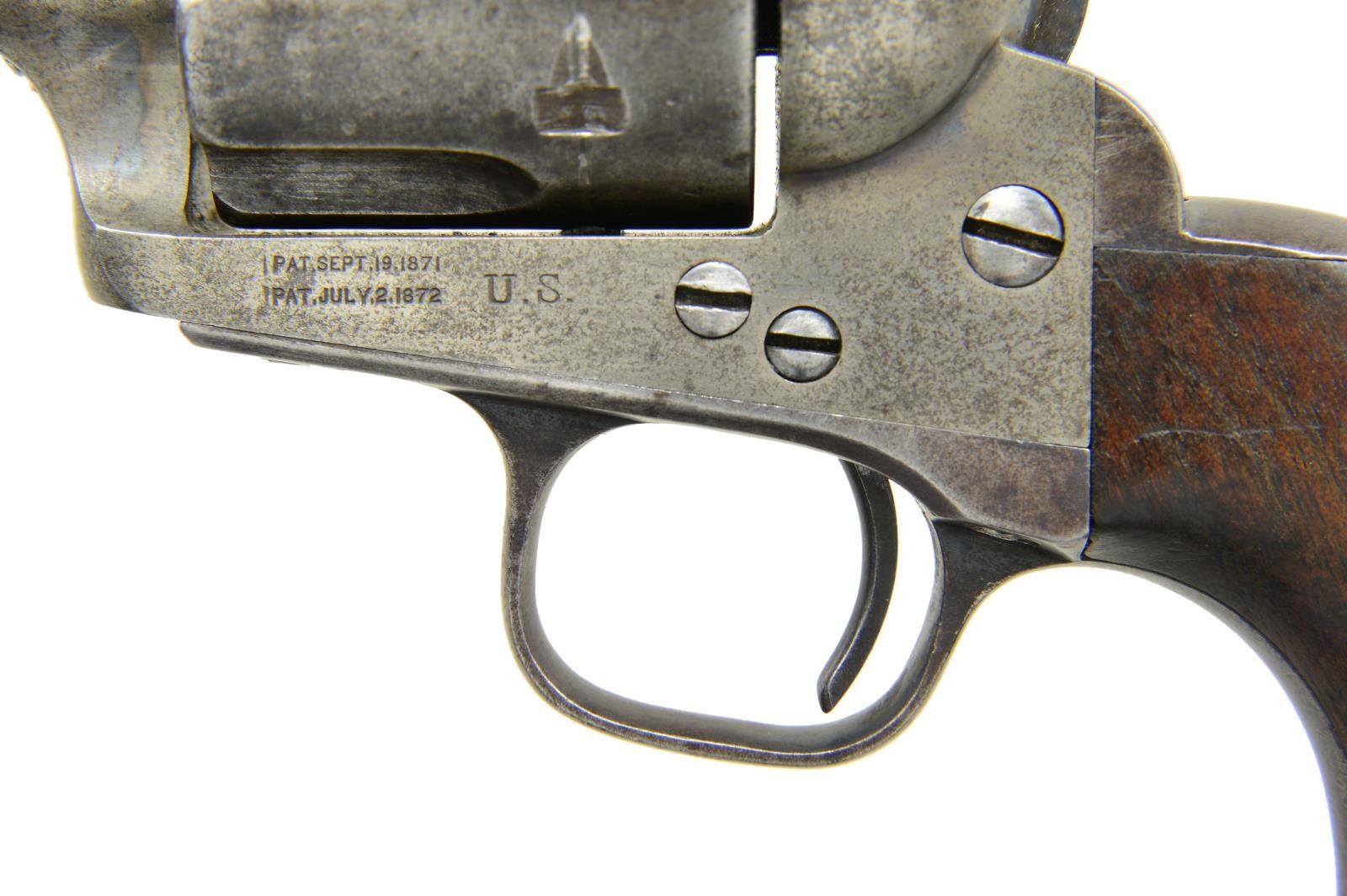 Cal. 45 Colt. S# 3444. Bbl 7 1/2”. Six shot fluted cyl. Blue & case colored finish. Bullseye ejector head. Left side of frame is marked “U.S.”. Trigger guard below S# is stamped “A” referring to Principal Sub Inspector Orville W. Ainsworth. Hammer slot has “C” inspection marks. Loading gate is numbered “877”. Bbl, frame, grip straps & cyl. have matching S#s. 1 piece walnut grip. Left panel has lightly visible “OWA” Ainsworth cartouche. Colt Serial Number Lookup lists year of mfg. as 1874. CONDITION: original finish has largely faded to gray showing scattered spots of light pitting. Frame & hammer retain some case colors in protected areas. Grips have dark worn appearance w/ handling marks showing light wear w/ chips & dents at butt. Action is sound & in time. Lightly worn bore retains intact rifling. PROVENANCE: From the Lifelong Collection of Glen E. Mattox. (01-22576/DS). ANTIQUE. $6,000-8,000.