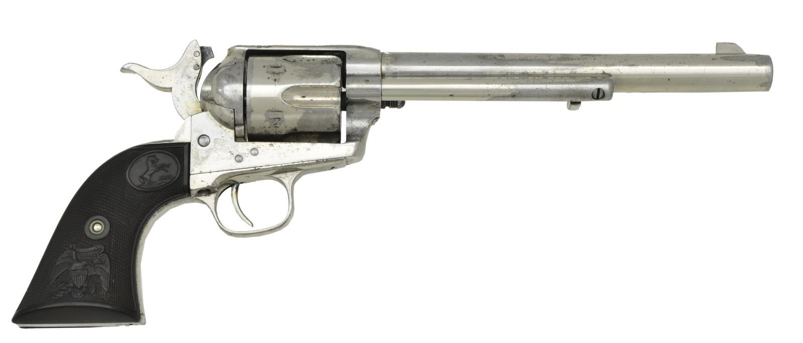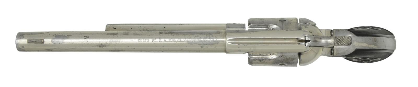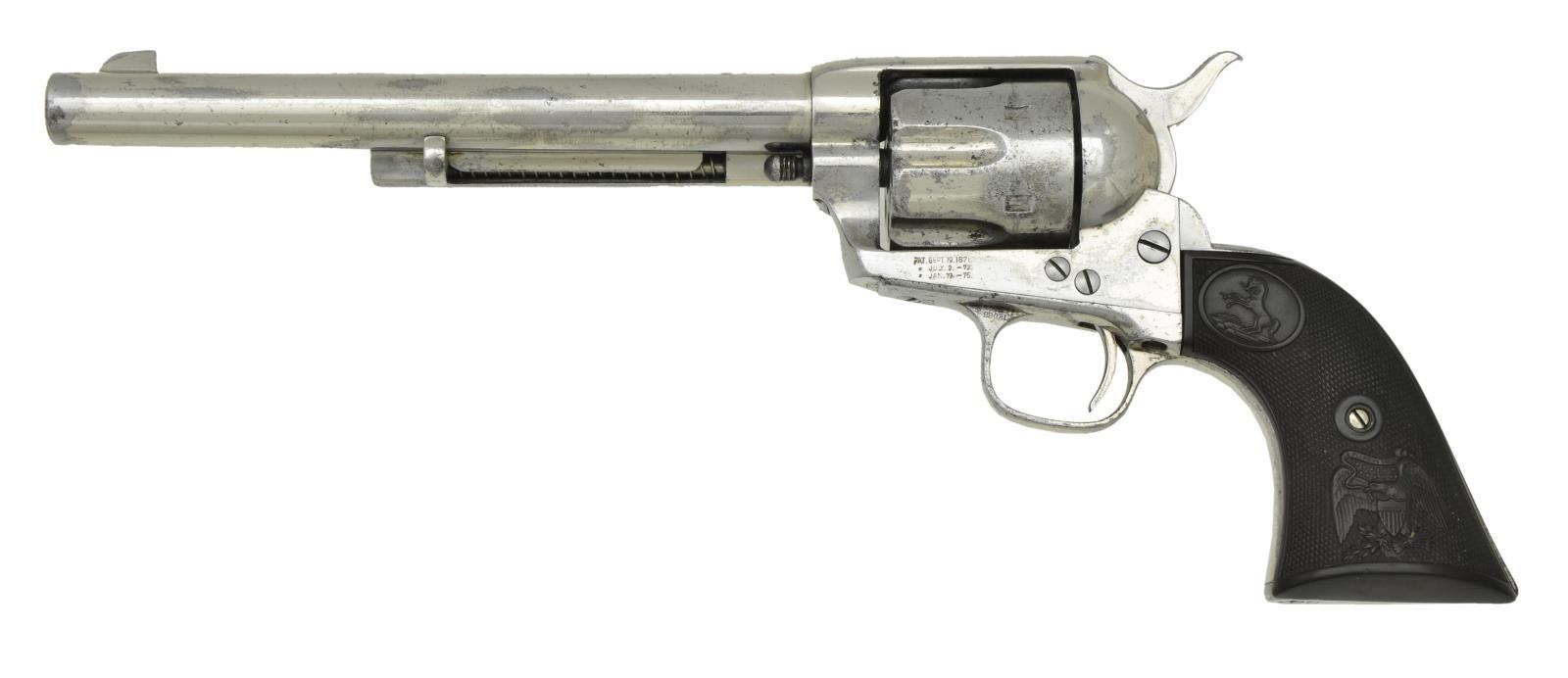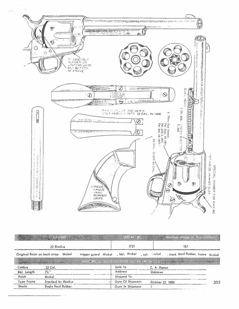 REVOLVER. Cal. 22. S# 1721. Nickel finish with 7 1/2" barrel, slightly altered front sight and 1 line block letter address. Left side of frame has 3 line patent dates & left front web of trigger guard has the caliber marking. Hammer and frame are original rimfire parts with the firing pin secured with two rivets. Mounted with two piece Rampant Colt/Eagle hard rubber grips that are correct style, old replacements. UNATTACHED ACCESSORIES: accompanied by copies of 2 Colt factory letters, both of which identify this revolver in cal. .22 RF with 7 1/2" barrel, blue finish, and rubber stocks, sold & shipped to "C.A. Damon", address unknown on Oct. 22, 1888. One letter shows one gun in the shipment & the other 2 guns. This revolver is pictured and identified by serial number in "The 36 Calibers of the Colt Single Action Army", Brown. Accompanying documentation shows that "Charlie A. Damon" was born 1863 & died 1937, and is buried in Fenton, MI. Another document discloses that Charlie Damon was one of the organizers of the Fenton Historical Society. According to various publications, there were only 107 caliber 22 Single Action revolvers ever made by Colt from left over 44 Rimfire frames. They were in their own S# series with the .44 Rimfire revolvers with a few others made later in another series. CONDITION: good as refinished. Retains about 85% of a renickel finish; the 3 frame screws are modern replacements; grips show light wear; mechanics are fine; worn bore with visible rifling. PROVENANCE: Collection of John Montague. (01-21800 JR/MGM). ANTIQUE. $5,000-8,000.