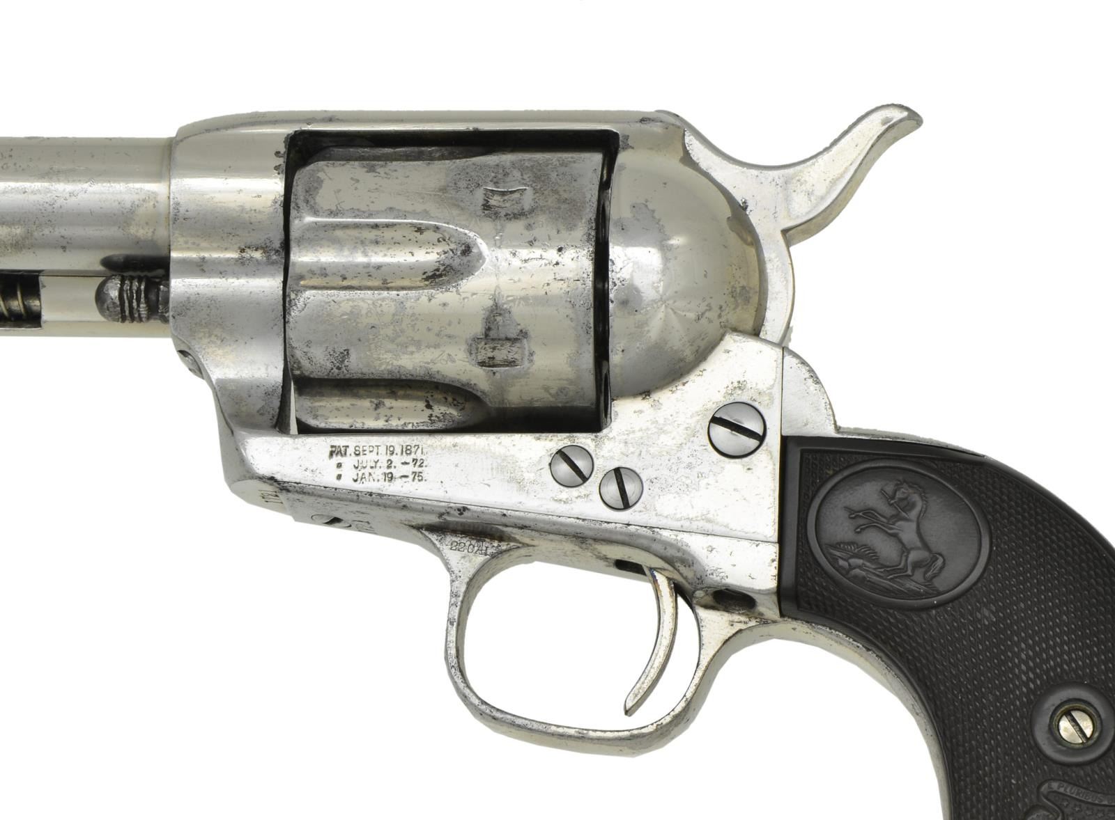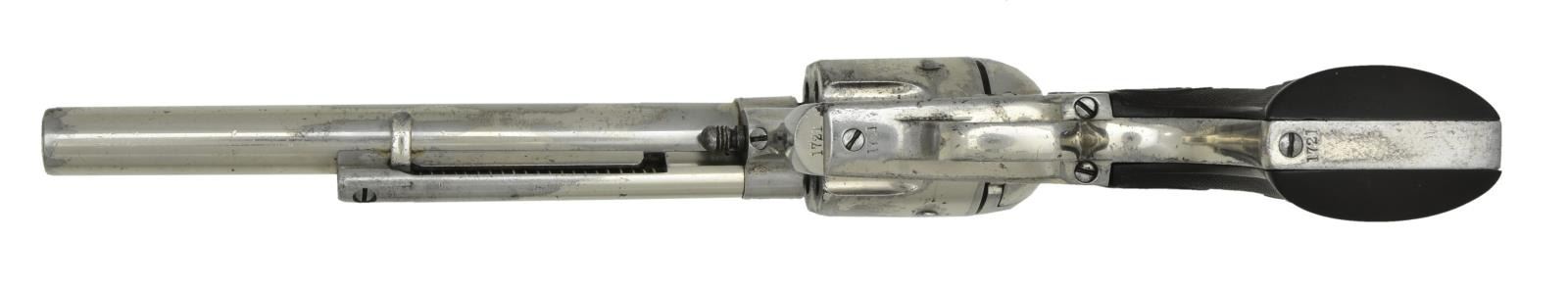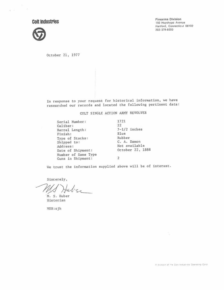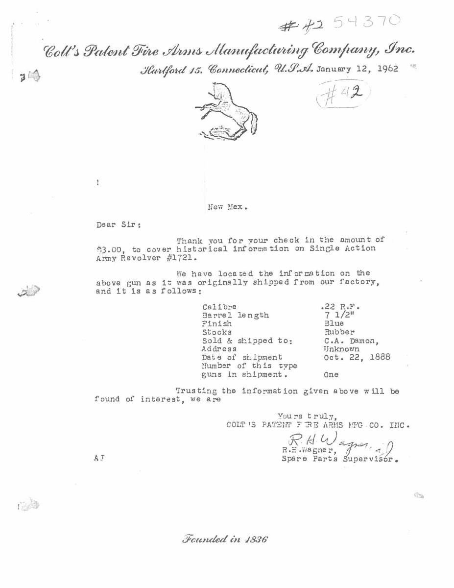 REVOLVER. Cal. 22. S# 1721. Nickel finish with 7 1/2" barrel, slightly altered front sight and 1 line block letter address. Left side of frame has 3 line patent dates & left front web of trigger guard has the caliber marking. Hammer and frame are original rimfire parts with the firing pin secured with two rivets. Mounted with two piece Rampant Colt/Eagle hard rubber grips that are correct style, old replacements. UNATTACHED ACCESSORIES: accompanied by copies of 2 Colt factory letters, both of which identify this revolver in cal. .22 RF with 7 1/2" barrel, blue finish, and rubber stocks, sold & shipped to "C.A. Damon", address unknown on Oct. 22, 1888. One letter shows one gun in the shipment & the other 2 guns. This revolver is pictured and identified by serial number in "The 36 Calibers of the Colt Single Action Army", Brown. Accompanying documentation shows that "Charlie A. Damon" was born 1863 & died 1937, and is buried in Fenton, MI. Another document discloses that Charlie Damon was one of the organizers of the Fenton Historical Society. According to various publications, there were only 107 caliber 22 Single Action revolvers ever made by Colt from left over 44 Rimfire frames. They were in their own S# series with the .44 Rimfire revolvers with a few others made later in another series. CONDITION: good as refinished. Retains about 85% of a renickel finish; the 3 frame screws are modern replacements; grips show light wear; mechanics are fine; worn bore with visible rifling. PROVENANCE: Collection of John Montague. (01-21800 JR/MGM). ANTIQUE. $5,000-8,000.