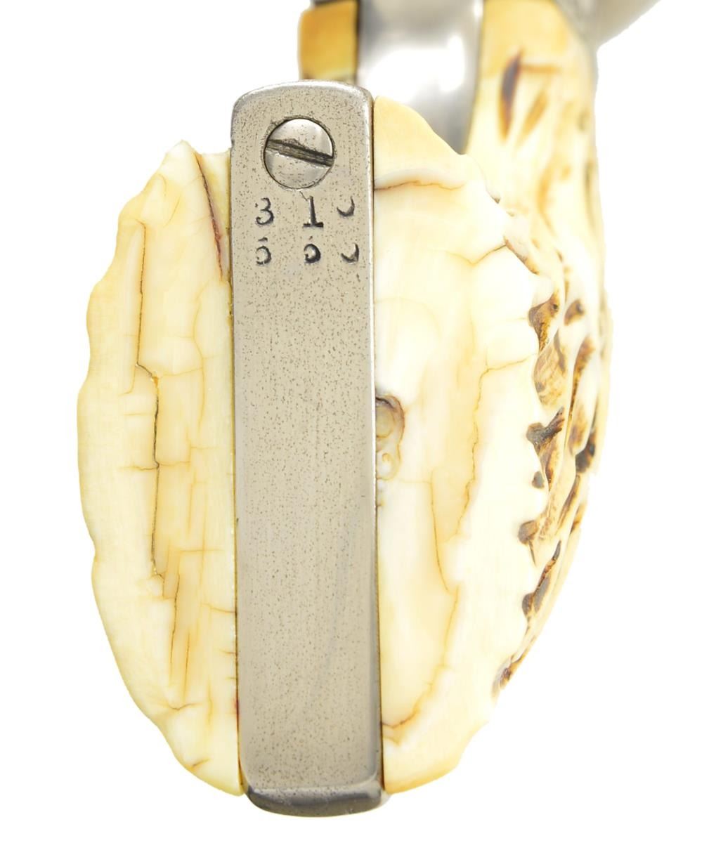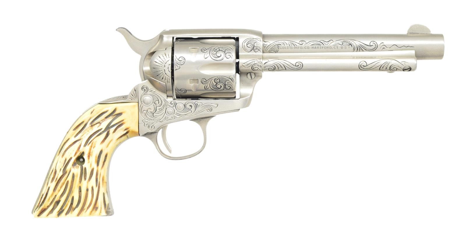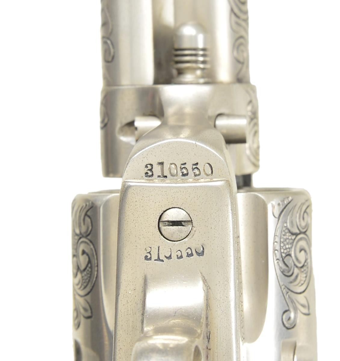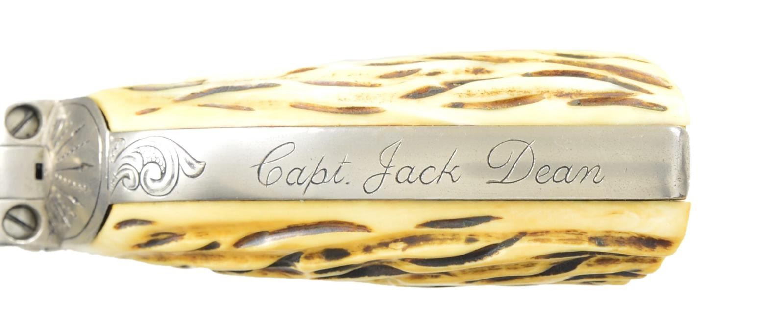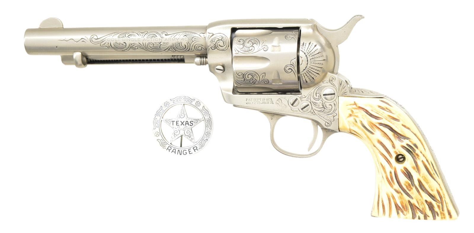 REVOLVER. Cal. 45 Colt. S# 310550. Bbl. 5 ½". First generation Colt carried by Captain Jack Dean, retired, Texas Ranger's Co. D, San Antonio, Texas. Frame, trigger guard, backstrap, cylinder, Bbl., and ejector housing have 50% coverage of vine type foliate engraving with punch dot backgrounds. Backstrap is engraved “Capt. Jack Dean”. Engraving is the work Boerne, Texas engraver Jim Riggs. Frame and grip straps have matching numbers. Custom two-piece stag grips. UNATTACHED ACCESSORIES: Colt Archive Properties letter stating; "Serial Number: 310550/Caliber: .45c/Bbl. Length: 4-3/4”/Finish: Blue/Type of Stocks: Not Listed/Shipped to: Winchester Repeating Arms Company/Address: New Haven, Connecticut/Date of Shipment: August 23, 1909/Number of Same Type Guns in Shipment: 6”. Letter from the Texas Department of Public Safety verifying that the revolver belonged to and was used by Capt. Jack Dean during his tenure as a law enforcement officer in the state of Texas. Second letter is hand written note signed by Jack Dean with a copy of his business card corroborating the revolver was used by him. Also included in the lot is a modern reproduction Texas Ranger badge and an autographed photograph of Capt. Jack Dean. CONDITION: near excellent as refurbished retaining virtually all satin nickel refinish. Very good grips. Sound action. Bore retains strong rifling. (22 – 5872/DS) CURIO. $5000 – 8000.