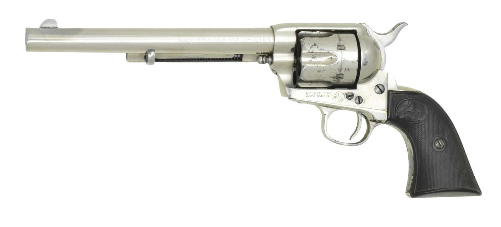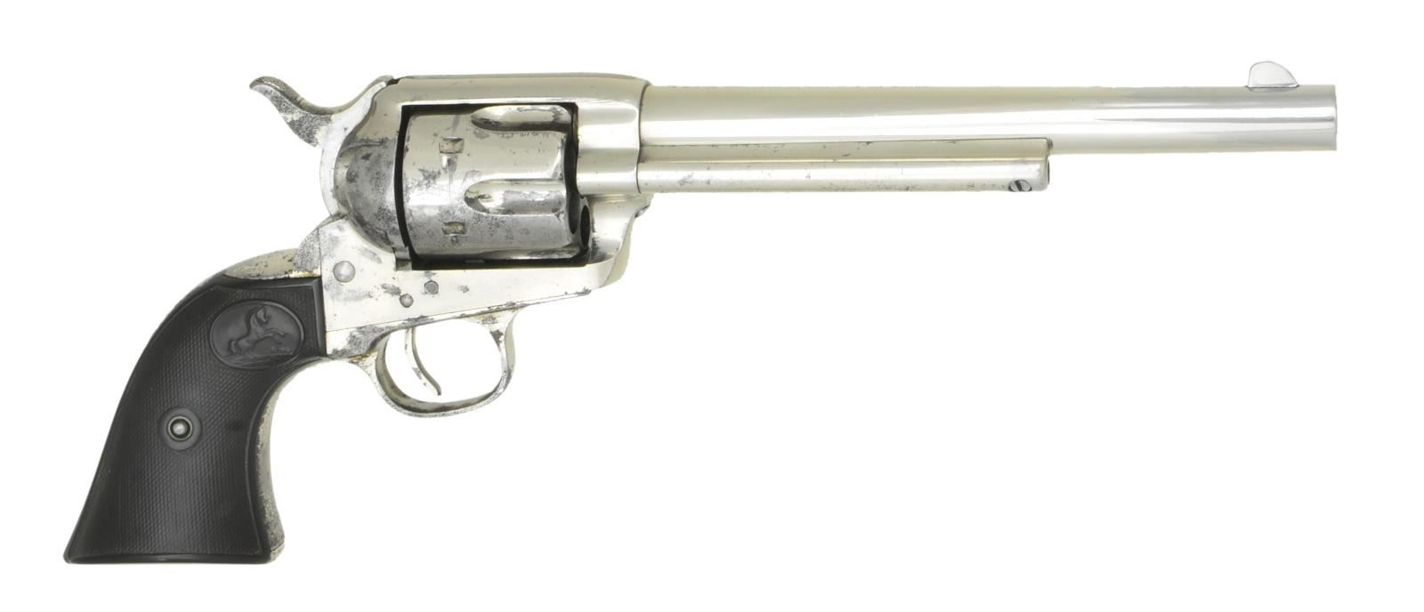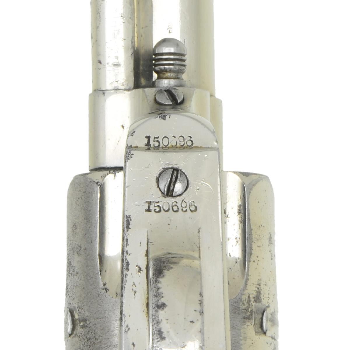 Cal. 44-40. S# 150696. Bbl. 7 1/2". Six shot fluted cylinder. Full nickel finish. Two piece checkered hard rubber rampant Colt grips. 1893 mfg. CONDITION: over 90% original nickel finish showing spots of wear and finish loss with scattered light pitting and small dents. Grips have moderately worn checkering. Cylinder does not properly lock when hammer is cocked slow. Bore retains sound rifling showing scattered light pitting. (01-22032/DS). ANTIQUE. $4,500-6,500.
