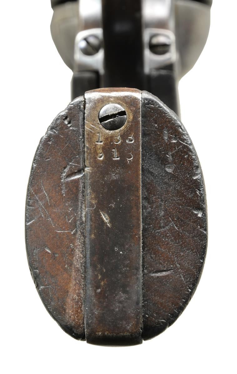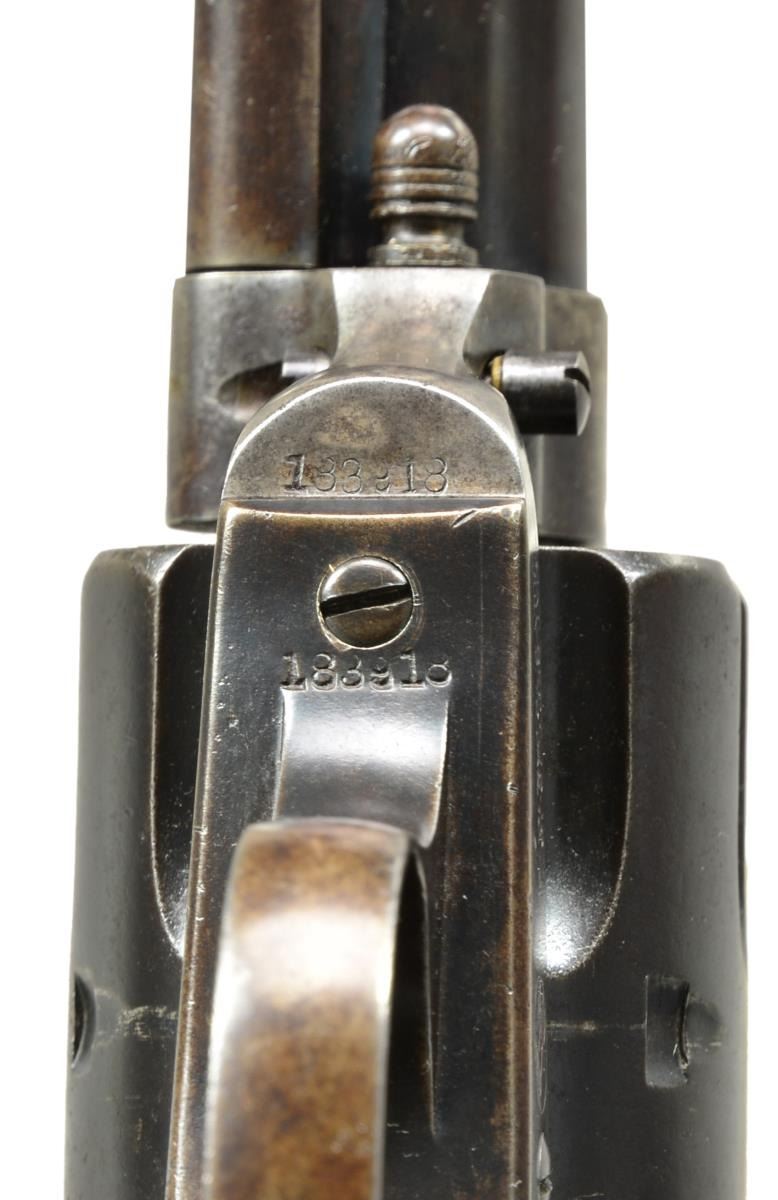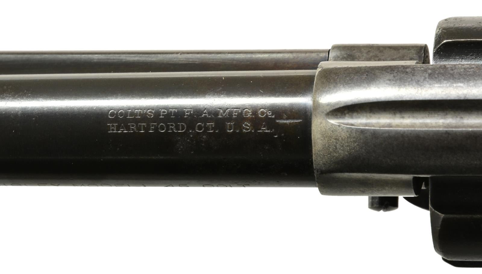 Cal. 45 Colt. S# 183918. Bbl. 4 3/4". 6 Shot fluted cyl. Rare factory checkered trigger. Blue finish w/ case colored frame. 2 Piece walnut grips. Mfg. 1899. UNATTACHED ACCESSORIES: Colt factory letter listing cal. as 44 Colt (44/c). CONDITION: bbl., cyl. & grip strap finish is fading to a brown patina showing sm. dents & spots of light pitting w/ deep cyl. drag line. Action finish has faded to mottled gray brown showing spots of light pitting. Grips have worn finish showing scattered dents & handling marks. Good mechanics. Bore retains lightly worn rifling. (20-1750). CURIO. $2,250-3,500.