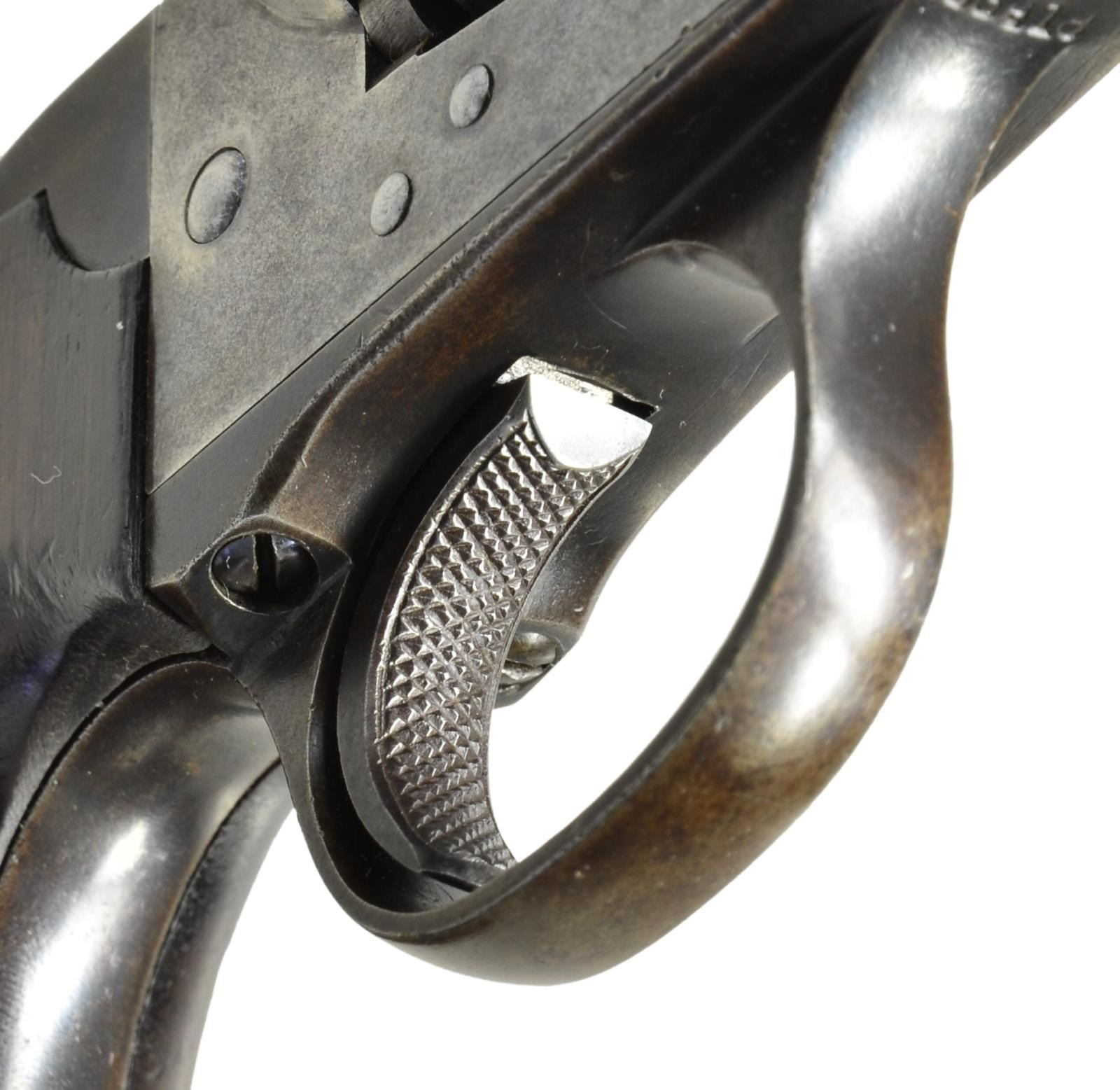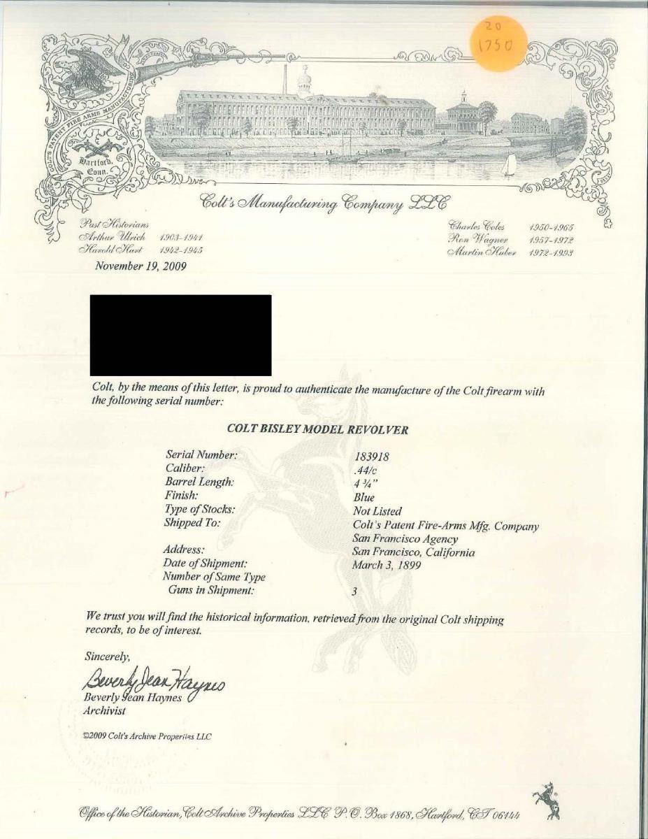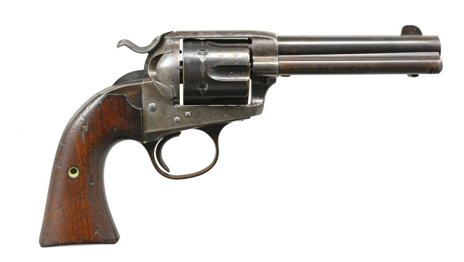 Cal. 45 Colt. S# 183918. Bbl. 4 3/4". 6 Shot fluted cyl. Rare factory checkered trigger. Blue finish w/ case colored frame. 2 Piece walnut grips. Mfg. 1899. UNATTACHED ACCESSORIES: Colt factory letter listing cal. as 44 Colt (44/c). CONDITION: bbl., cyl. & grip strap finish is fading to a brown patina showing sm. dents & spots of light pitting w/ deep cyl. drag line. Action finish has faded to mottled gray brown showing spots of light pitting. Grips have worn finish showing scattered dents & handling marks. Good mechanics. Bore retains lightly worn rifling. (20-1750). CURIO. $2,250-3,500.