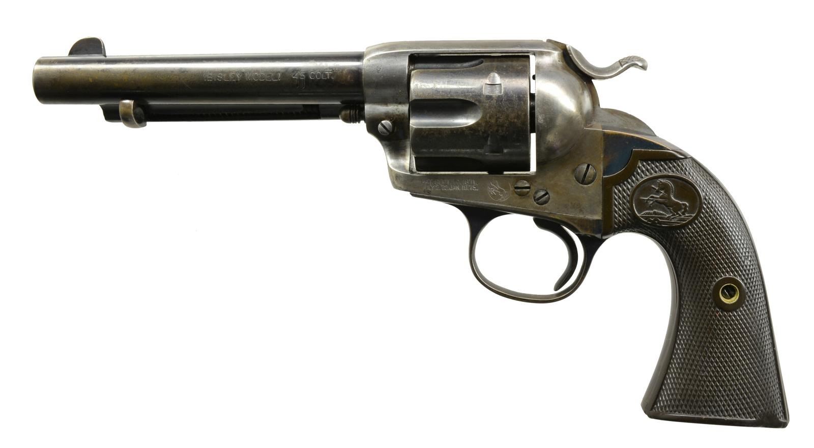 Cal. 45 Colt. S# 219866. Bbl. 5 1/2" w/ blade front sight. Left side is marked "(BISLEY MODEL)". 6 Shot fluted cyl. Bbl., ejector housing, cyl., grip straps & trigger have blue finish. Case colored frame & hammer. 2 Piece checkered hard rubber Rampant Colt grips. 1901 Mfg. CONDITION: bbl., cyl. & grip straps retain 70% dull blue fading to brown & showing spots of light corrosion. Frame is fading to silver/gray w/ spots of light corrosion & retains sm. amounts of case colors in protected areas. Hammer has good case colors on protected areas of its sides. Grips show light checkering wear w/ handling marks & chip at butt. Bore retains worn rifling & shows general very light pitting. (20-1751). CURIO. $2,250-3,500.