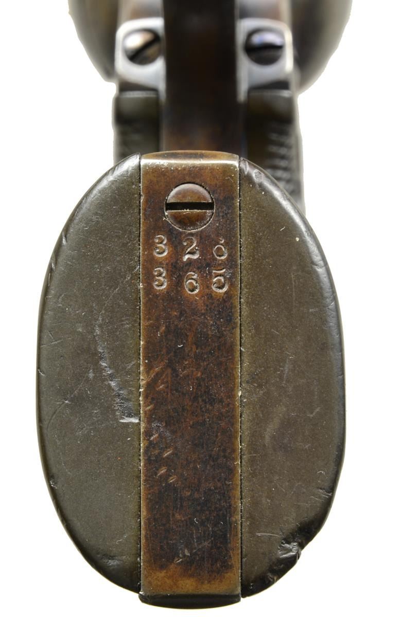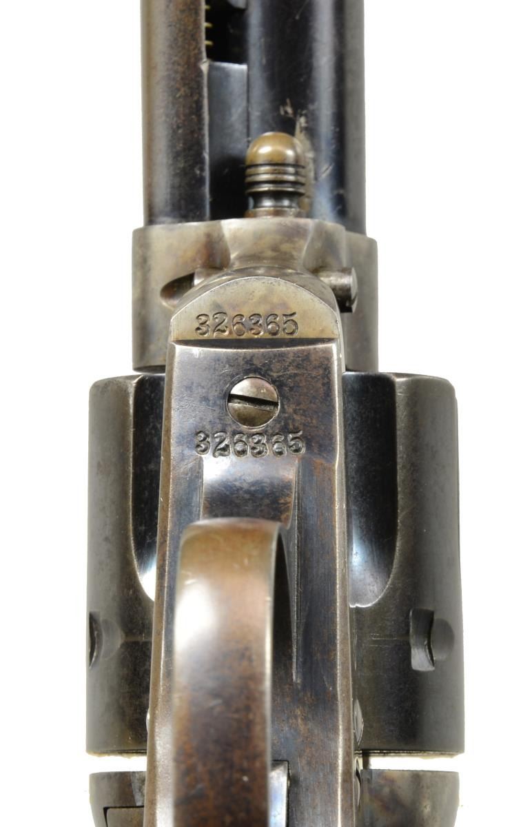 Cal. 41 Colt. 1 of only 3159 produced in this cal. S# 326365. Bbl. 4 3/4" w/ blade front sight. Left side marked "(BISLEY MODEL)". 6 Shot fluted cyl. Blue finish w/ case colored frame & hammer. 2 Piece checkered hard rubber Rampant Colt grips. 1913 Mfg. UNATTACHED ACCESSORIES: Colt Factory Letter. CONDITION: 40% dull blue fading to brown showing spots of corrosion. Frame & hammer are fading to a mottled gray w/ 25% lightly fading case colors. Grips have worn checkering w/ handling marks & sm. chips at butt. Bore retains sound rifling showing scattered pitting. (20-1756). CURIO. $2,250-3,000.