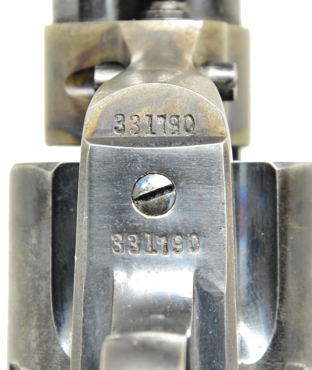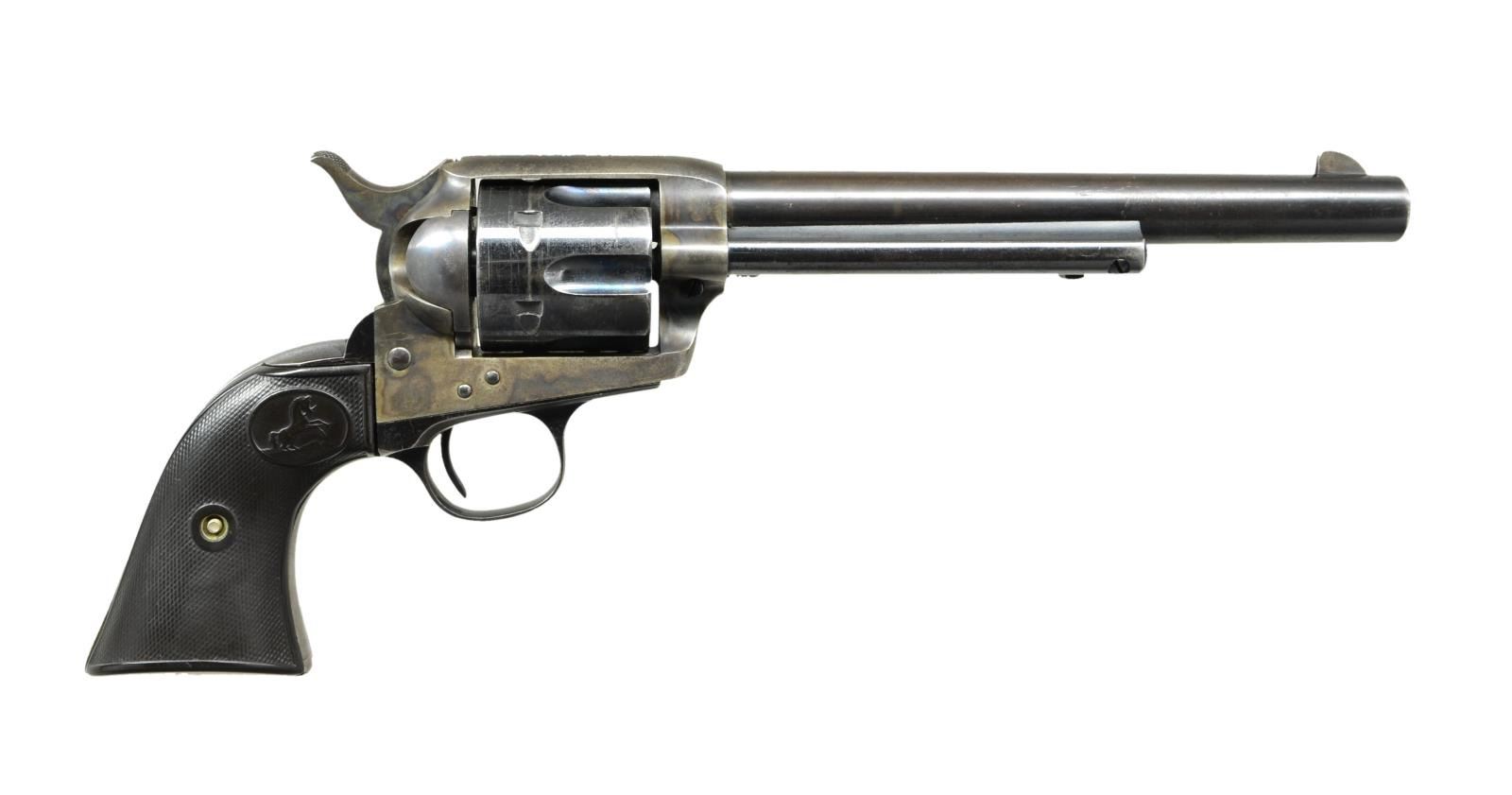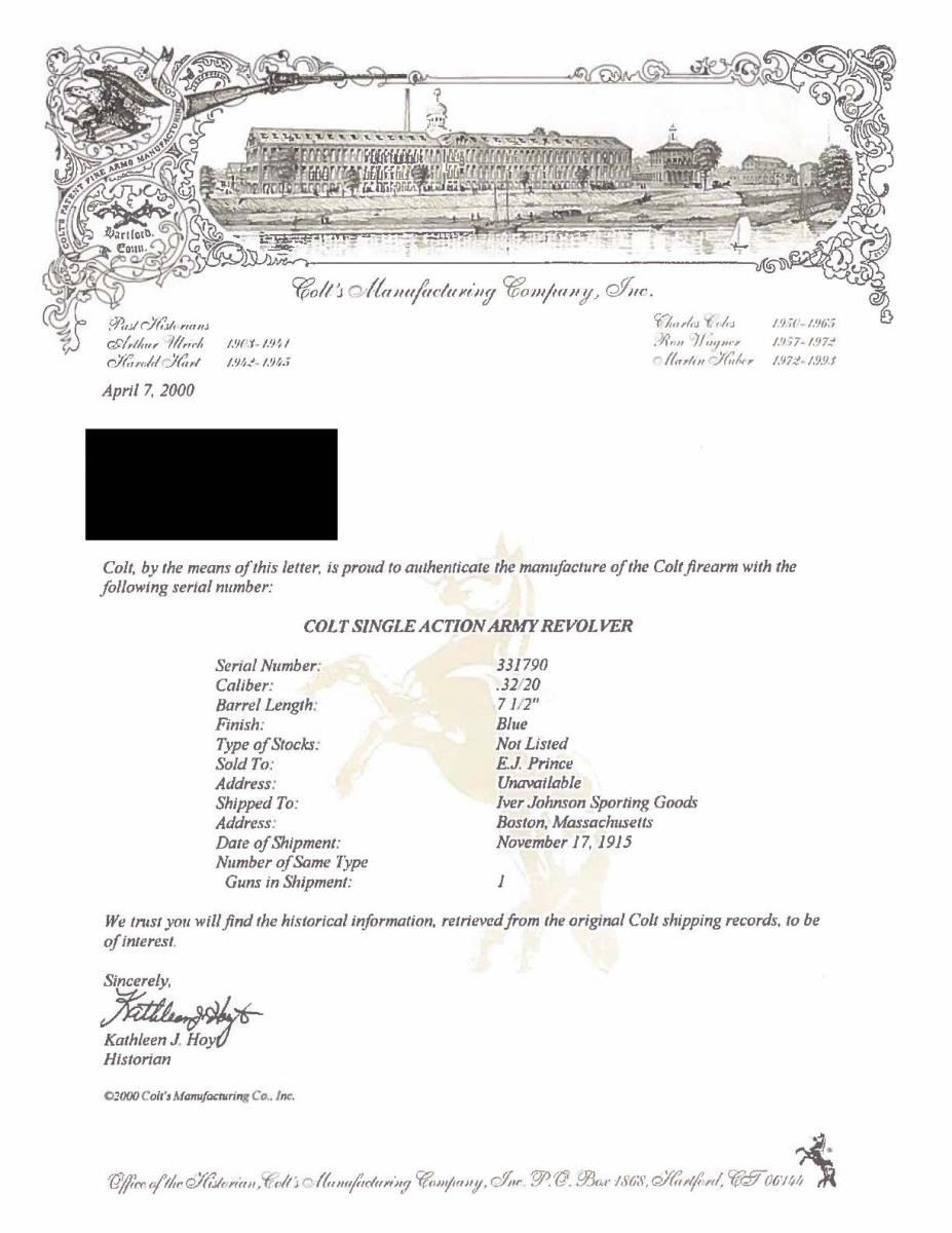 Cal 32 W.C.F. S# 331790. Bbl. 7 1/2". Six shot fluted cylinder. Blue finish with case colored frame. Two piece checkered hard rubber rampant Colt grips. UNATTACHED ACCESSORIES: Colt Manufacturing Company letter listing the following information: “COLT SINGLE ACTION ARMY REVOLVER, Serial Number: 331790, Caliber: .32/20. Bbl. Length: 7 1/2", Finish: Blue, Type of Stocks: Not Listed, Sold To: E. J. Prince, Address: Unavailable, Shipped To: Iver Johnson Sporting Goods, Address: Boston, Massachusetts, Date of Shipment: November 17, 1915, Number of Same Type Guns in Shipment: 1,” CONDITION: frame and hammer retain over 60% dull fading case colors. Bbl., cylinder and grip straps have over 50% dull thinning blue with heavy dragline on cylinder. Grips have moderately worn checkering. Sound action. Bore has lightly worn rifling. (22-3073/DS). CURIO. $2,250-3,000.