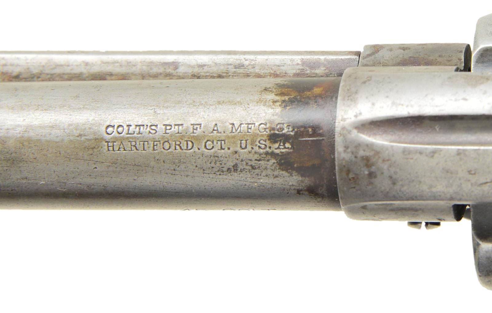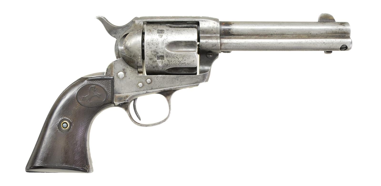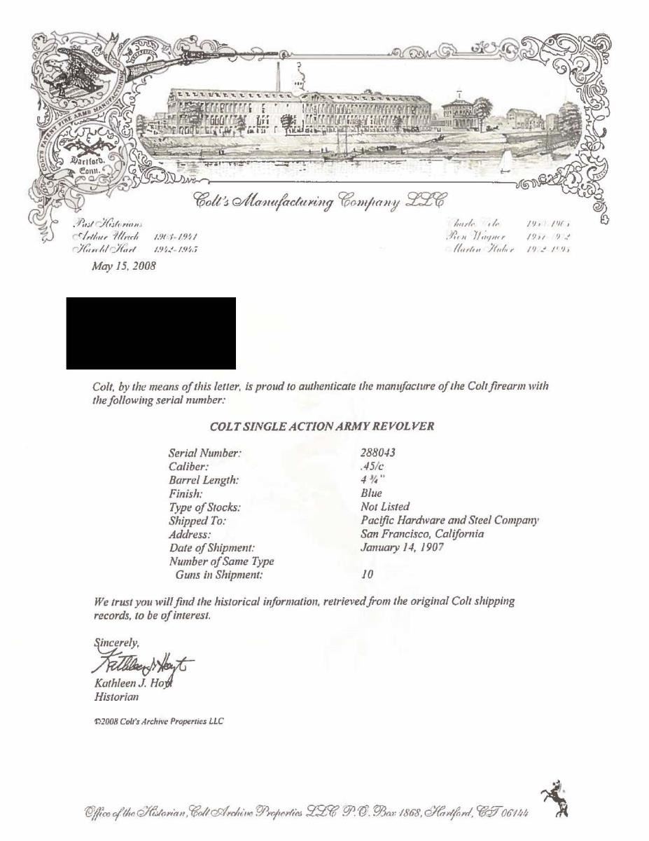 Cal. 45 Colt. S# 288043. Bbl. 4-3/4" Six shot fluted cyl. Blue & case colored finish. Two piece checkered hard rubber rampant colt grips. UNATACCHED ACCESSORIES: Colt Mfg. Co. letter stating: Serial Number: 288043 / Caliber: .45/c / Barrel Length: 4 3/4" / Finish: Blue / Type of Stocks: Not Listed / Shipped To: Pacific Hardware and Steel Company / San Francisco, California / Date of Shipment: January 14, 1907 / Number of Same Type Guns in Shipment: 10. CONDITION: Metal has faded to gray showing scattered dark spotting. Grips are worn with small chips at toe, right panel is cracked along front grip strap. Cyl timing is very slightly slow. Bore retains sound rifling showing scattered pitting. (22-2863/DS). CURIO. $1800-2400.