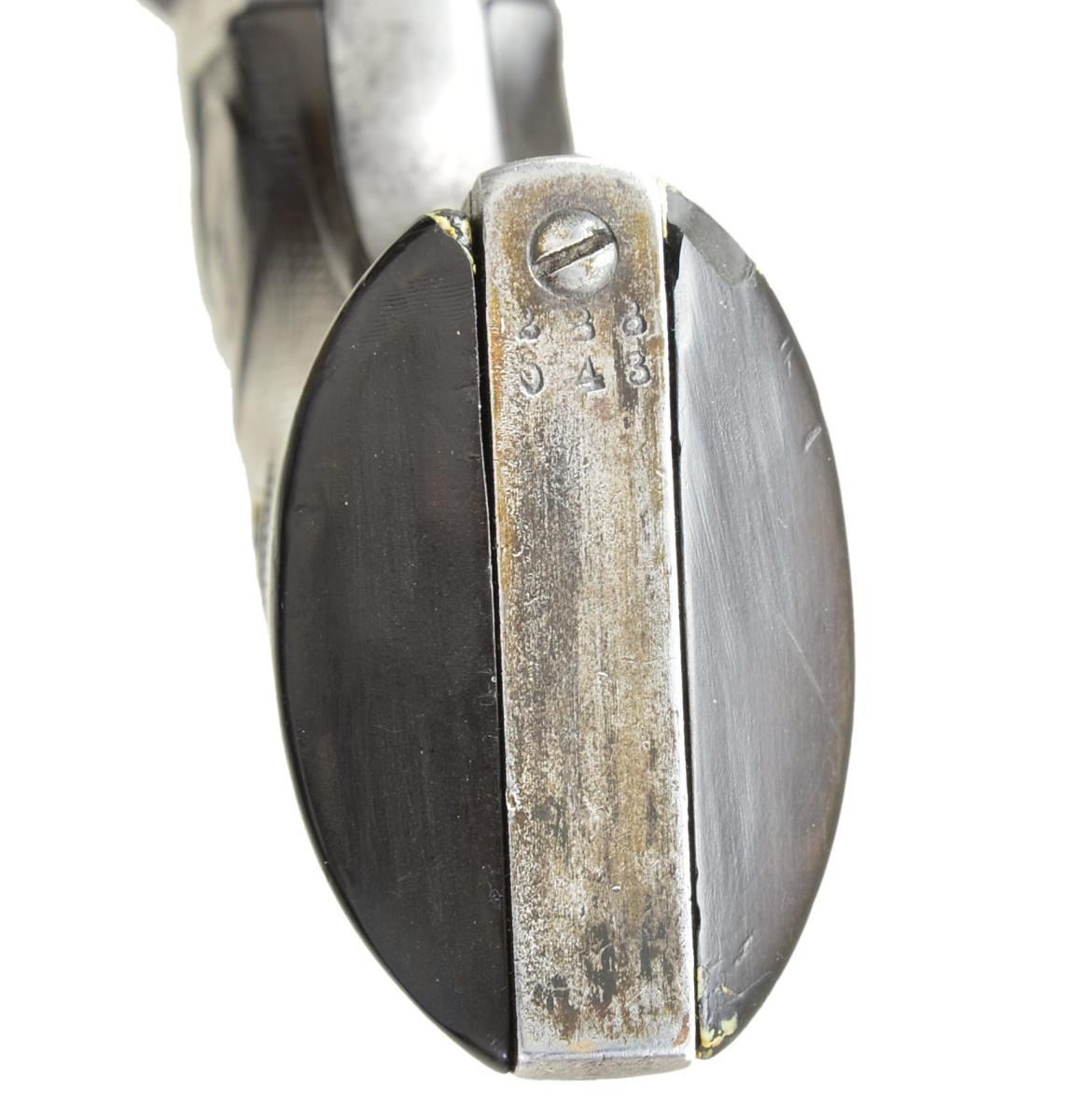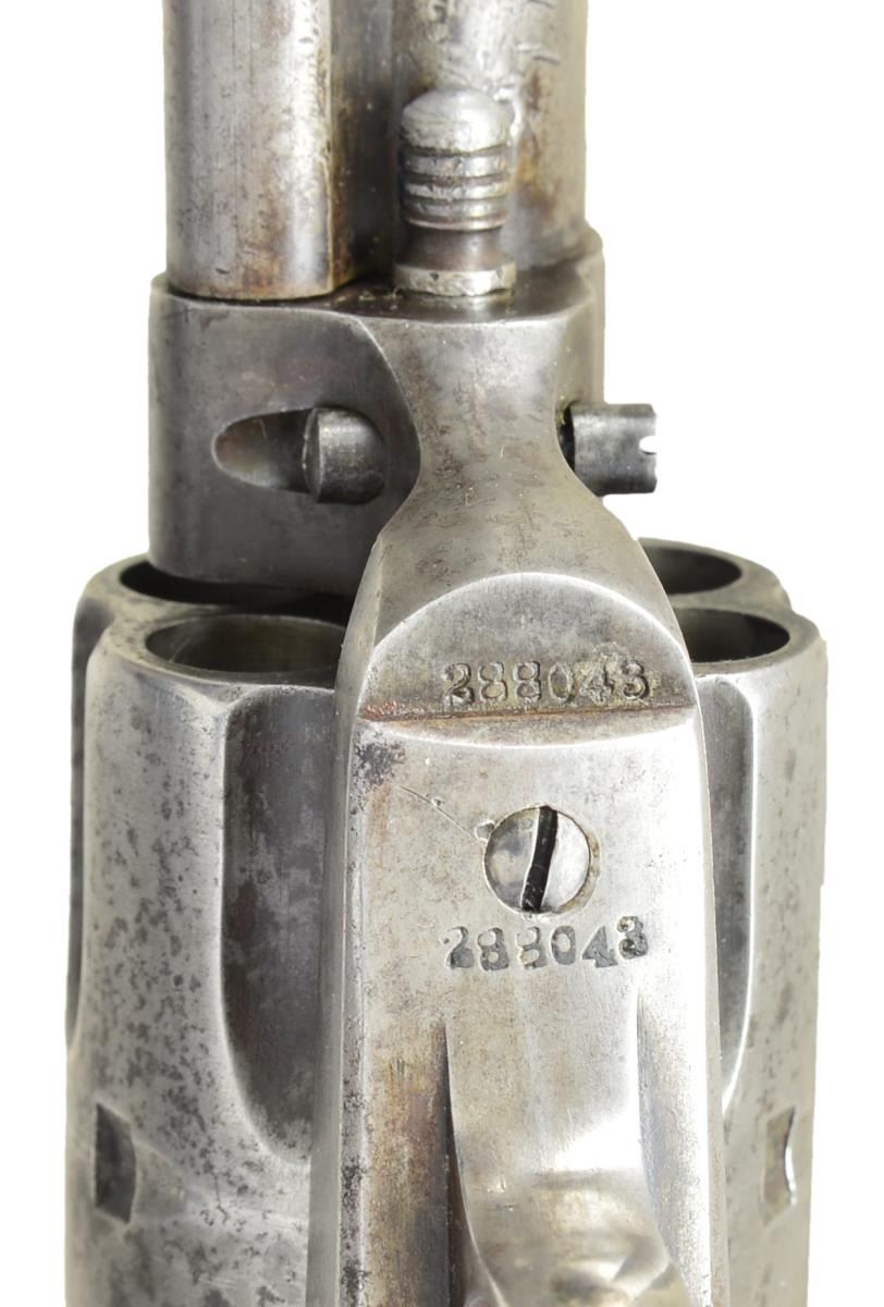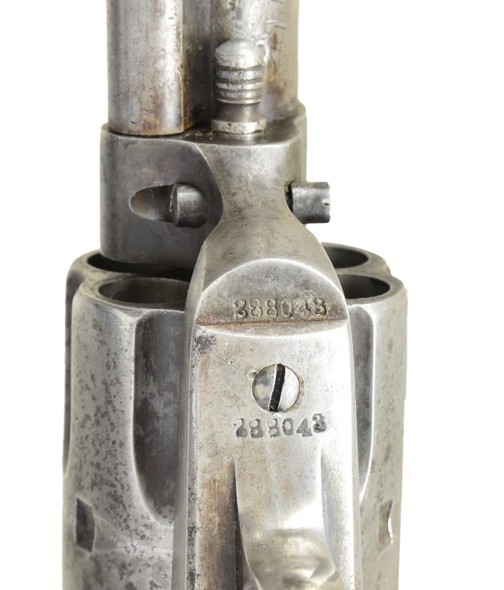 Cal. 45 Colt. S# 288043. Bbl. 4-3/4" Six shot fluted cyl. Blue & case colored finish. Two piece checkered hard rubber rampant colt grips. UNATACCHED ACCESSORIES: Colt Mfg. Co. letter stating: Serial Number: 288043 / Caliber: .45/c / Barrel Length: 4 3/4" / Finish: Blue / Type of Stocks: Not Listed / Shipped To: Pacific Hardware and Steel Company / San Francisco, California / Date of Shipment: January 14, 1907 / Number of Same Type Guns in Shipment: 10. CONDITION: Metal has faded to gray showing scattered dark spotting. Grips are worn with small chips at toe, right panel is cracked along front grip strap. Cyl timing is very slightly slow. Bore retains sound rifling showing scattered pitting. (22-2863/DS). CURIO. $1800-2400.