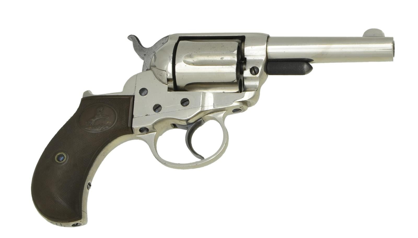 Cal. 38 Colt. S# 18081. Bbl. 3 1/2" w/ etched panel cal. marking. Semi circular front sight. Six shot long fluted cyl. Full nickel finish. Trigger & hammer are fire blued, hammer sides are bright. Checkered hard rubber rampant colt round butt grips. UNATTACHED ACCESSORIES: Colt Archive Properties LLC letter stating the following; “COLT DOUBLE ACTION REVOLVER MODEL OF 1877”, “Serial Number: 18081”, “Caliber: .38/c”, “Barrel Length: 3 1/2", “Finish: Nickel”, “Type of Stocks: Rubber”, “Shipped To: H & D Folsom Arms Company”, “Address: New York, New York”, “Date of Shipment: June 4, 1879” & “Number of Same Type Guns in Shipment: 95”. CONDITION: very fine. Retaining over 95% original nickel finish. Etched panel cal. marking is clear & sharp. Grips show light wear at high points. Butt of gun has a black marker added ID number that can likely be easily removed. Cyl. exhibits some side play & can be rotated when hammer is in full cock position. Bore is bright w/ sound rifling. (01-22983/DS). ANTIQUE. $1,000-1,500.