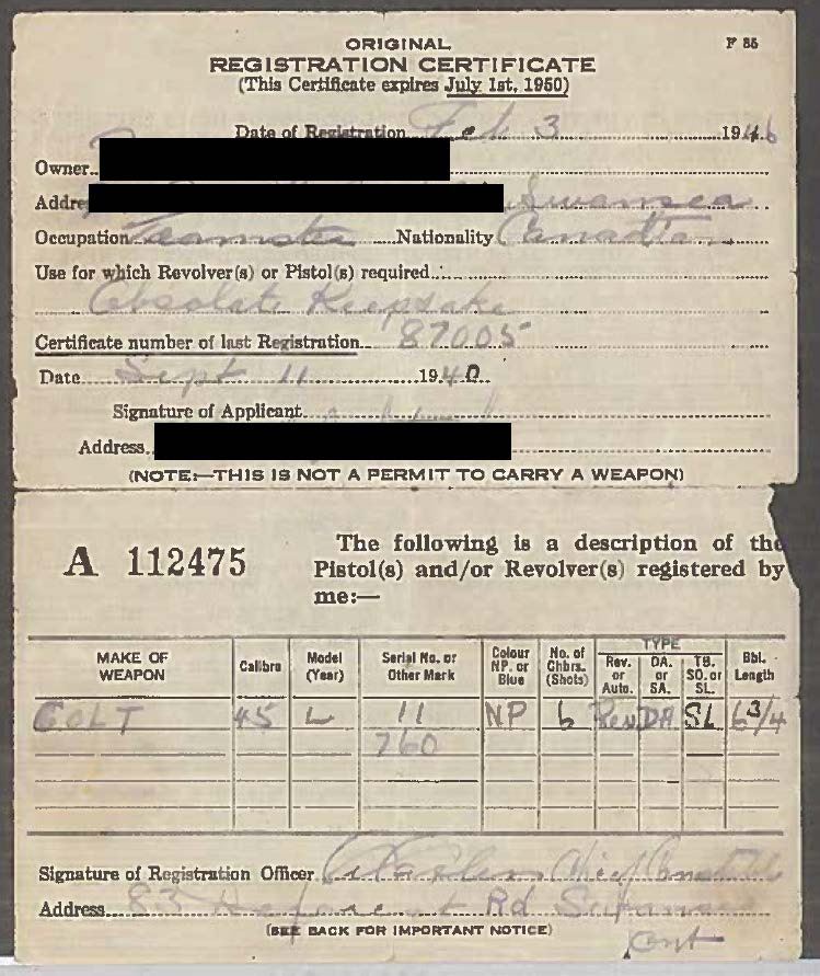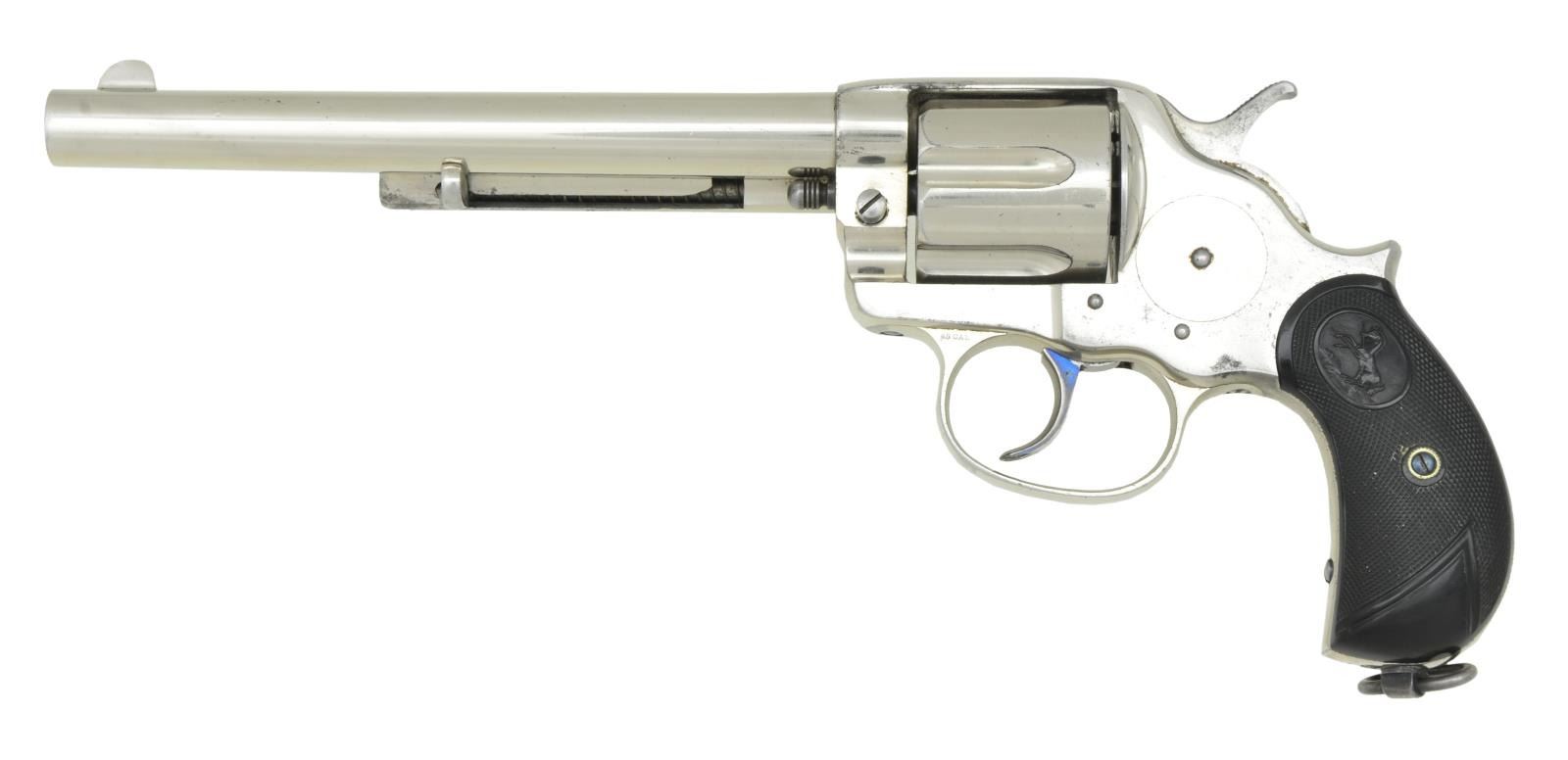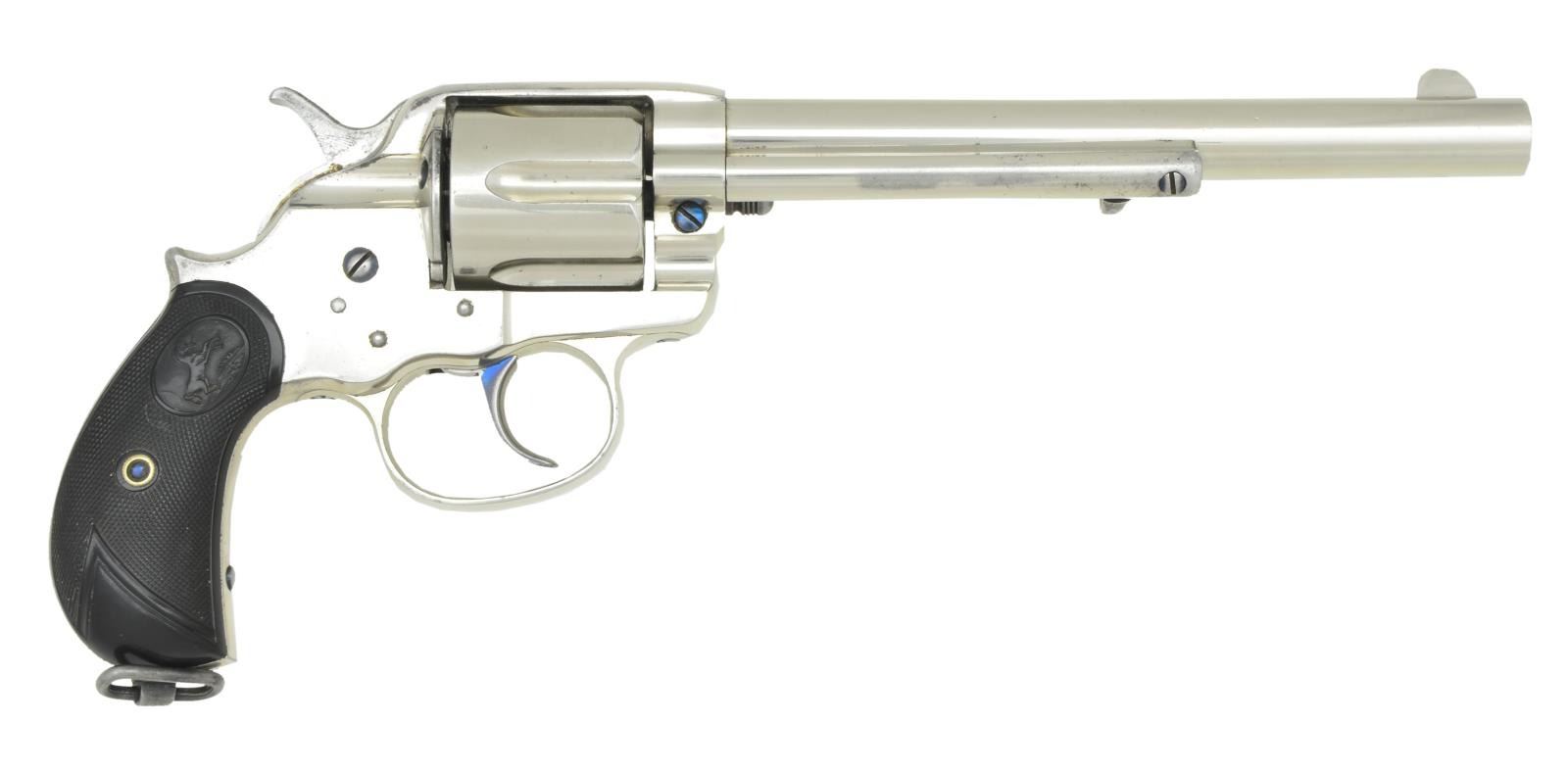 REVOLVER. Cal. 45 Colt. S# 11760. Bbl. 7 1/2" w/ blade sight. Six shot long flute cyl. Full nickel finished w/ fire blue hammer & trigger. 2 piece checkered hard rubber rampant colt round butt grips w/ lanyard ring at butt. Mfg. 1883. UNATTACHED ACCESSORIES: Colt firearms letting listing the following information: "COLT MODEL 1878 DOUBLE ACTION REVOLVER", "Serial Number: 11760", "Caliber: .45/c", "Barrel Length: 7 1/2", "Finish: Blue", "Type of Stocks: Not listed", "Shipped To: Hartley & Graham", "Address: New York, New York", "Date of Shipment: October 27, 1883" & "Number of Same Guns in Shipment: 40". Black ring binder w/ a large volume of information about the revolver from the Canadian National Archives. Registration certificates, military records & Canadian war history as well as photos. A chain of custody for the revolver is detailed starting w/ Colt to Hartley & Graham to the Canadian government to three subsequent owners to the consignor. A copy of the gun report volume 43, no. 1 June 1997 is included w/ an article starting on page 31 about the Canadian Militia & Defense colt 1878 revolvers. This revolver & its holster are pictured in the article. Leather flap holster & belt w/ brass hook. Inside flap has hand-written marking "P. V. C. Tice" & stamped name "A. Laurie". Belt & holster are in fair to good condition. SPECIAL NOTE: This revolver was issued in two historical Canadian wars; A) The North West Rebellion (Canada’s Indian War of 1885). B) The 1899-1902 South African War. This was the first time in history that Canada dispatched troops to an overseas war. The names on the holster as well as the last registered owner were all in the same unit in South Africa. CONDITION: very fine as is the finest condition gun known to have taken part in both wars, along with the original holster & belt. Retaining over 95% nickel finish showing carry wear on backstrap & small spots. Grips show light wear. Sound mechanics. Bore retains strong rifling. (01-22034/DS). ANTIQUE. $4,500-6,000.