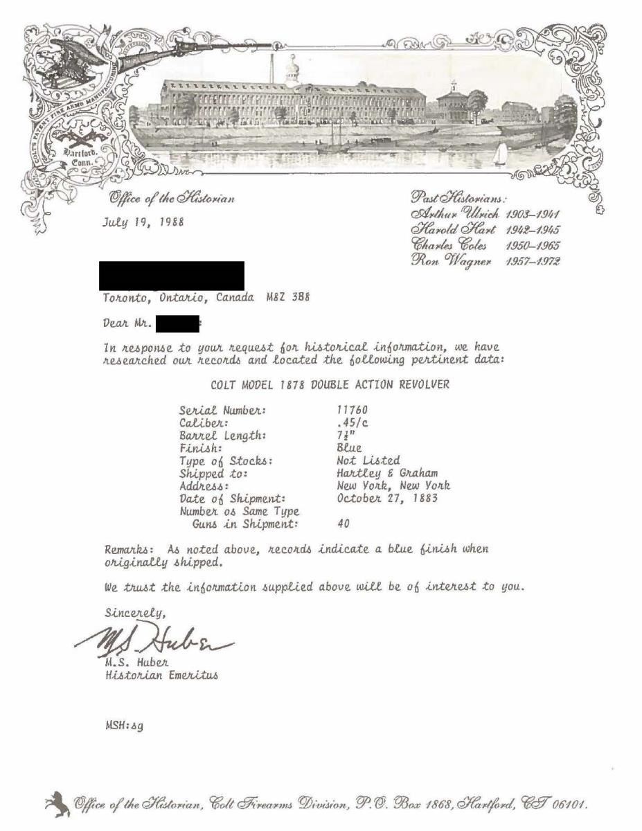 Lot 4226 COLT 1878 FRONTIER CANADIAN MILITARY DOCUMENTED DA