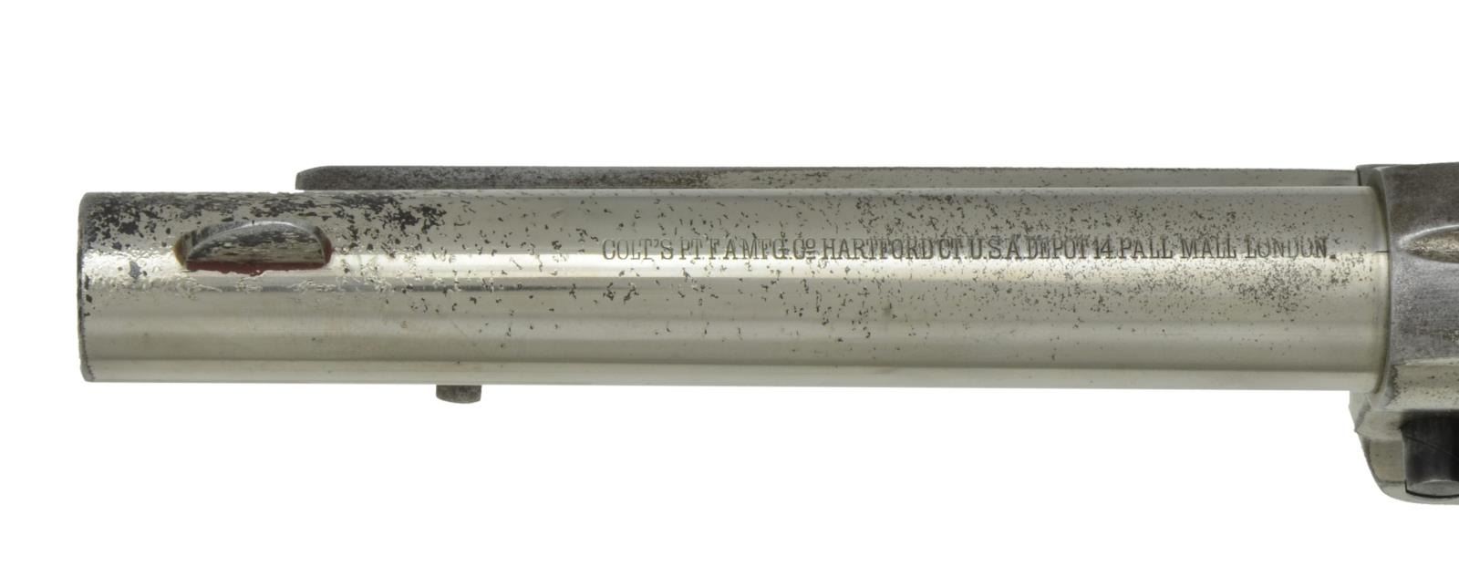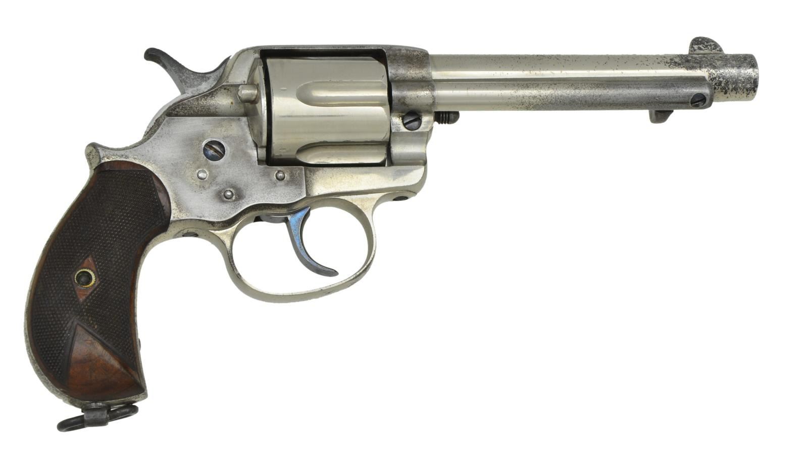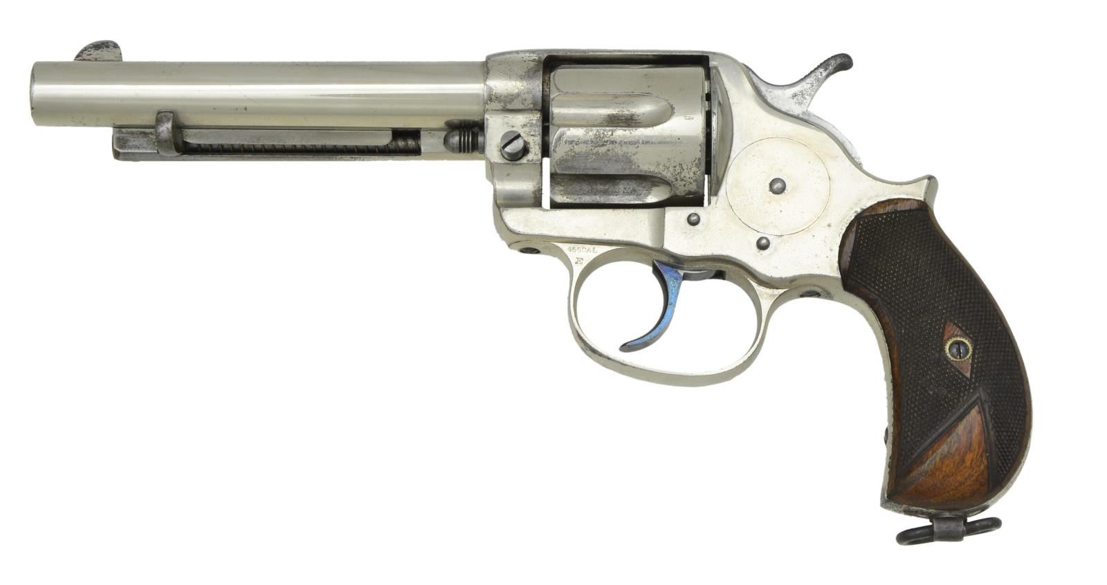 Cal. 455 Eley. S# 10576. Bbl. 5 1/2" w/ “HARTFORD, CT, U.S.A. & DEPOT 14, PALL MALL, LONDON” markings. Six shot long flute cyl. Full nickel finished w/ fire blue trigger & hammer having polished sides. Checkered walnut 2 piece round butt grips w/ lanyard ring at butt. Total production 51,210 mfg. 1878-1905. S#s under 41,000 were produced prior to December 31st, 1898. CONDITION: over 75% nickel finish showing spots of flaking, finish loss & blistering w/ scattered very light pitting. Grips show light wear. Sound action. Bore retains strong rifling. PROVENANCE: From the Lifelong Collection of Glen E. Mattox. (01-22374/DS). ANTIQUE. $3,000-4,000.