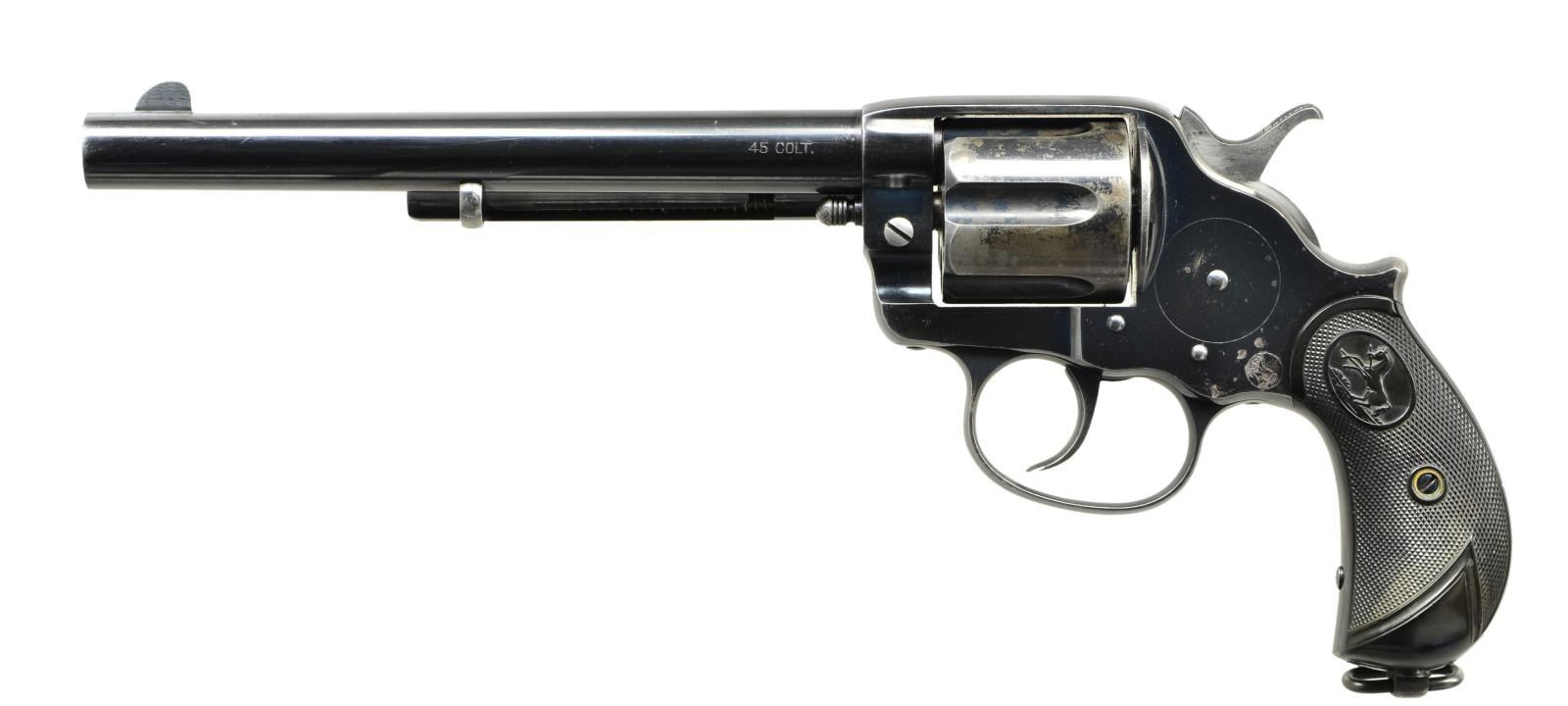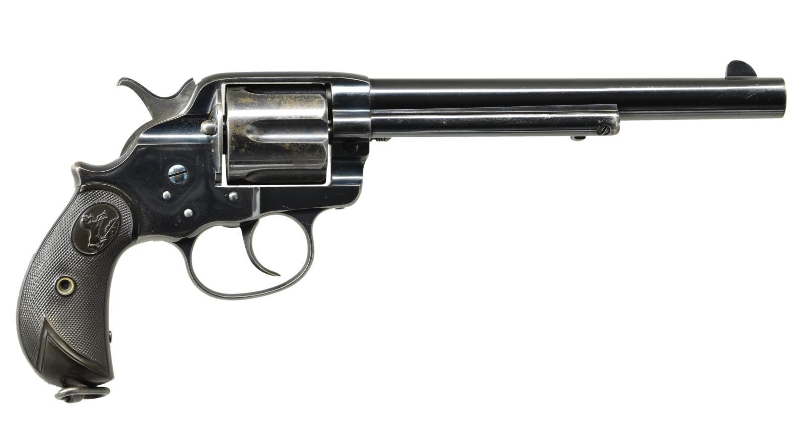 Cal. 45 Colt. S# 27428. Bbl. 7 1/2". Six shot long flute cylinder. Full blue finish with polished hammer sides. Lanyard ring at butt. Two-piece checkered hard rubber rampant Colt grips. UNATTACHED ACCESSORIES: Colt Archives Properties letter listing the following information: “COLT DOUBLE ACTION REVOLVER MODEL OF 1878, Serial Number: 27428, Caliber: .45/C, Bbl. Length: 7 1/2", Finish: Blue, Type of Stocks: Not Listed, Shipped To: Hibbard, Spencer, Bartlett & Company, Address: Chicago, Illinois, Date of Shipment, February 27, 1891, Number of Same Type Guns in Shipment: 5”. CONDITION: over 75% lightly worn original blue showing edge and carry wear with areas of flaking on cylinder. Good grips show small marks. Functioning action, cylinder exhibits some side play. Bore retains lightly worn rifling. (01-22031/DS). ANTIQUE. $3,000-3,900.