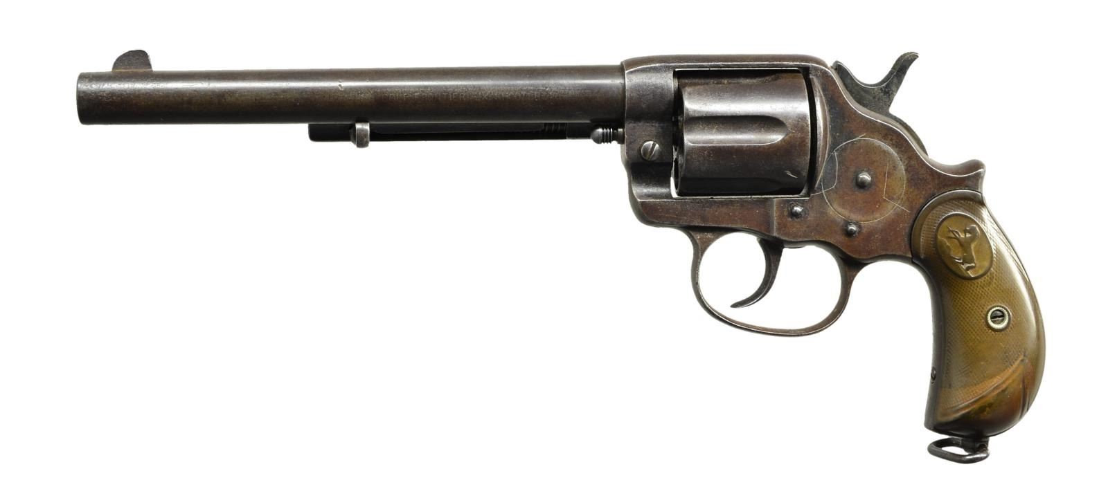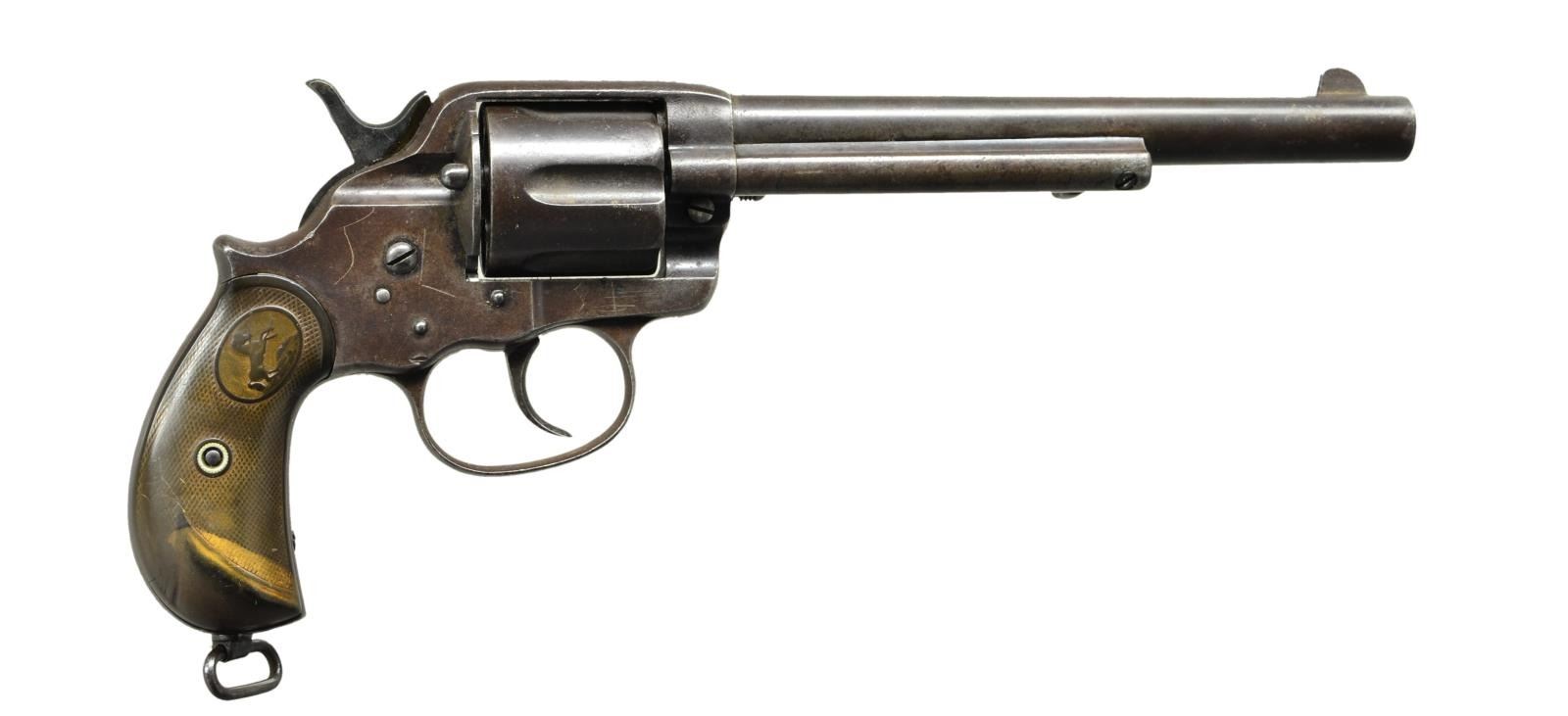Cal. 44-40. S# 19723. Bbl. 7-1/2’’ w/ blade sight. Etched panel cal. marking. Six shot long flute cyl. Blue finish. 2 piece checkered hard rubber rampant colt grips w/ lanyard loop at butt. Mfg. 1887. CONDITION: metal is fading to even brown patina showing scattered spots of light pitting & scratches. Grips show heavy wear & discoloration. Sound action, cyl. has a small amount of play. Bore has a dark frosted appearance w/ worn rifling. (01-22141/DS). ANTIQUE. $1,000-1,500.