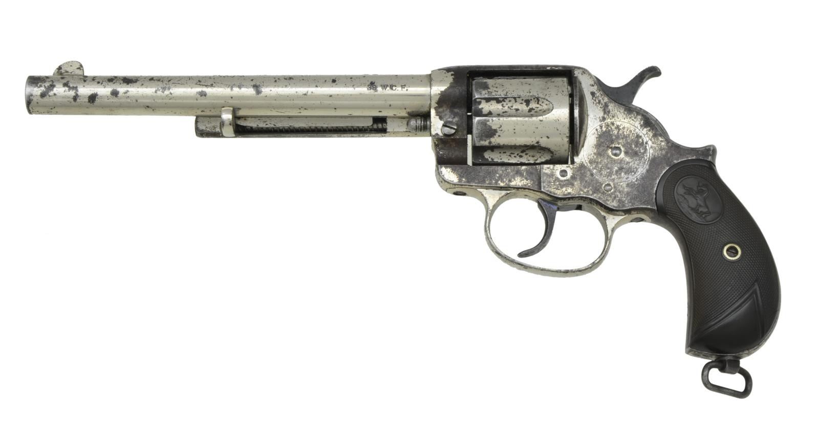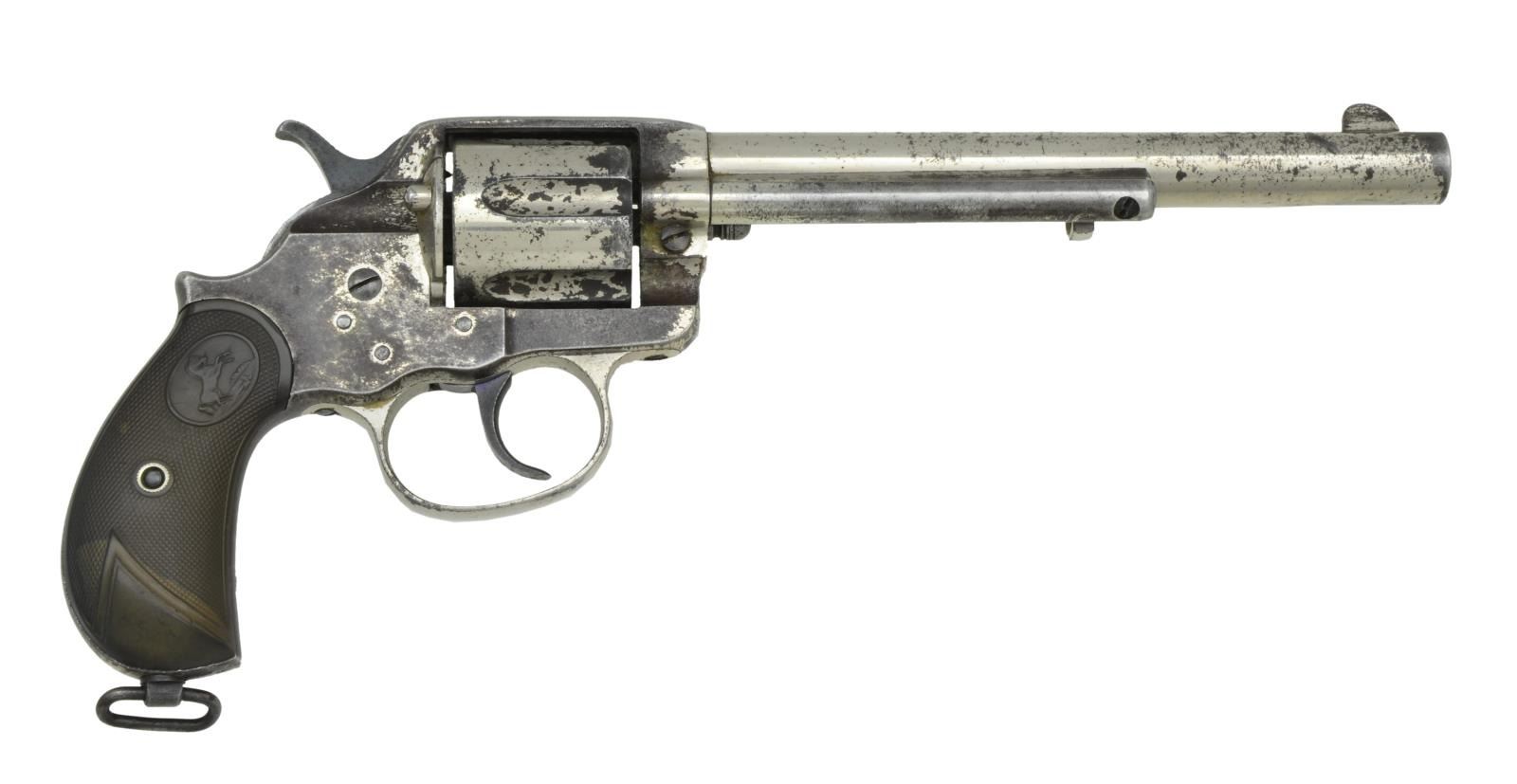REVOLVER. Cal. 38-40. (38 WCF). S# 50286. Bbl. 7 1/2" w/ blade sight. Six shot long flute cyl. Full nickel finish. 2 Piece hard rubber rampant colt grips w/ lanyard loop at butt. Mfg. 1903. CONDITION: over 50% nickel finish blending w/ areas of peeling having a dark patina. Grips show light wear. Functioning action, cyl. exhibits some significant side play. Dark frosted bore w/ worn rifling. (23-785/DS). CURIO. $1,000-1,500.