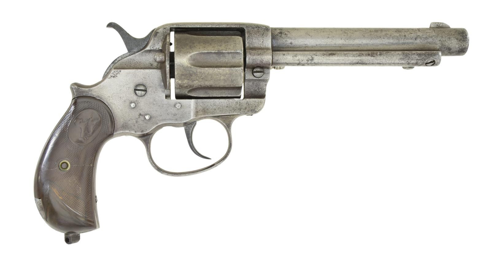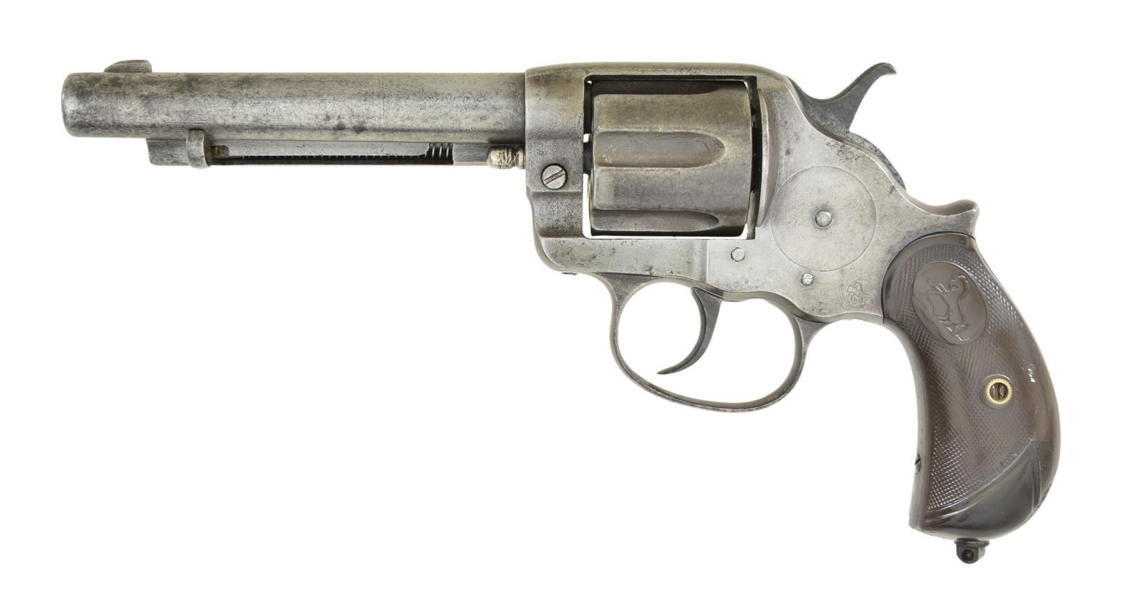 Cal. 32-20 (32 WCF). S# 28721. Bbl. 5-1/2’’. Six shot long flute cyl. 2 piece checkered hard rubber rampant colt grips. Mfg. 1891. CONDITION: metal has faded to gray showing scattered pitting. Grips show heavy wear. Missing large chips along backstrap. Lanyard loop is detached. Front sight is lowered w/ a filled dovetail behind it. Cyl. pin shows heavy wear & appears to be replacement. Functioning action shows wear, cyl. exhibits substantial play. Pitted bore w/ worn rifling. (01-22103/DS). ANTIQUE. $800-1,200.