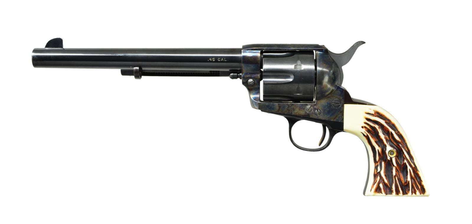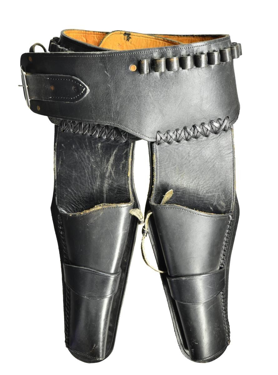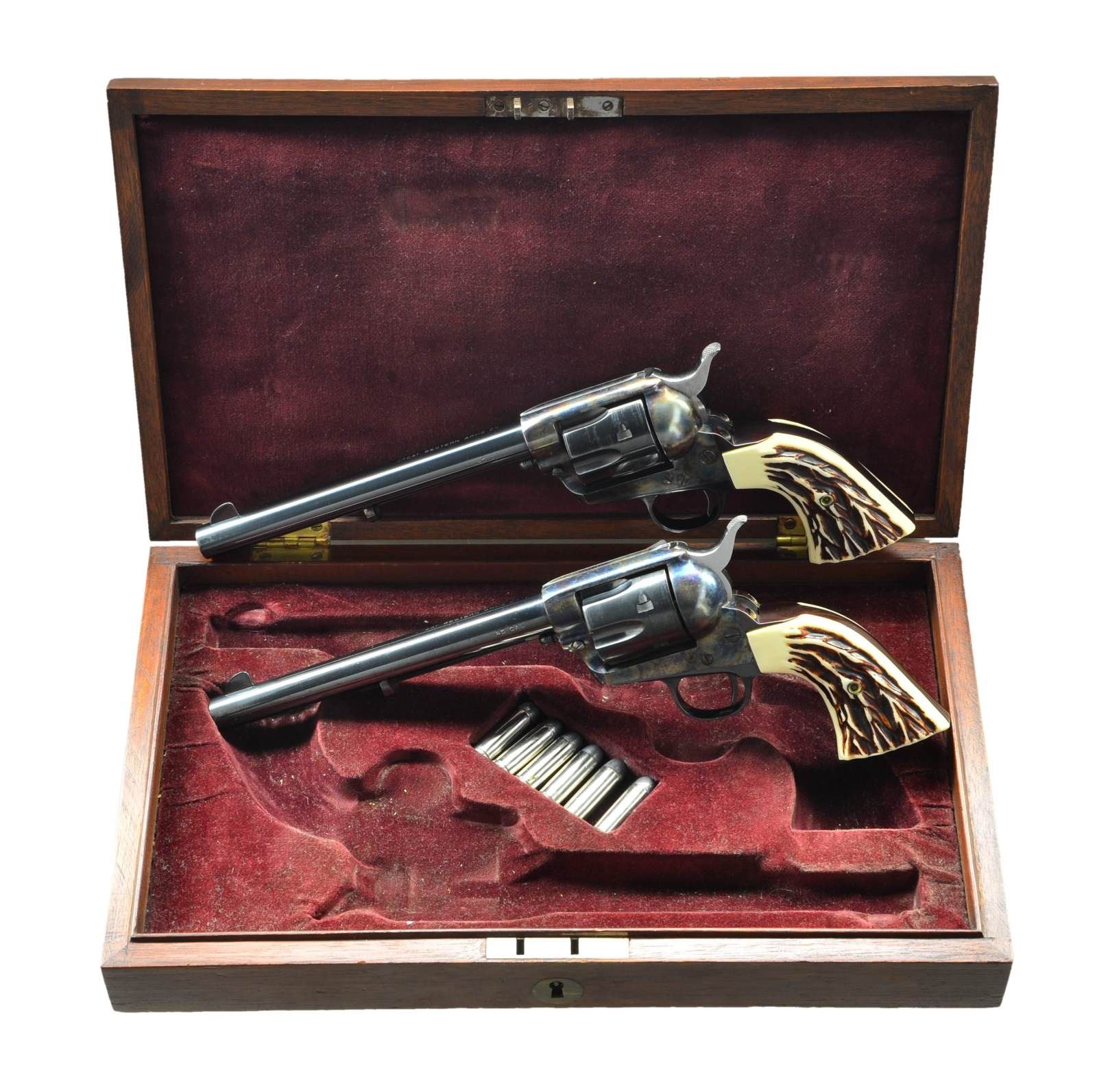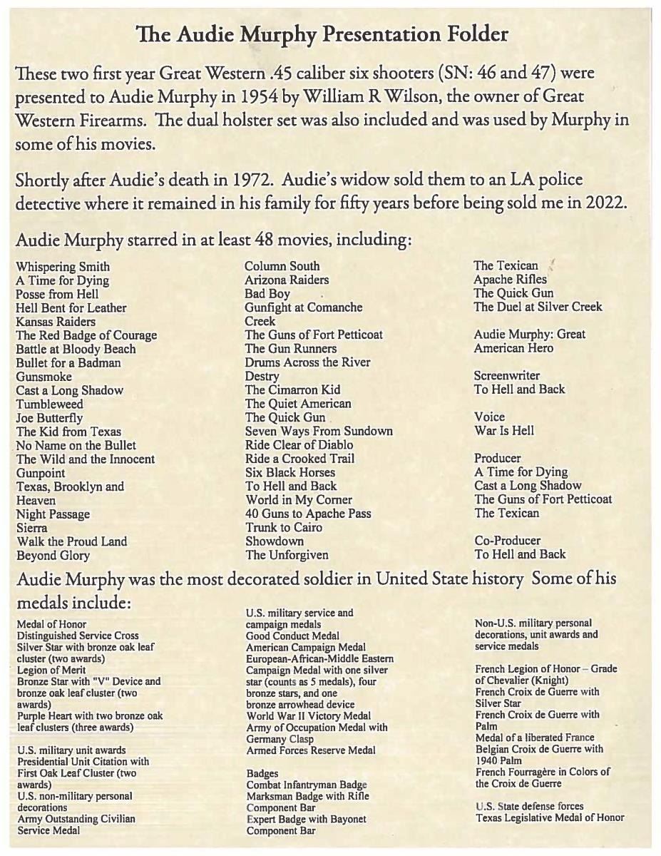Cals. 45 Colt. S#s. GW46 & GW47. Audi Murphy was among the most decorated soldiers of WWII. The honors bestowed upon him including the Medal of Honor, Distinguished Service Cross and many other U.S. decorations as well as the Legion of Honor and several other medals from the French government. After the war, he became a popular movie star, screenwriter and producer starring in at least 48 movies. This cased pair of low S# revolvers were presented to Audi in 1954 by William R. Wilson, the owner of Great Western Firearms. Shortly after Audi’s death in 1972, his widow sold them to an LA police detective. The guns remained in his family for 50 years before being sold again in 2022. Great Western Arms Company, formerly of Los Angeles CA (1954-1964) produced a high quality copy of the Colt model P western style revolver. Bbls. 7 1/2”. Six shot fluted cyls. Blue and case colored finishes. 2 Piece synthetic stag grips. UNATTACHED ACCESSORIES: these desirable revolvers are housed in their original wood presentation case. The fitted purple velour interior also contains six nickel plated dummy cartridges. Also included is Audi’s custom 2 gun western style black leather belt and holster rig. A ring binder contains important documentation & history as well as a DVD of one of Audi’s most famous movies “To Hell And Back”. Information in the binder consists of a list of his 48 movies & extensive list of his military medals and decorations. The following 4 pages are a statement of facts about these revolvers and their ownership. Photocopies of a newspaper article and pictures of Audi with the guns are included. Following pages have color photos of the guns, presentation case and holster rig. CONDITION: both very fine. (S# GW46) Metal retains over 98% original finish showing light drag lines on cyl. Left grip handle has a small chip at heel. Smooth mechanics. Near excellent bore. (S# GW47) 98% Original finish showing drag lines on cyl. with small spots on barrel near the muzzle. Smooth mechanics. Near excellent bore. (23-64 & 23-65/DS). CURIOS. $12,000-20,000.