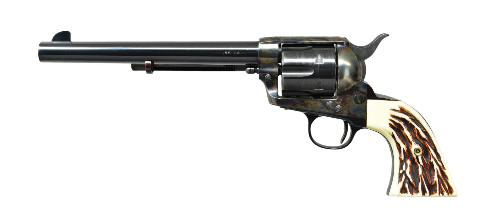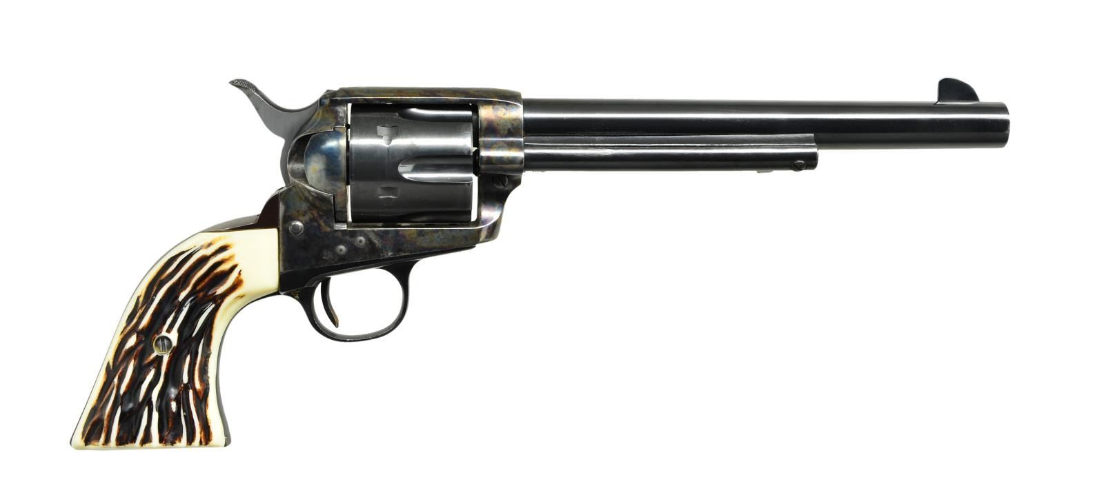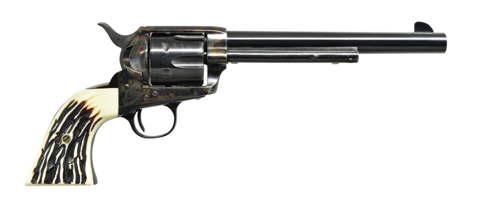 Cals. 45 Colt. S#s. GW46 & GW47. Audi Murphy was among the most decorated soldiers of WWII. The honors bestowed upon him including the Medal of Honor, Distinguished Service Cross and many other U.S. decorations as well as the Legion of Honor and several other medals from the French government. After the war, he became a popular movie star, screenwriter and producer starring in at least 48 movies. This cased pair of low S# revolvers were presented to Audi in 1954 by William R. Wilson, the owner of Great Western Firearms. Shortly after Audi’s death in 1972, his widow sold them to an LA police detective. The guns remained in his family for 50 years before being sold again in 2022. Great Western Arms Company, formerly of Los Angeles CA (1954-1964) produced a high quality copy of the Colt model P western style revolver. Bbls. 7 1/2”. Six shot fluted cyls. Blue and case colored finishes. 2 Piece synthetic stag grips. UNATTACHED ACCESSORIES: these desirable revolvers are housed in their original wood presentation case. The fitted purple velour interior also contains six nickel plated dummy cartridges. Also included is Audi’s custom 2 gun western style black leather belt and holster rig. A ring binder contains important documentation & history as well as a DVD of one of Audi’s most famous movies “To Hell And Back”. Information in the binder consists of a list of his 48 movies & extensive list of his military medals and decorations. The following 4 pages are a statement of facts about these revolvers and their ownership. Photocopies of a newspaper article and pictures of Audi with the guns are included. Following pages have color photos of the guns, presentation case and holster rig. CONDITION: both very fine. (S# GW46) Metal retains over 98% original finish showing light drag lines on cyl. Left grip handle has a small chip at heel. Smooth mechanics. Near excellent bore. (S# GW47) 98% Original finish showing drag lines on cyl. with small spots on barrel near the muzzle. Smooth mechanics. Near excellent bore. (23-64 & 23-65/DS). CURIOS. $12,000-20,000.