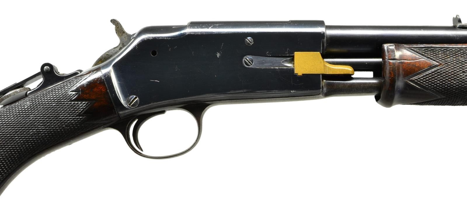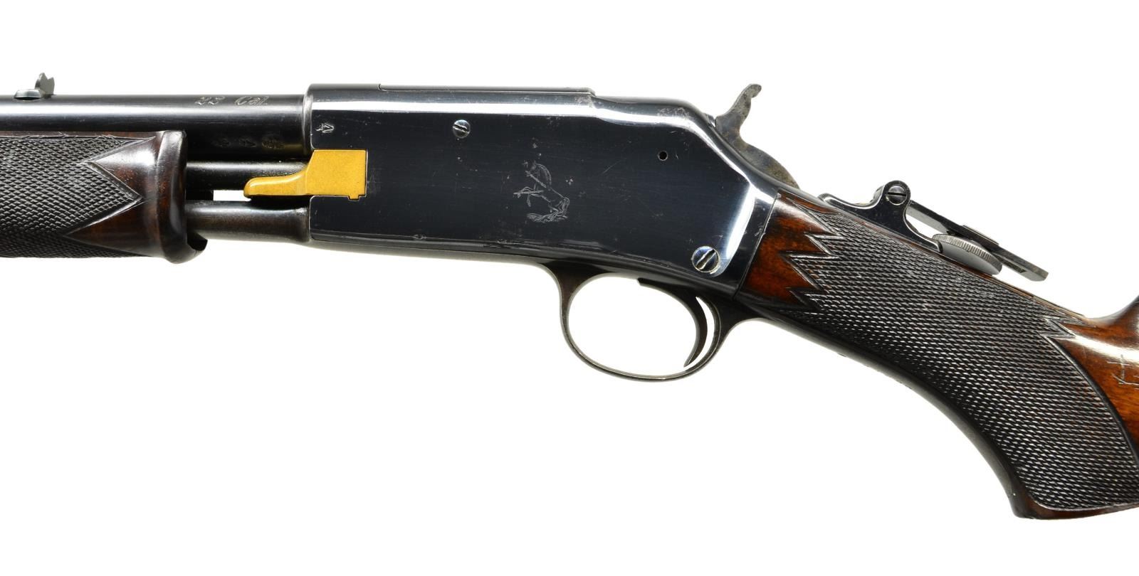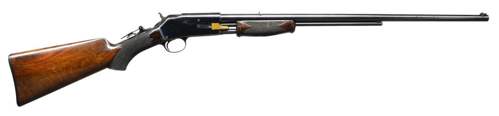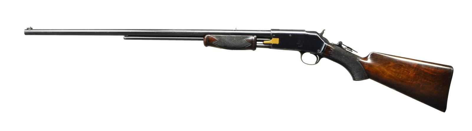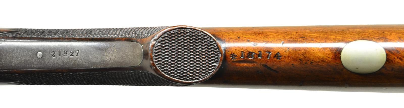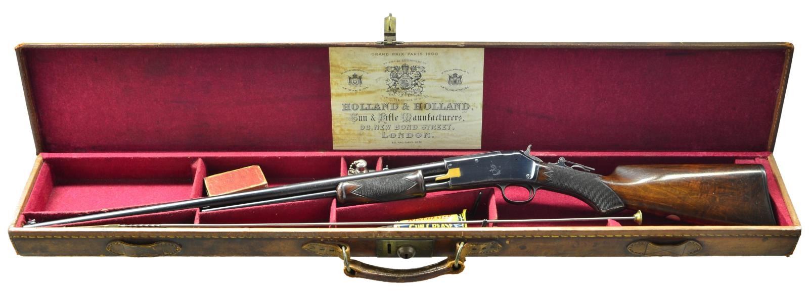Cal. 22 RF. S# 21927. Bbl. 24” round. Combination front sight, fixed U notch rear sight & Vernier style tang sight w/ large disc aperture. 2/3 Length tubular mag. Blue finish w/ case colored hammer & brass loading block. Left side of bbl. & receiver have British proofs. The rampant Colt motif is also found on the left side of the receiver. 1 Piece walnut milk pail handle style slide handle w/ wraparound checkering. Pistol grip stock of nicely grained walnut w/ hard rubber buttplate. Nameplate in toe line having wraparound hand checkering w/ additional checkering at bottom of grip. Toe line in stock is stamped with a star followed by “18174”. UNATTACHED ACCESSORIES: leather covered rifle case w/ burgundy felt lined interior. Case exterior is marked with initials “E.V.F.”. Case is marked Holland & Holland w/ 98, New Bond St, address. Case contains brass tipped steel cleaning rod, turnscrew, sterling silver oil bottle, wire hangers, Winchester gun grease & case straps. Also included is a wrapped 100 rd box of Eley 22 long cartridges. Colt mfg. company letter lists the following information: “COLT LIGHTNING MAGAZINE SLIDE ACTION RIFLE”, “’Small Frame’”, “Serial Number: 21927”, “Caliber: .22 Rimfire”, “Barrel Length: 24”, Octagon configuration”, “Finish: Blue”, “Type of Stocks: Full pistol grip, checkered wood”, “Special Features: Furnished with Colt peep and Beach combination sights”, “Shipped To: Colt’s Patent Fire Arms Mfg. Company London Agency”, “Address: 14 Pall Mall London, England”, “Date of Shipment: March 26, 1896”, “Number of Same Type Guns in Shipment: 15”. CONDITION: very fine, retaining over 90% lightly faded blue w/ scattered spots of corrosion. Original wood finish shows light wear & crazing w/ scattered scratches, dents & marks. Checkering shows some wear & flattened diamonds. Sound mechanics. Bore retains sound lightly worn rifling. (01-22958/DS). ANTIQUE. $7,500-10,000.