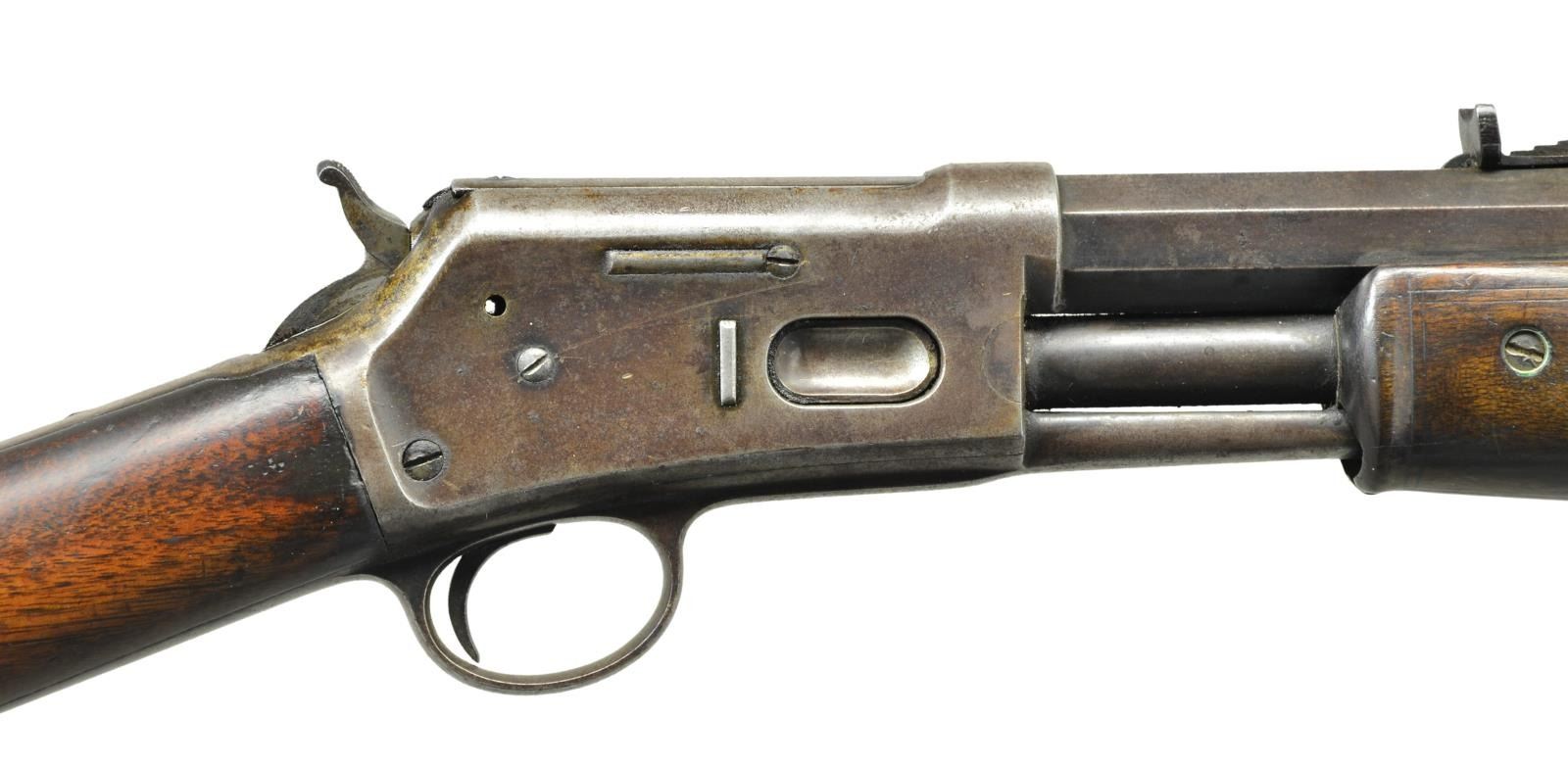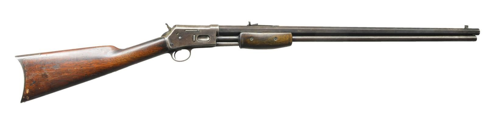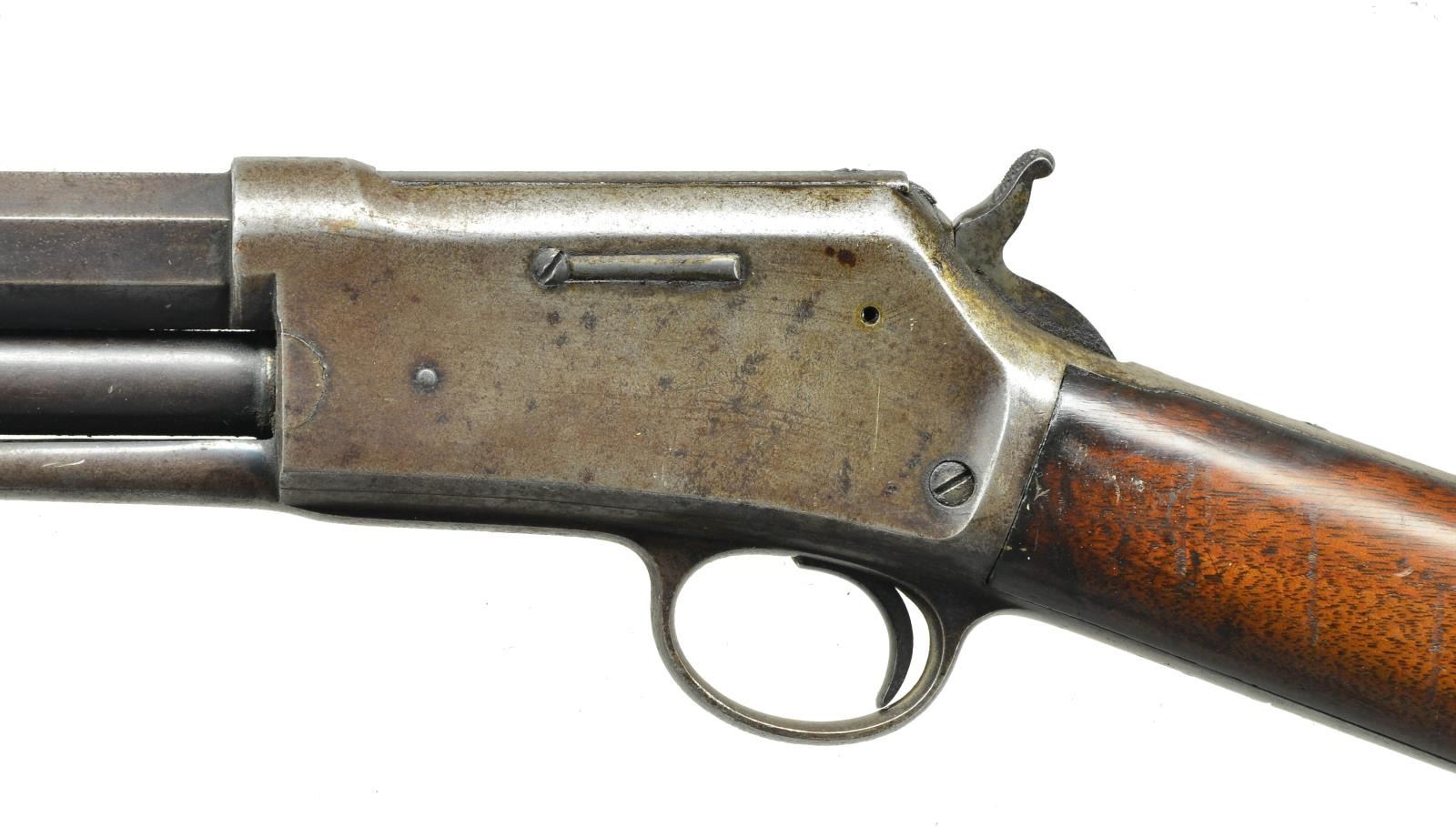 ACTION RIFLE. Cal. 38 (38-40). S# 87618. Bbl. 26" oct. w/ blade front sight & elevator adj. sporting rear sight. Full length mag. 2 Piece walnut forearm & straight grip stock w/ crescent steel buttplate. Mfg. 1904. CONDITION: metal retains some fading blue in protected areas w/ balance fading to brown, showing scattered very light pitting & handling marks. Forearm shows wear & handling marks w/ sm. chips. Stock shows numerous dents & handling marks, most prevalent on toeline. Functioning action. Bore retains lightly worn rifling showing scattered spots of pitting. PROVENANCE: Collection of John Montague. (22-1053/DS). CURIO. $700-1,100.