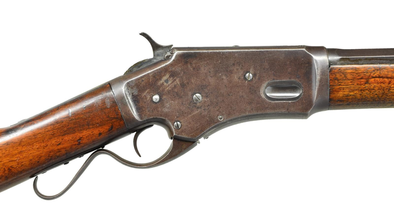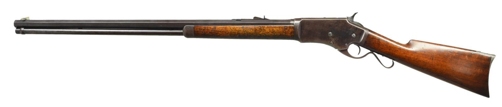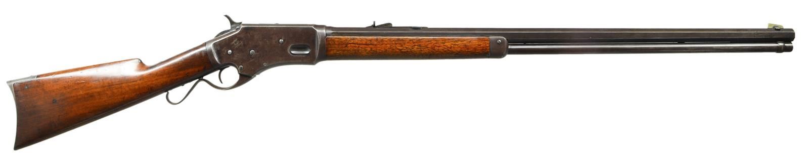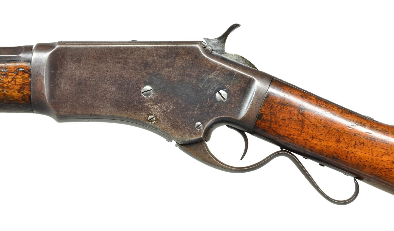 Cal. 44-40. S# A220. Bbl. 28 ‘’ octagon. German silver blade rocky mountain front sight w/ sporting rear sight. Full length mag. Light frame action w/ serpentine lever. Walnut forearm & straight grip stock w/ crescent steel trap door buttplate. Estimated total of 15,000 mfg. 1879-1886. CONDITION: metal has faded to a pleasing brown patina showing scattered small spots of light pitting. Original wood finish has a blistered coat of added finish over scratches, marks & small dents. Bore shows scattered pitting & retains intact rifling. (01-22662/DS). ANTIQUE. $1,200-2,200.