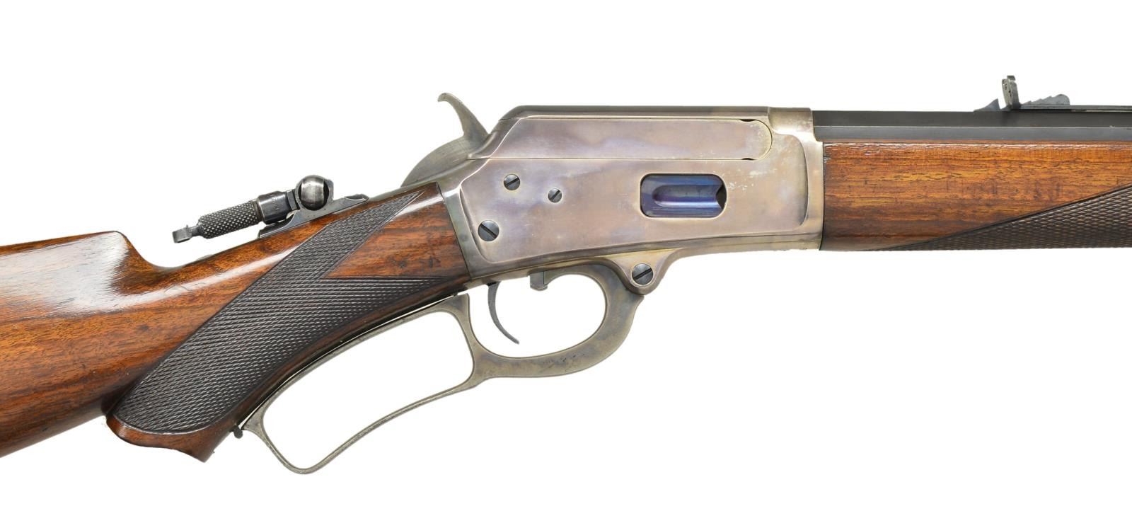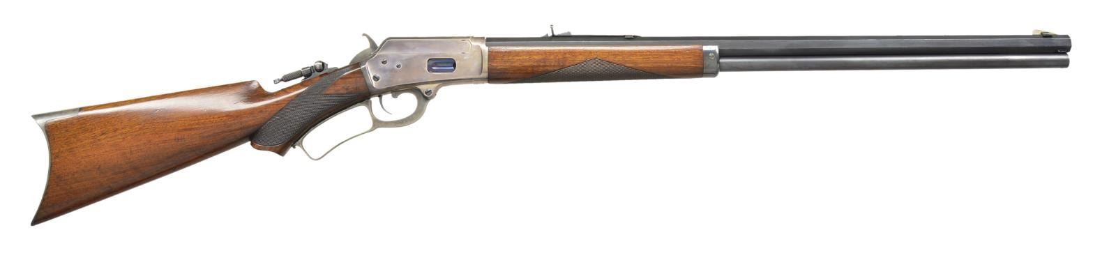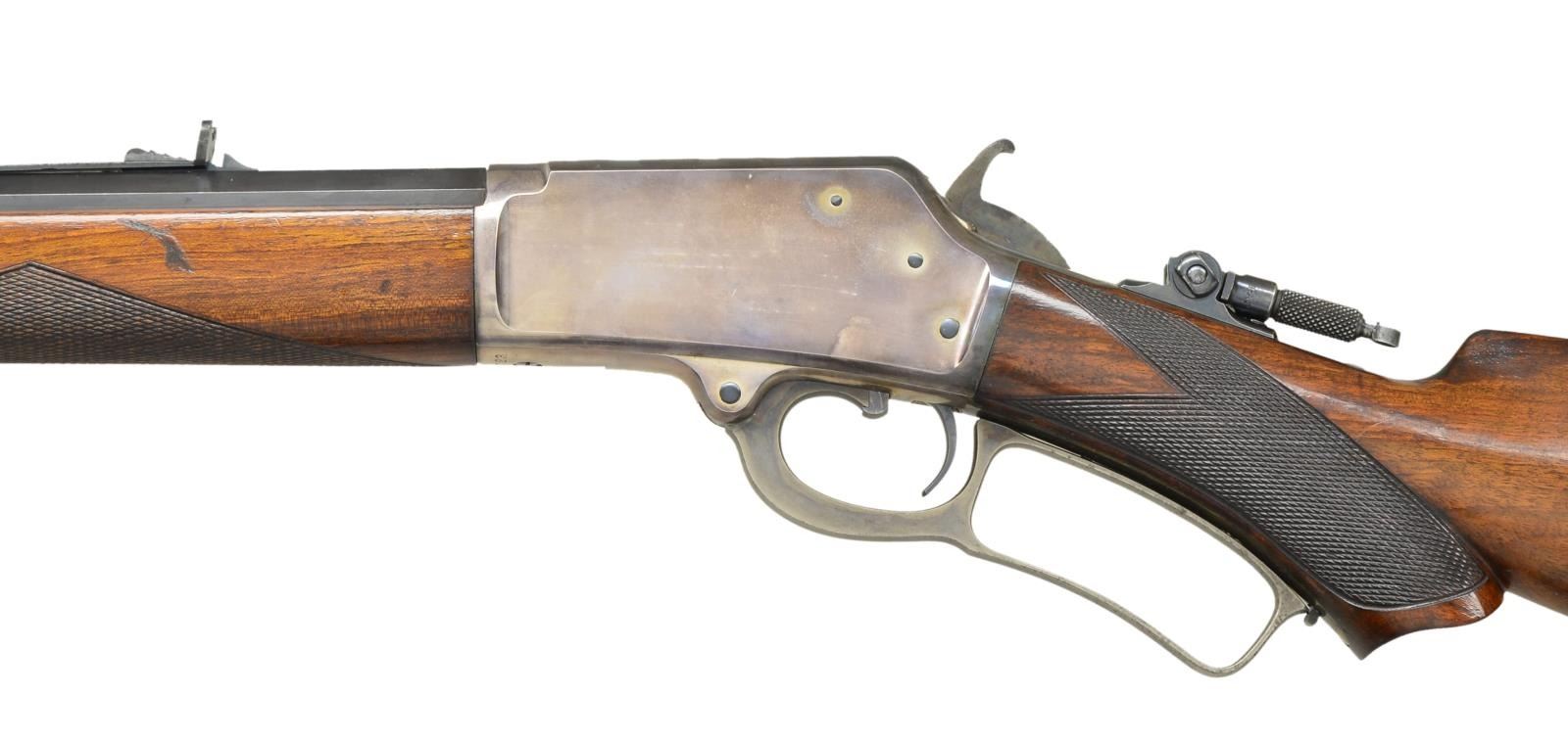 Cal. 44 W (44-40). S# 67723. Bbl. 24" octagon with German silver blade rocky mountain front sight, semi Buckhorn rear sight and combination tang sight. Full length mag. Silver finished action with case colored hammer and lever has fire blue loading gate. Forearm and S curved pistol grip stock of nicely grained walnut with case colored crescent steel buttplate. Style number “A” hand checkering. Serial number indicates 1892 mfg. CONDITION: fine. Bbl. and mag tube retain 80% lightly faded blue showing edge wear and small spots. Action retains nearly all silver finish having acquired a pleasing mild intermittent tarnish. Hammer, lever and buttplate show some fading case colors. Original wood finish shows scattered scratches, marks and small dents. Sound mechanics. Lightly pitted bore retains sound rifling. (01-22316/DS). ANTIQUE. $5,000-7,000.