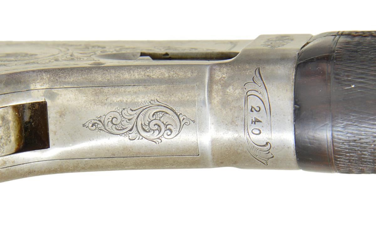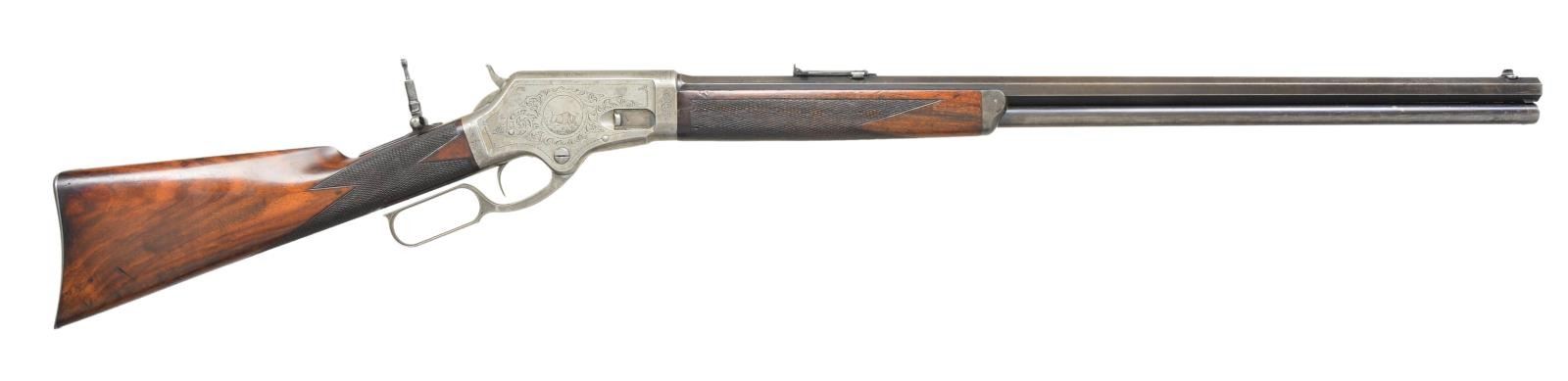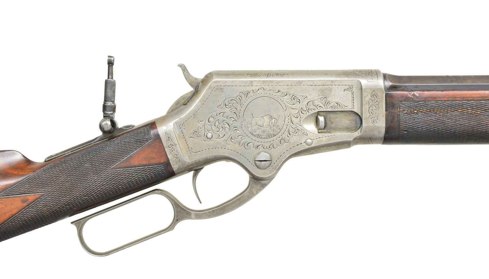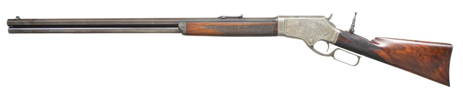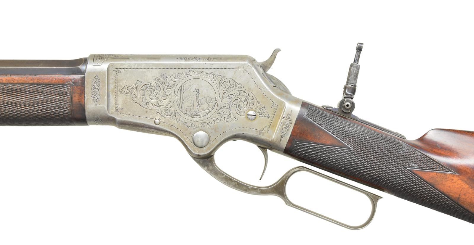 DELUXE LEVER ACTION RIFLE. Cal. 45 Govt (45-70). S# 240. Outstanding first variation factory engraved rifle, research done by consignor indicates that this is not only very likely the earliest engraved model 1881 rifle manufactured, but the only one currently known with a rebated receiver ring. While “Marlin Firearms” by Lt. Col. William S. Brophy States that fewer than 600 Model 1881 rifles were produced with rebated receivers, more recent extensive research done by Mr. Runge and fellow Marlin enthusiast Rick Regnier indicate that fewer than 300 were actually manufactured. Left side of receiver features a circular vignette of a charging Buffalo bull. Left side vignette depicts a whitetail buck & doe. Scenes are surrounded by an extensive vine type foliate scroll with punch dot background & fancy borders. Complimenting scroll extends to upper & lower receiver areas as well as flanges, top tang & surrounds a stag head on the breech bolt. Although not signed the engraving appears to be the work of Conrad Friedrich Ulrich Jr (1844-1925). Conrad Ulrich did almost all of the Marlin engraving from 1881 to 1910. Blue finished rifle with rare nickel finished action having case colored hammer & lever. Consignor states "In my conversation with fellow Marlin collectors, and through extensive research, it is my opinion that this may be Marlin's first factory engraved model 1881 rifle." Bbl. 28" octagon. Lyman bead front sight, graduated leaf rear sight & combination tang sight. Full length mag. Steel capped forend & straight grip stock of fancy thin shell walnut with steel shotgun buttplate. Point pattern hand engraving wraps around the toeline of the stock & in square at the rear of the forearm. Weight: 9 lbs 14 oz. CONDITION: bbl. & mag tube retain 60% dull faded blue showing carry wear. Receiver shows over 50% nickel with balance fading to gray. Hammer & lever retain traces of case color. Buttplate finish has faded to gray. Original wood finish shows age related wear with numerous scratches, marks & small dents. Checkering shows small handling marks with heavy wear on bottom area of forearm. Right side of forearm has repaired cracks forward of receiver. Bore retains sound rifling having a ring bulge approx 2" from muzzle. PROVENANCE: From the life long collection of Robert Runge. (01-21654/DS). ANTIQUE. $15000-25000