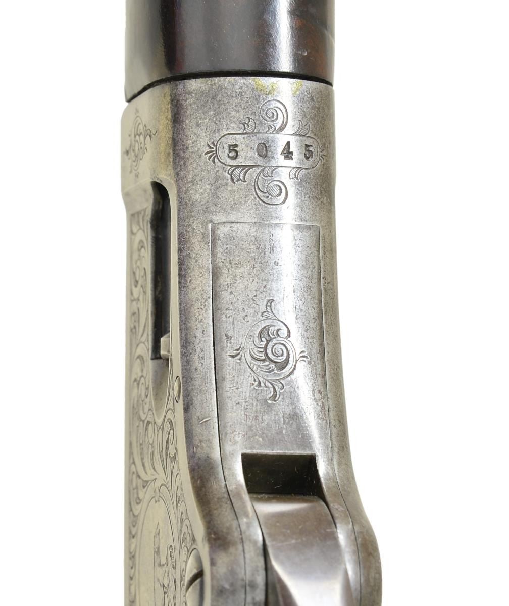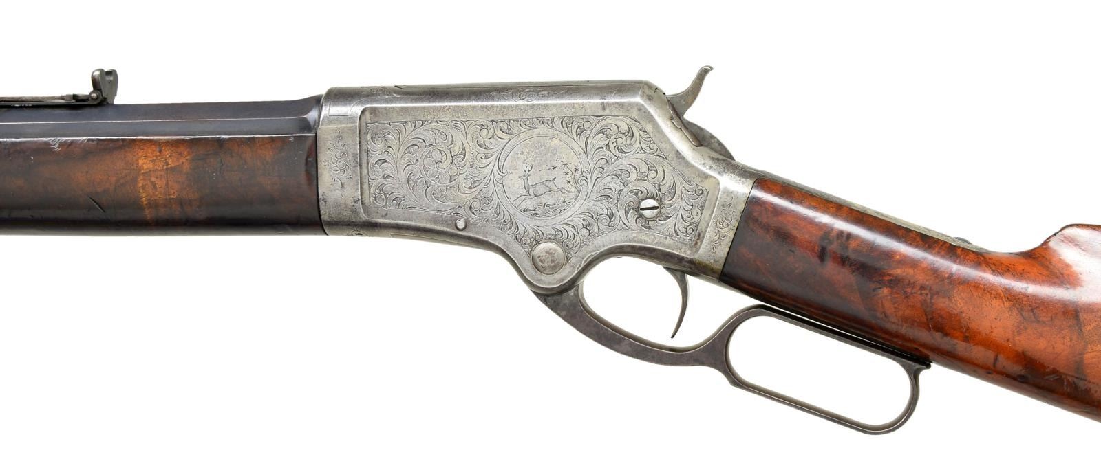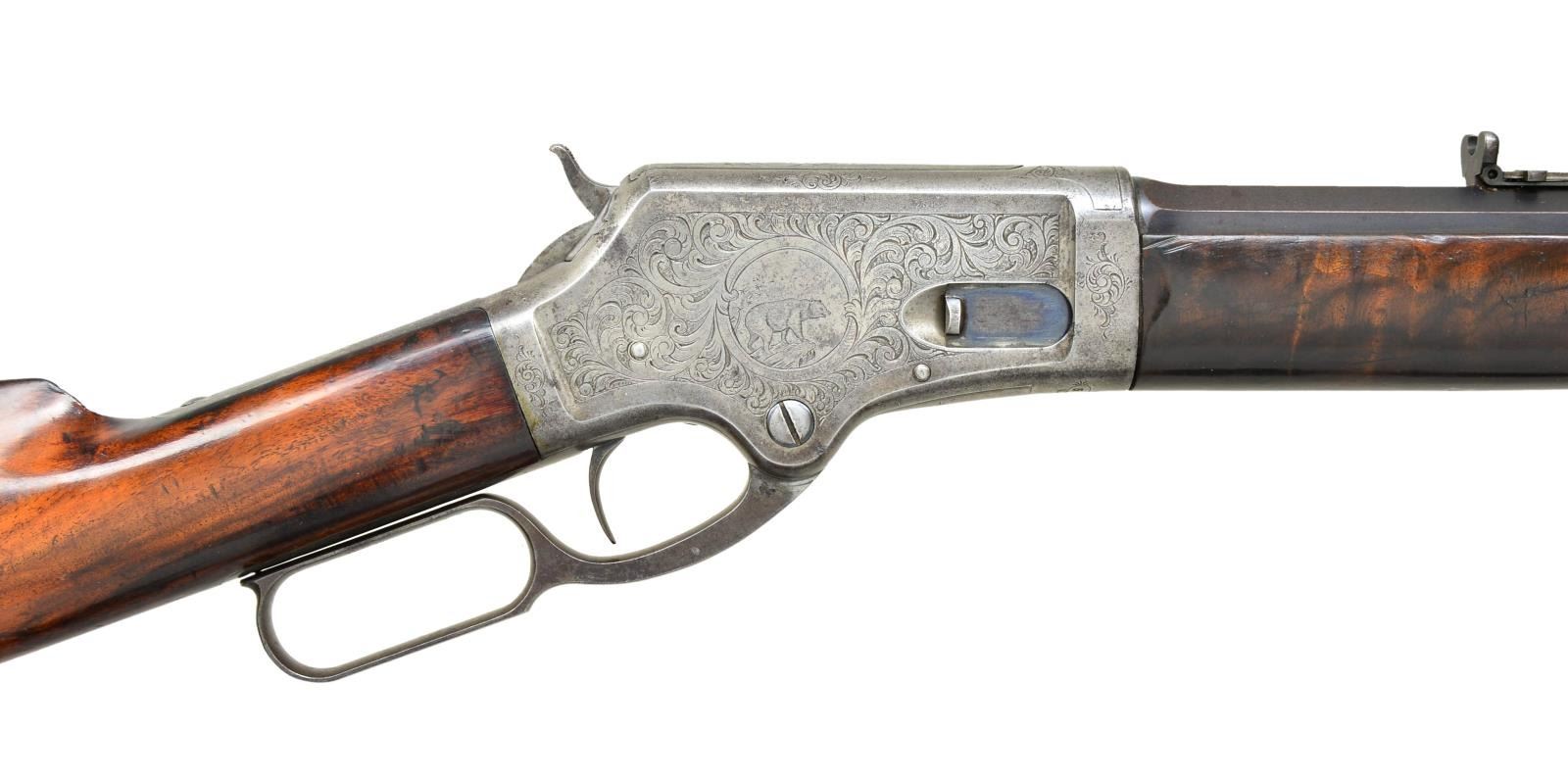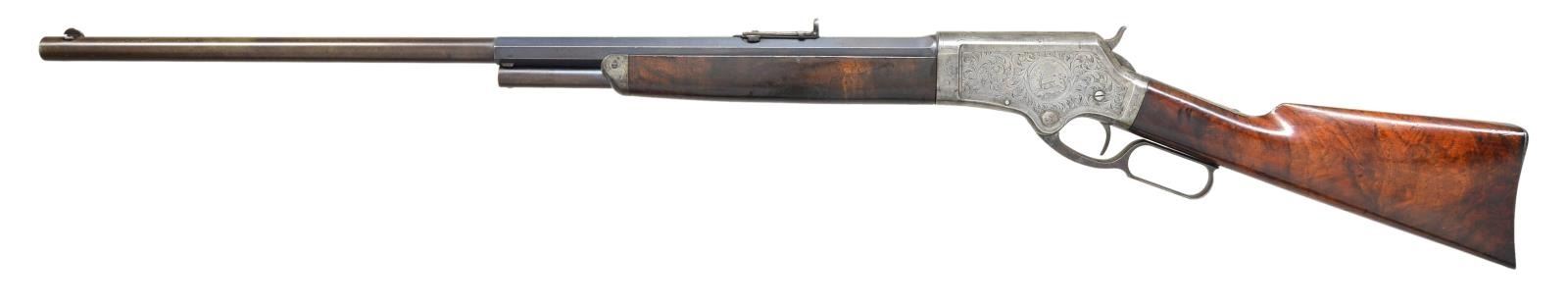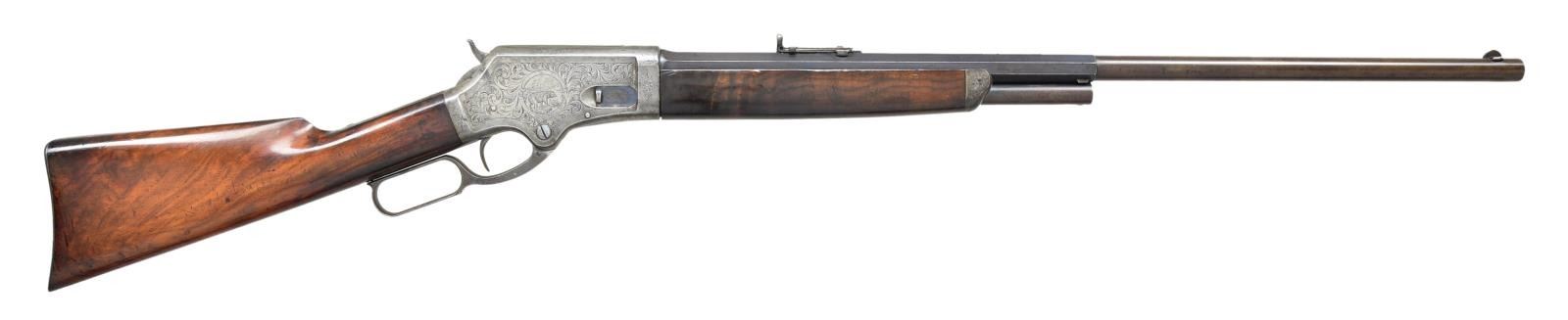 LEVER ACTION RIFLE. Cal. 45 Govt. (45-70). S# 5045. Desirable second model with many unusual features. The engraving features circular vignettes with a whitetail buck on right side and a grizzly on the left. Scenes are surrounded by highlights of scroll engraving & straight line borders that extend to upper & lower action areas. Breech bolt has circular vignette of a buck deer. Although not signed the engraving appears to be the work of Conrad Friedrich Ulrich Jr (1844-1925). Conrad Ulrich did almost all of the Marlin engraving from 1881 to 1910. Bbl. 28" octagon to round. Lyman no. 4 white bead front sight. Freund patent graduated leaf rear sight. Half length mag. Forearm & straight grip stock with steel shotgun buttplate of fancy deluxe grade uncheckered thin shell walnut. Uncheckered deluxe wood is uncommon among engraved Model 1881 rifles. Records for the model 1881 show only 47 rifles with half round barrels & only 194 with half magazines. Shipped July 12, 1883. Weight: 8 lbs 15.4 oz. CONDITION: octagon portion of bbl retains 60% dull blue. Forward portion of bbl. & mag. tube have largely faded to a smooth brown patina. Action has a pleasing aged gray / brown appearance. Wood has light coat of additional finish over wear, scratches, marks & small dents. Bore is bright with sharp rifling. PROVENANCE: From the life long collection of Robert Runge. (01-21657/DS). ANTIQUE. $8,000-12,000.