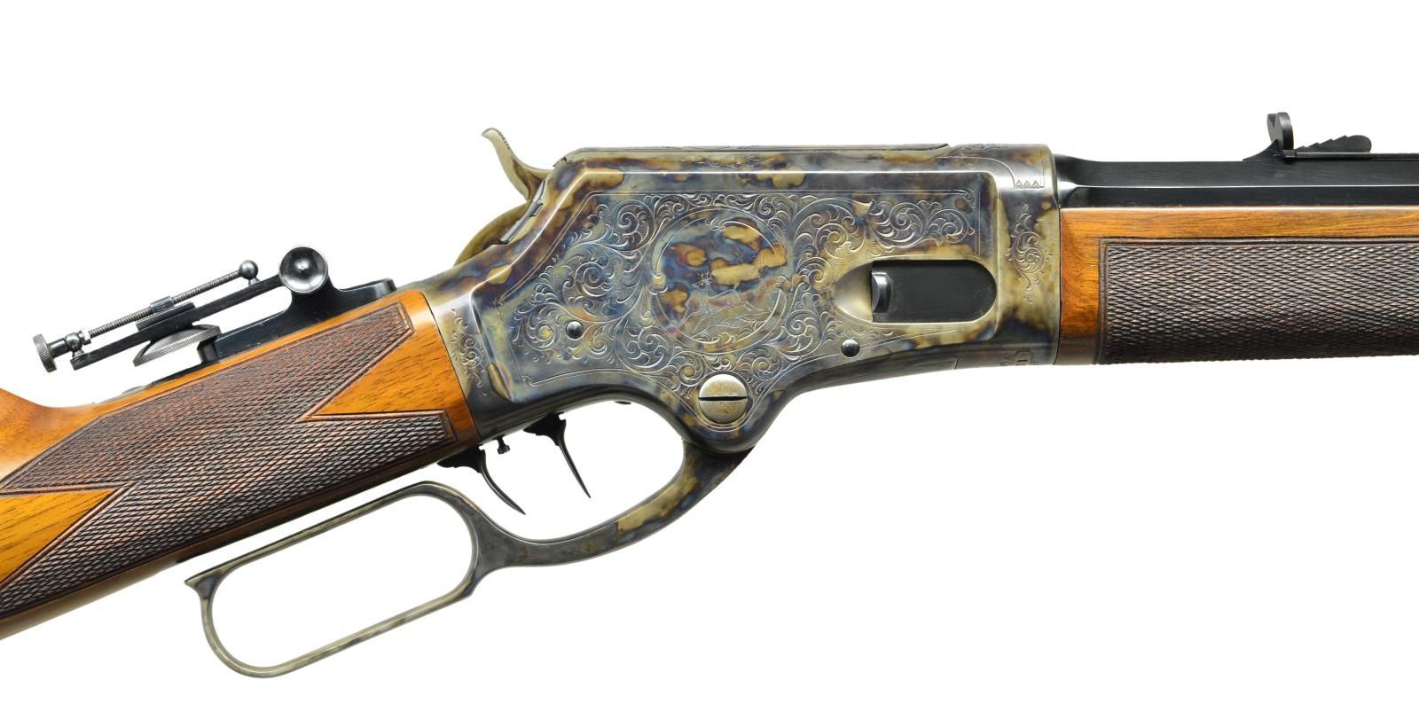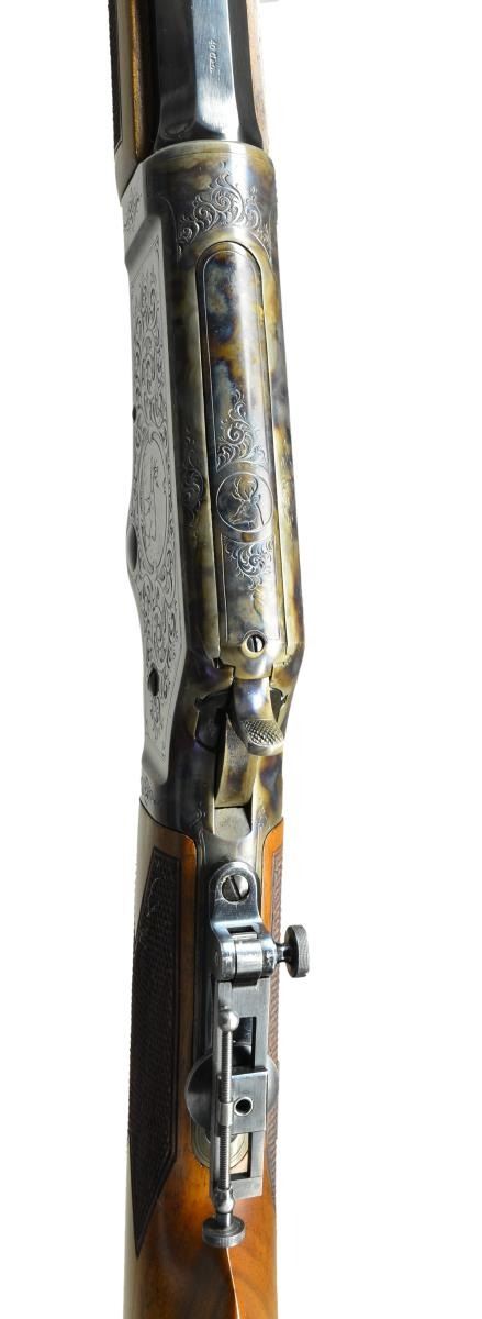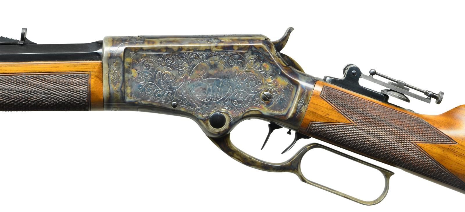 RIFLE. Cal. 40 (40-60). S# 11576. Bbl. 28" octagon. German silver blade front sight, semi Buckhorn sporting rear sight and midrange Vernier tang sight. Double set triggers. Case colored action has engraving typical of the model 1881 period. The engraving features circular vignettes with deer on both sides and deer’s head on breach bolt. Scenes are surrounded by arabesque scroll with punch dot backgrounds and straight line borders that continues to upper and lower receiver areas. Straight grain walnut forearm and straight grip stock have hand checkering. Steel shotgun butt and forearm cap are case colored. UNATTACHED ACCESORIES: Cody firearms records check stating; "Type: Rifle / Caliber: 40-60 / Barrel Length: 28 inches / Set Trigger / Date Shipped: September 22, 1885". CONDITION: beautifully restored rifle. Metal retains 99% re-blued and recase colored finish. Stock has very good refinish with freshly cut checkering. Trigger is not setting properly. Lightly pitted bore has darkened appearance retaining intact rifling. (01-22319/DS). ANTIQUE. $3,500-5,000.