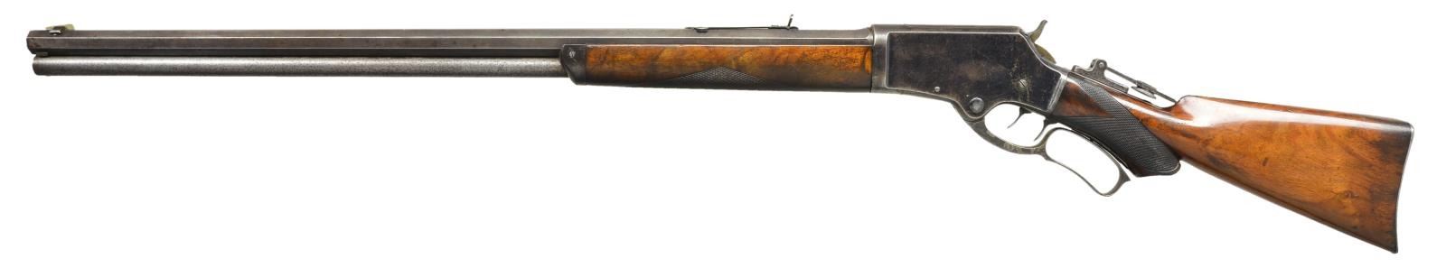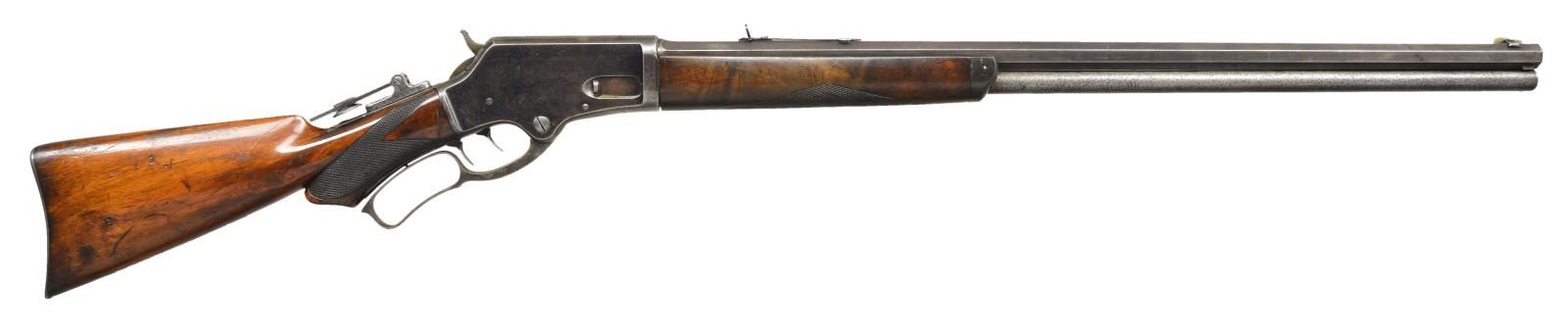 Cal. 40-60. S# 37765. Bbl. 28" octagon. German silver blade rocky mountain front sight, sporting rear sight and tang sight with large disc aperture. Double set triggers. Blue finish with case colored hammer and lever. Forearm and S curved pistol grip walnut stock have nickel finished steel buttplate and factory checkering. Serial number indicates 1890 mfg. CONDITION: bbl. shows 40% faded blue finish. Action retains 60% blue remaining bright on sides showing spots of freckling and marks with carry wear on upper and lower surfaces. Hammer and trigger retain small amounts of case colors. Mag to has faded to gray showing general light pitting. Stock and forearm have age darkened worn finish, lightly worn checkering and show numerous scratches and marks. Double set triggers are not setting properly. Bore shows areas of substantial pitting. PROVENANCE: Estate Collection of Thomas F. Wolfinger. (01-22162/DS). ANTIQUE. $2,000-3,000.