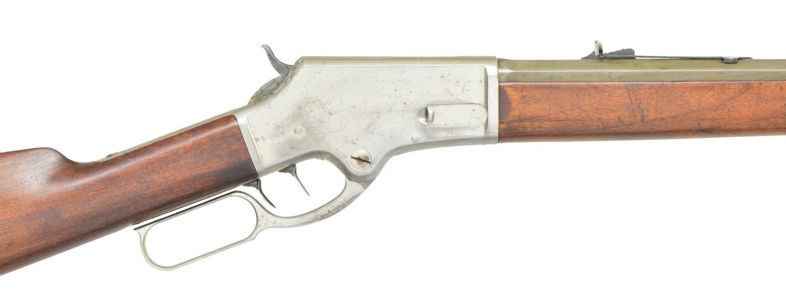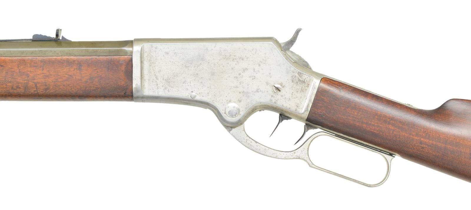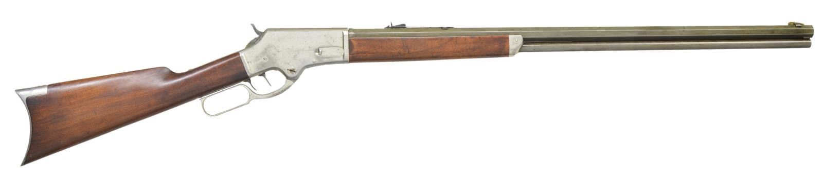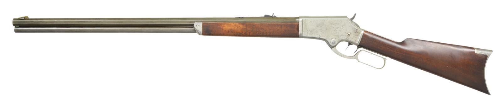RIFLE. Cal. 38-55. S# 16651. Bbl. 28’’ octagon. Rocky mountain front sight w/ sporting rear sight. Full length mag. Double set triggers. Light frame action, forearm cap & buttplate are factory nickel plated. Walnut forearm & straight grip stock w/ crescent steel buttplate. Mfg. 1888. CONDITION: bbl. & mag. tube have a gray appearance from touch up finish. Action & fittings retain over 60% nickel. Sanded & refinished wood shows some handling marks. Forearm has cracks extending from right side of action. Lever hangs loose from frame. Functioning double set trigger. Bore is generally bright retaining sound rifling. (01-22663/DS). ANTIQUE. $1,500-2,000.