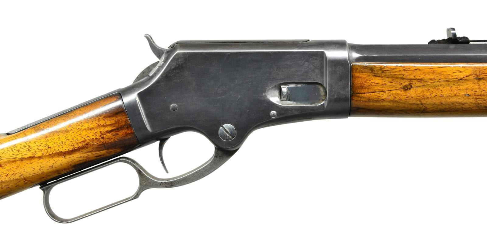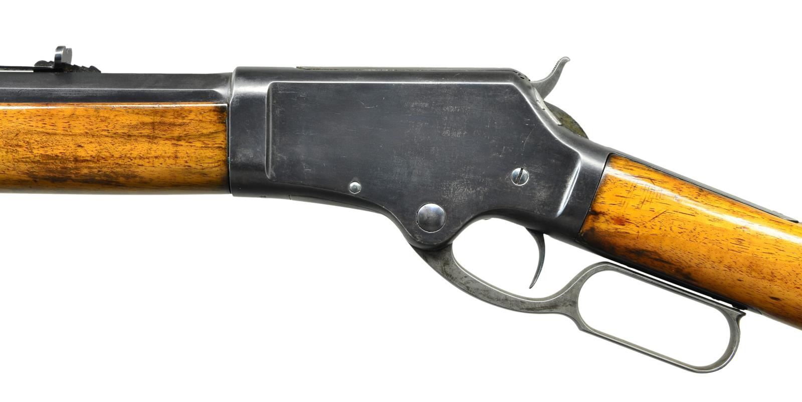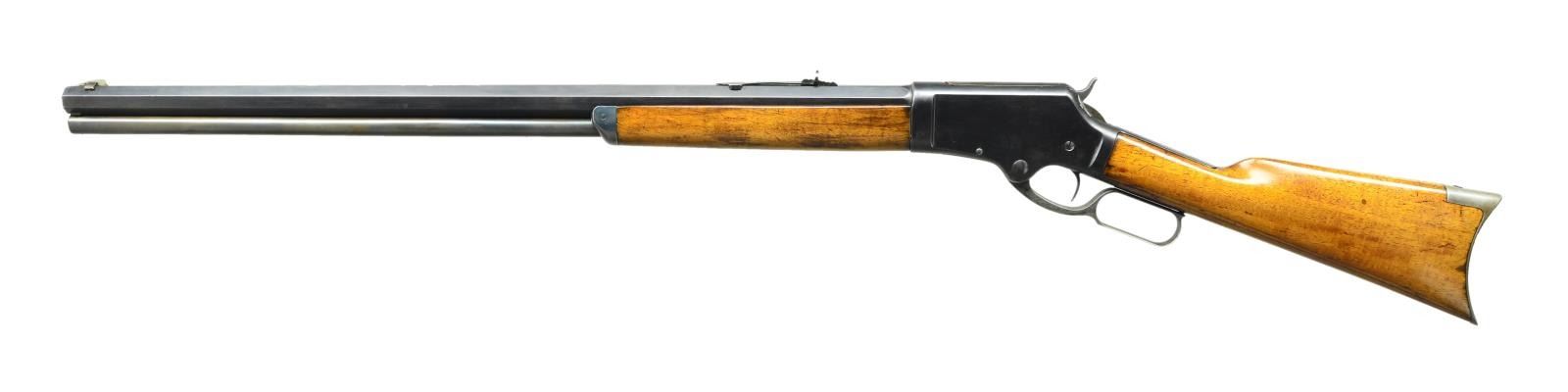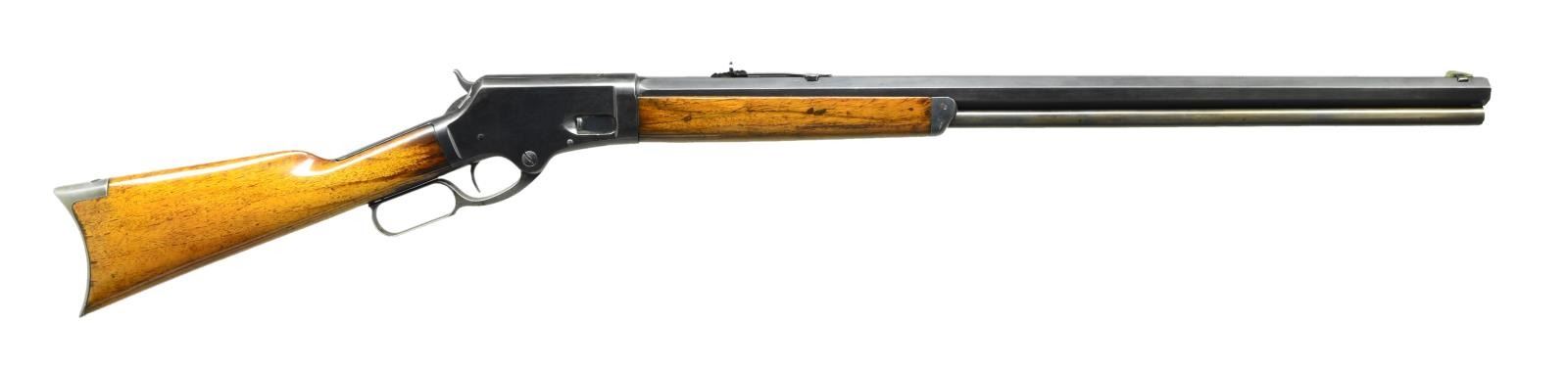 ACTION RIFLE. Cal. 45-70. S# 6512. Bbl. 28’’ octagon. German silver blade rocky mountain front sight w/ sporting rear sight. Full length mag. Walnut forearm & straight grip stock w/ crescent steel buttplate. Mfg. 1885. CONDITION: 90% lightly faded reblued metal finish. Sanded wood has a gloss finish showing numerous scratches & marks. Toeline of stock has a small added wood repair. Lightly pitted bore retains intact rifling. (01-22664/DS). ANTIQUE. $700-1,000.