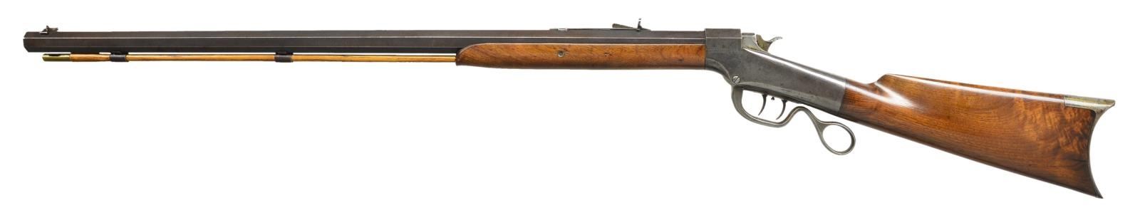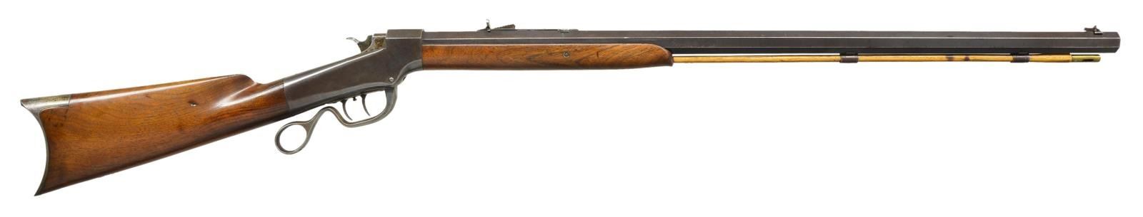 SHOT RIFLE. Cal. 45-70. S# 1003. Bbl. 30" octagon. Combination front sight with elevator adjustable V notch rear sight. Brass tipped hardwood wiping rod is held by 2 faceted pipes. Early style frame without the rebated ledge has heavy double set triggers with large protruding trigger plate and ring lever. Screw fastened forearm has ebony tip insert. Early style stock has deeply curved crescent buttplate. Mfg. 1876-1891. CONDITION: metal finish is fading to a light brown patina showing scattered handling marks. Refinished forearm is cracked at tip. Refinished stock shows dents and marks with cracks extending from the action and buttplate. Sound action with functioning set triggers. Hammer spur has welded repair. Lightly pitted bore retains intact rifling. PROVENANCE: Estate Collection of Thomas F. Wolfinger. (01-22163/DS). ANTIQUE. $1,500-2,500.