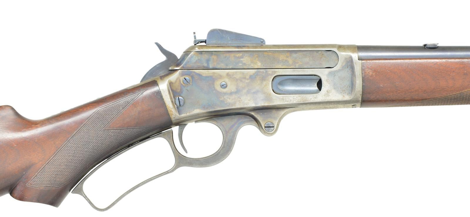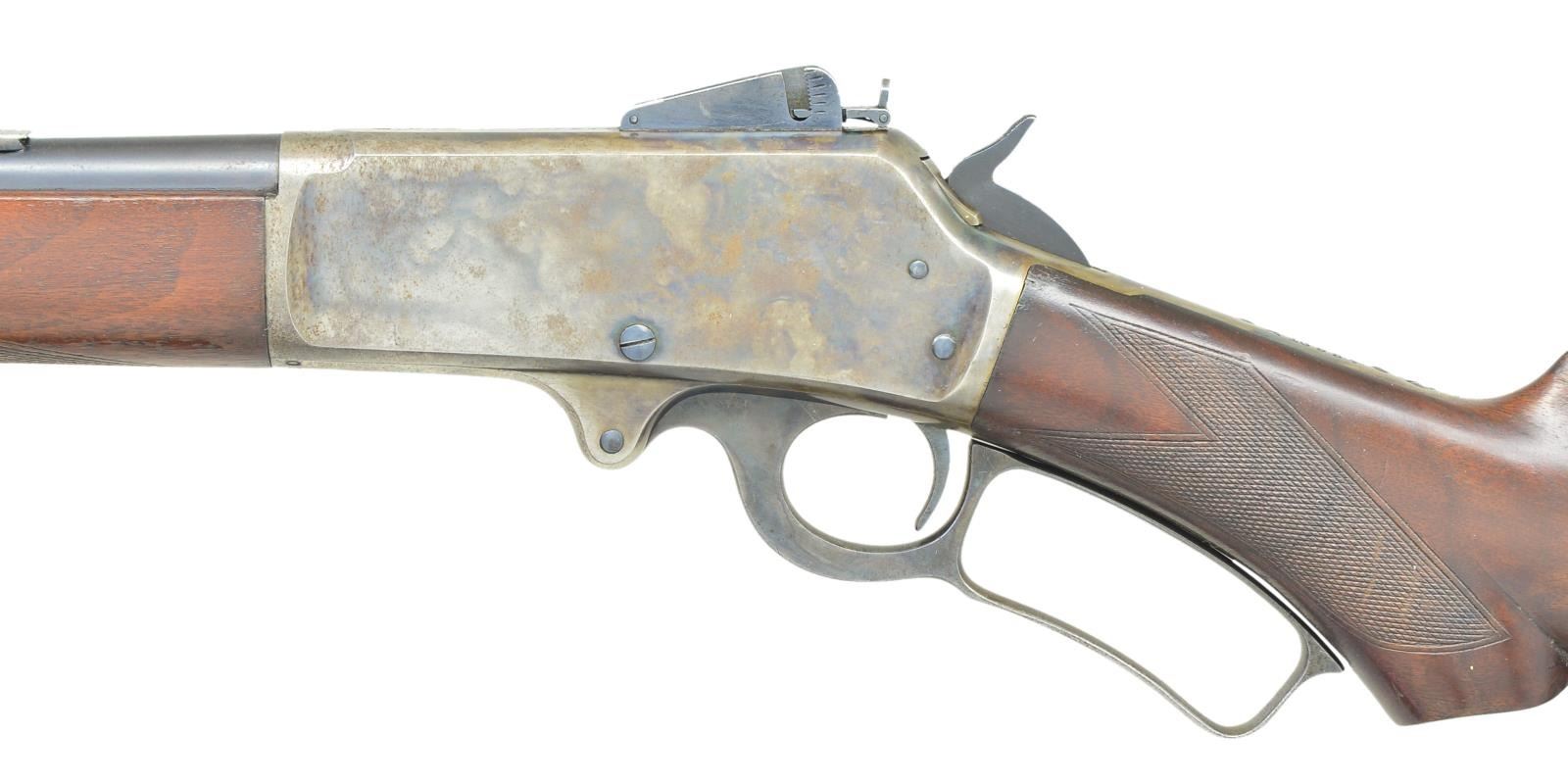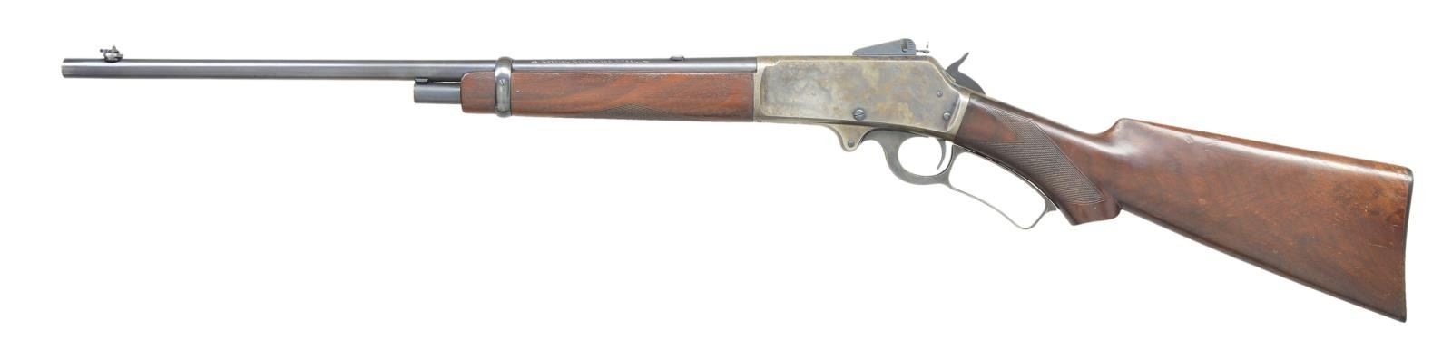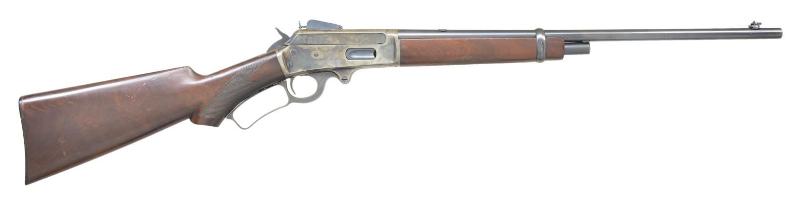 Cal. 32 HPS. S# 420380. Bbl. 20’’ round carbine style. Combination front sight, filler in rear dovetail w/ Marlin combination receiver sight. 2/3’’ length mag. Blue finish w/ case colored action. Carbine forearm & S curve pistol grip walnut stock w/ hard rubber buttplate & style A factory checkering. CONDITION: bbl. & mag. tube retain over 90% lightly faded blue. Action has 70% nicely visible case colors showing spots of darkening w/ wear in carry areas. Original wood finish shows light wear w/ spots of chipped finish, scratches & marks. Lightly pitted bore. (23-259/DS). CURIO. $1,500-2,200.