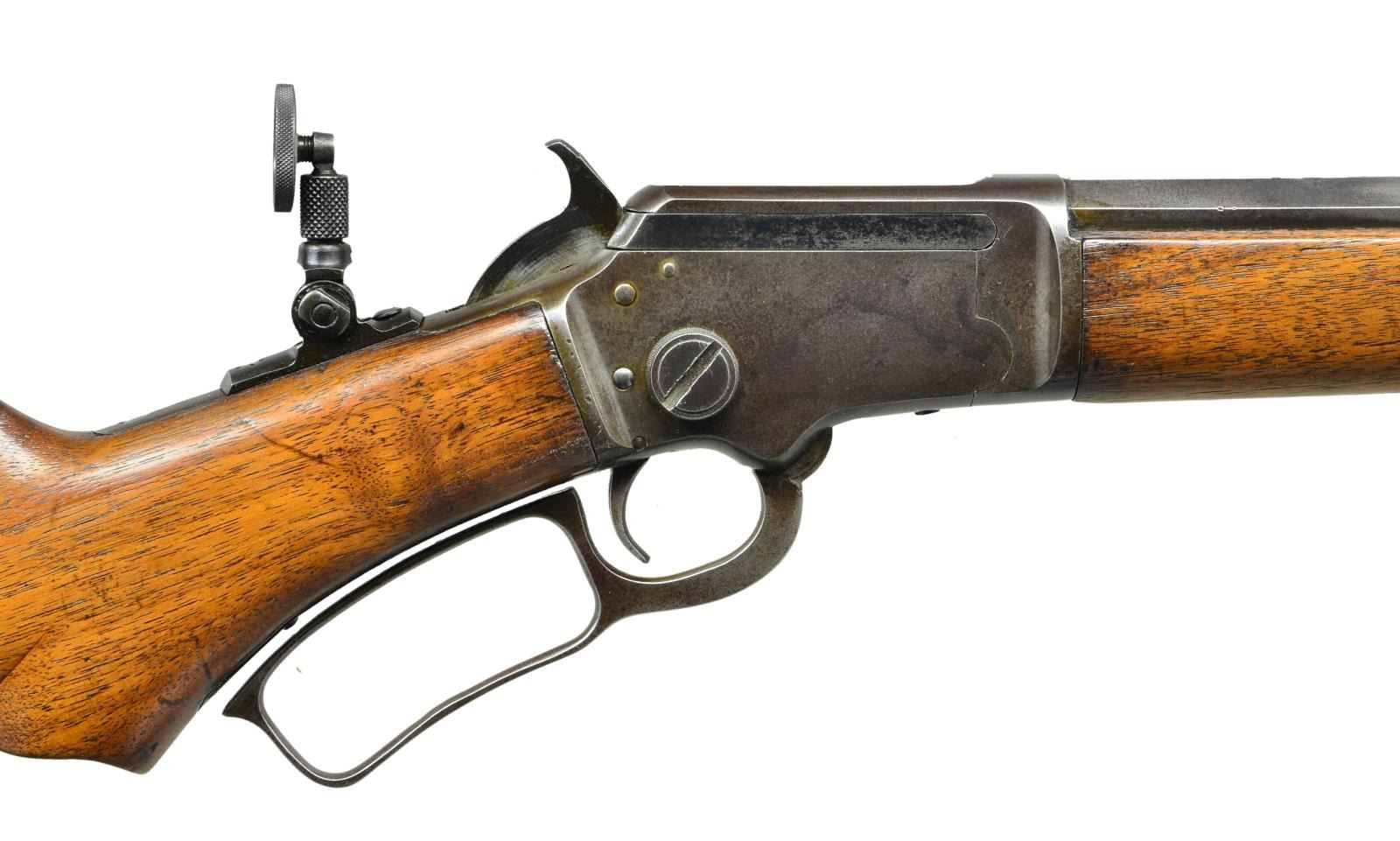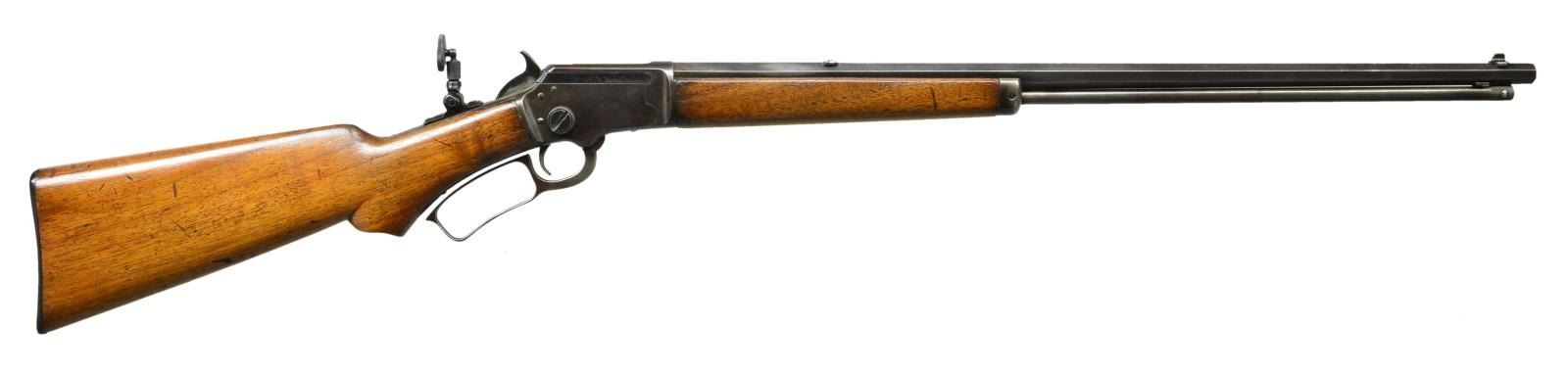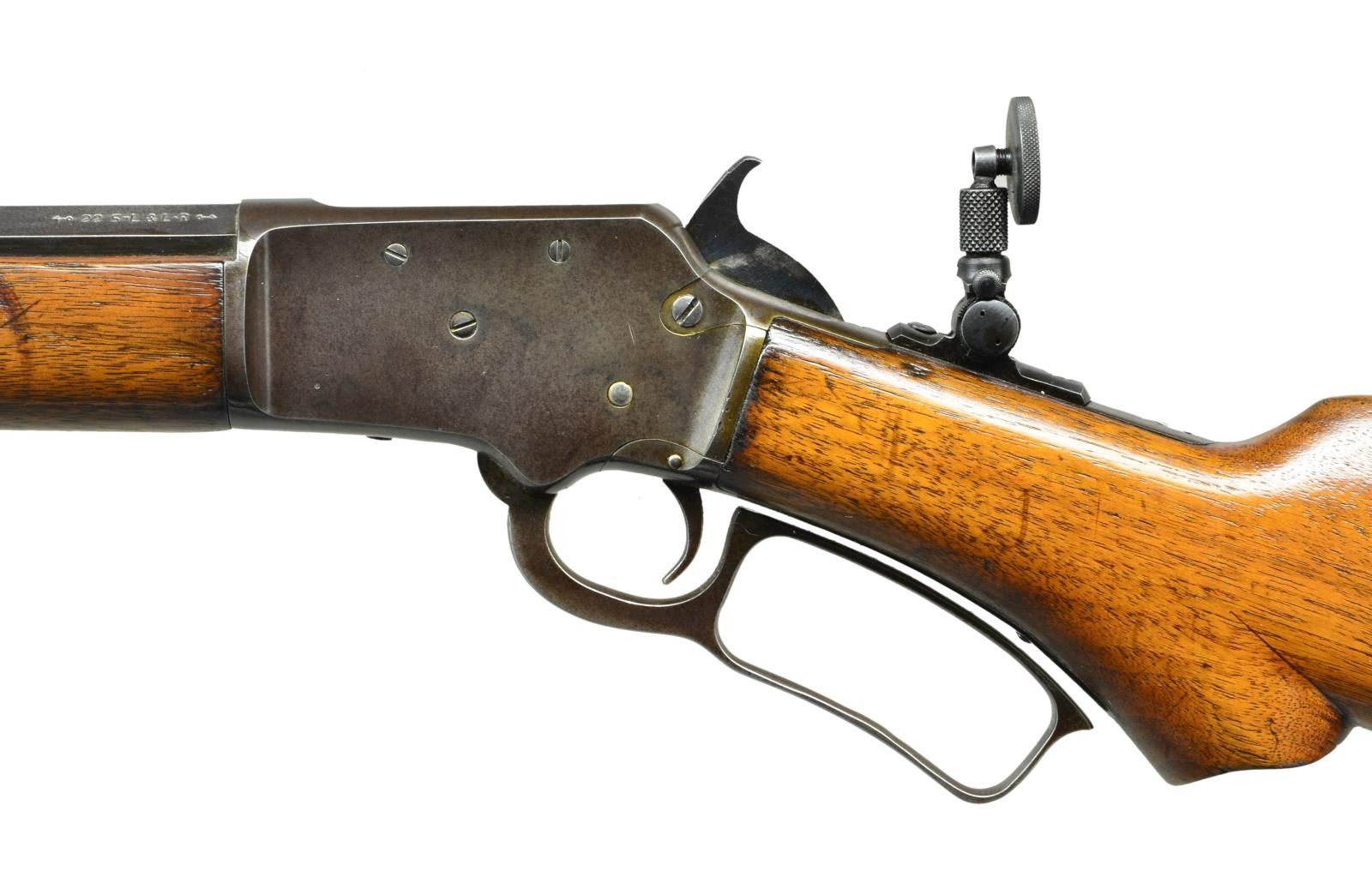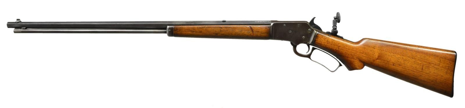Cal. 22 S, L, LR. S# S12374. Bbl. 22" octagon. Original front sight missing bead, filler in rear dovetail with combination tang sight having large disc aperture. Tubular mag. Top tang is star marked. Walnut forearm and S curved pistol grip stock with Marlin trademark in toe line and checkered hard rubber buttplate. CONDITION: metal finish has faded to an even brown patina. Sanded and refinished wood shows heavy wear with scratches marks and small dents. Good bore retains sound rifling. (21-4149/DS). CURIO. $800-1,100.