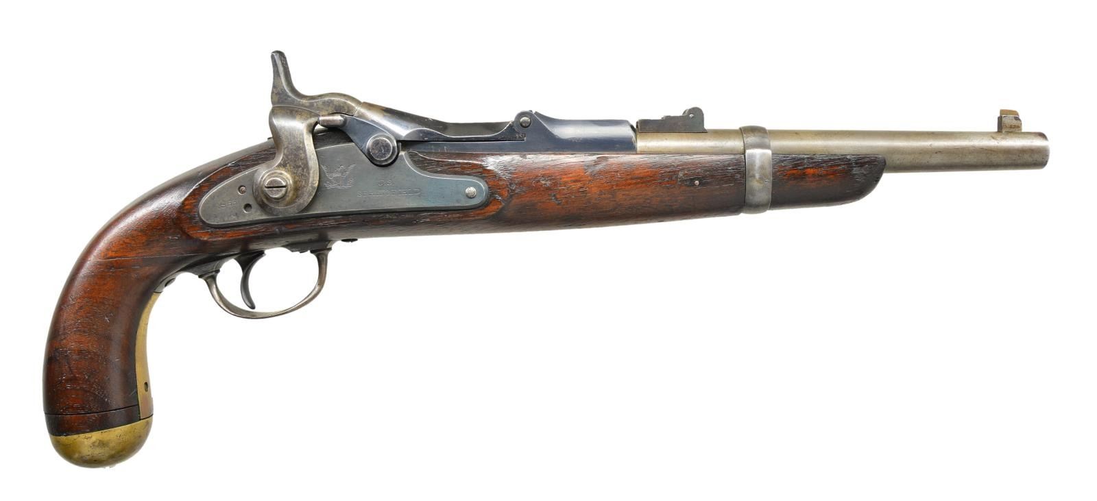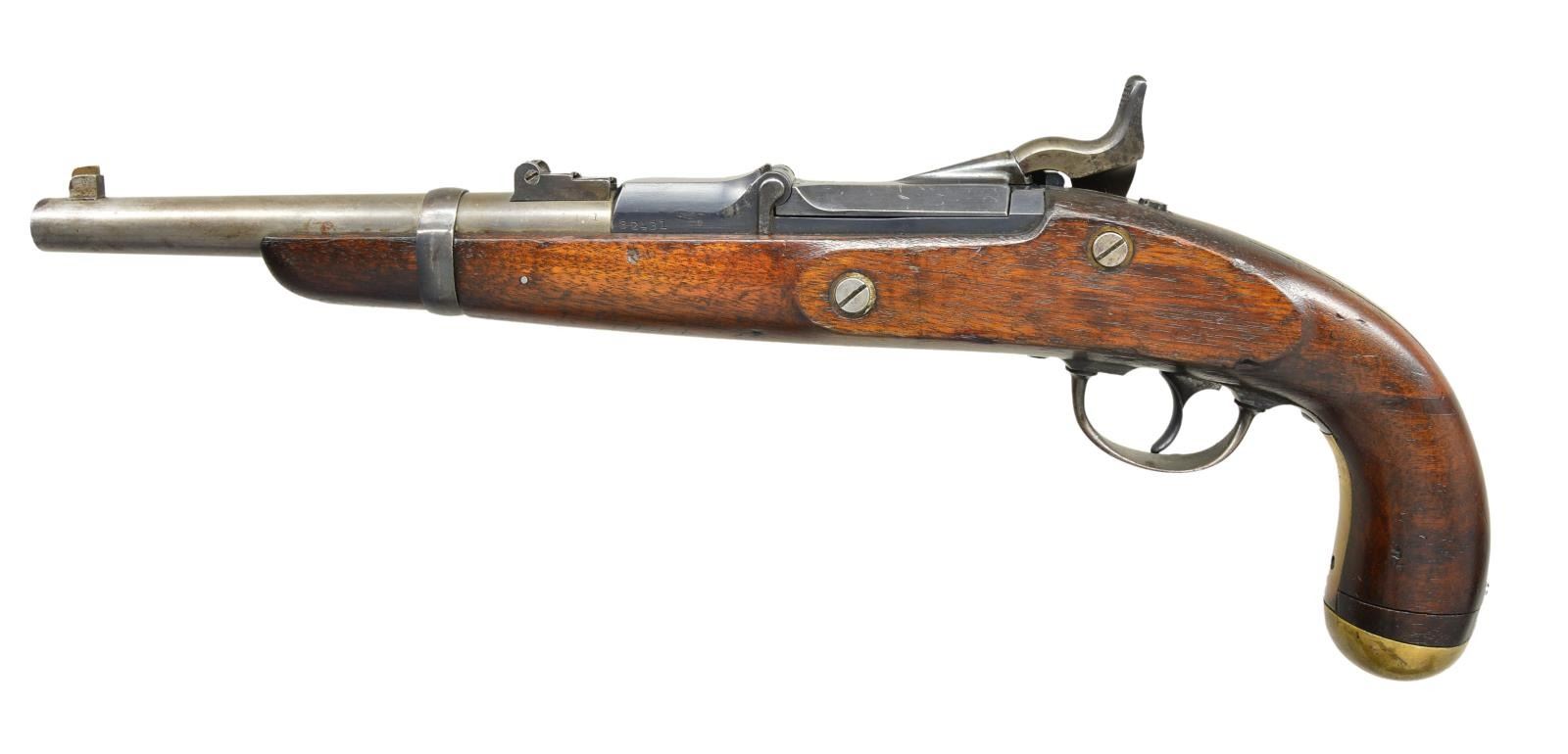 PISTOL. Cal. 50-70. S# 32431. Bbl. 10 1/8". A small quantity of these rare pistols were produced at the request of General William Tecumseh Sherman. “I wish you also cause to be prepared as soon as convenient prior to March 1, 1870, a carbine and single barreled pistol with the same or similar breech block as is now used in the Springfield musket, and capable of using the same identical cartridge. I do not suppose one can literally use a musket cartridge in the carbine and pistol, but each could use the same caliber, the same copper case, the powder alone varying in quantity, but the strength of parts should be adjusted so that in emergencies the carbine and pistol could use the musket cartridge.”. Pinned brass blade front sight w/ 2 leaf rear sight. Bbl. is numbered to match the frame & is finished in the white. Blue finished action & 1863 dated Springfield lock. Brass grip straps & butt cap. Band fastened 3 piece walnut stock. CONDITION: very fine. Frame, breech block & lock retain over 80% blue showing small marks. In the white bbl. finish has faded to a light gray appearance. Stock has worn finish showing numerous dents & marks. Bore retains sound rifling showing scattered spots of very light pitting. (01-21730/DS). ANTIQUE. $6,000-9,000.