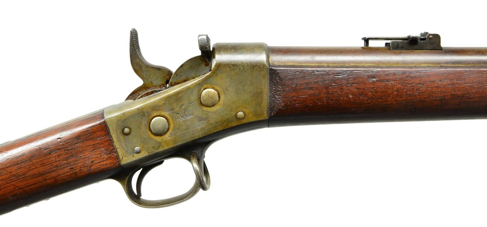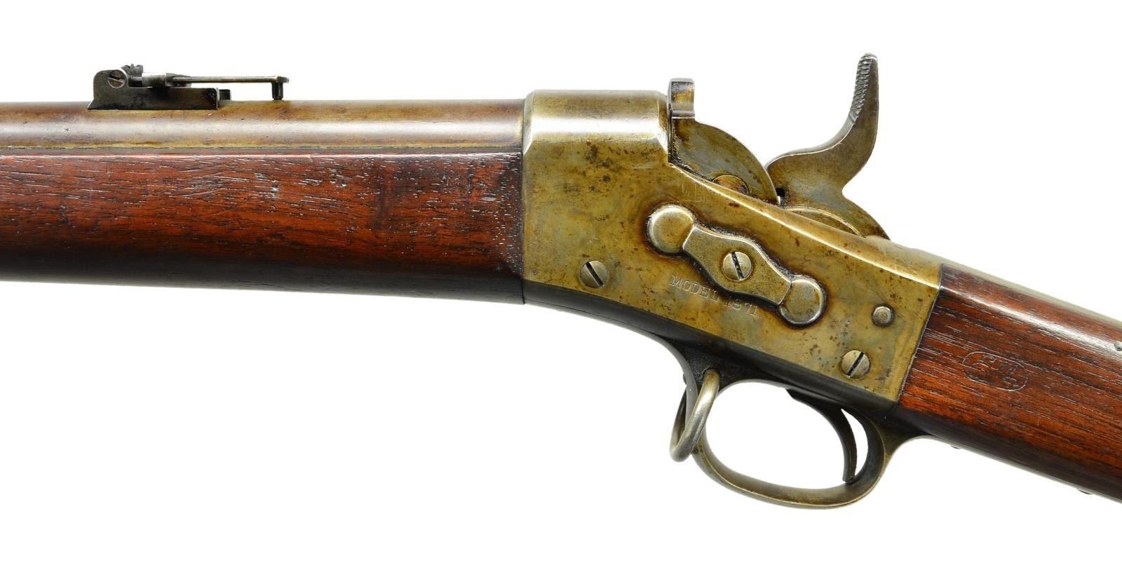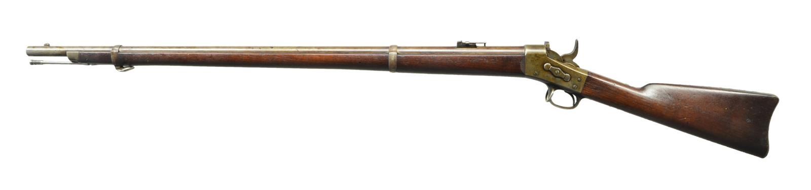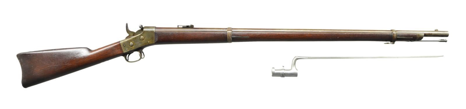 Cal. 50-70. NSN. Bbl. 36". Mfg. 1871-1872. Fixed front & folding ladder w/ slider rear sights. Two piece stock w/ two Bbl. bands; front band has a sling swivel. Bbl. in the white w/ case colored frame & tangs. Left stock flat w/ oval cartouche w/ Erskine Allen’s initials. UNATTACHED ACCESSORIES: Ramrod & “US” marked socket bayonet. CONDITION: metal shows a brown patina & some dried grease & areas of discoloration. Frame has muted, faint but visible case color. Stock has a clear Erskine Allen oval cartouche left flat; along w/ scattered dings, dents & scratches. Bore is good plus, strongly rifled w/ light pitting. PROVENANCE: From the Raymond Darida Estate. (01-22216/CW). ANTIQUE. $1,200-1,800.