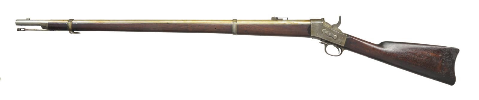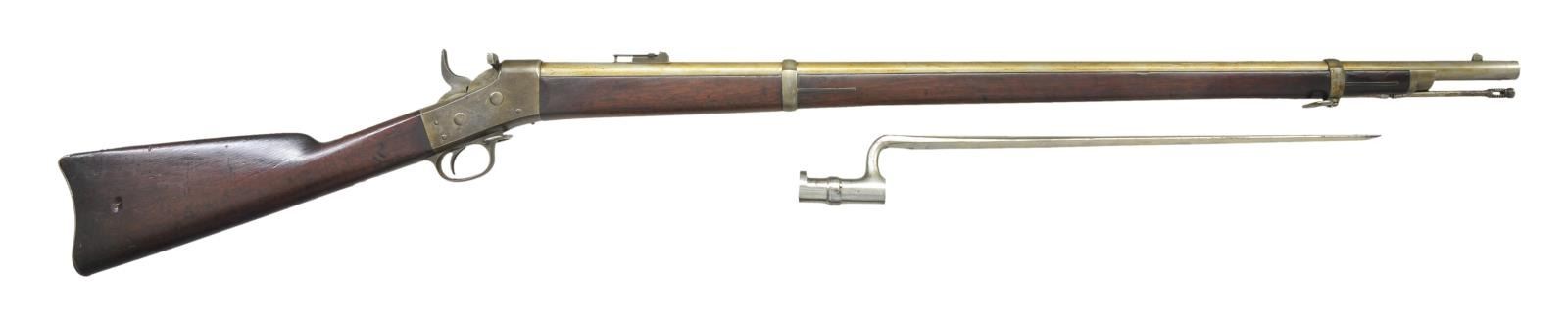 Cal. 50-70. NSN. Bbl. 36”. Mfg. 1871-1872. Fixed front & folding ladder adjustable rear sights. Two piece stock w/ two Bbl. bands; front band has a sling swivel. Bbl. in the white w/ case colored frame & tangs. Left stock flat w/ oval cartouche w/ Erskine Allen’s initials. UNATTACHED ACCESSORIES: Ramrod & “US” marked socket bayonet. CONDITION: metal remains in the white w/ dried grease throughout. Frame was case colored but now a fading brown/gray patina. Stock set has dings, dents & gouges. “ESA” oval cartouche is quite faint but remains visible. Bore is very good plus, bright & strongly rifled w/ fine to light pitting in the grooves. PROVENANCE: From the Raymond Darida Estate. (01-22218/CW). ANTIQUE. $800-1,200.