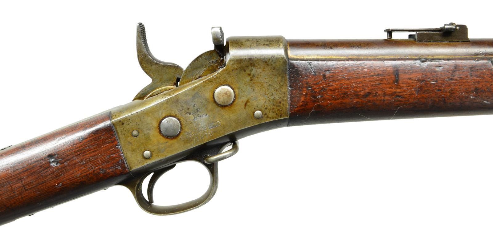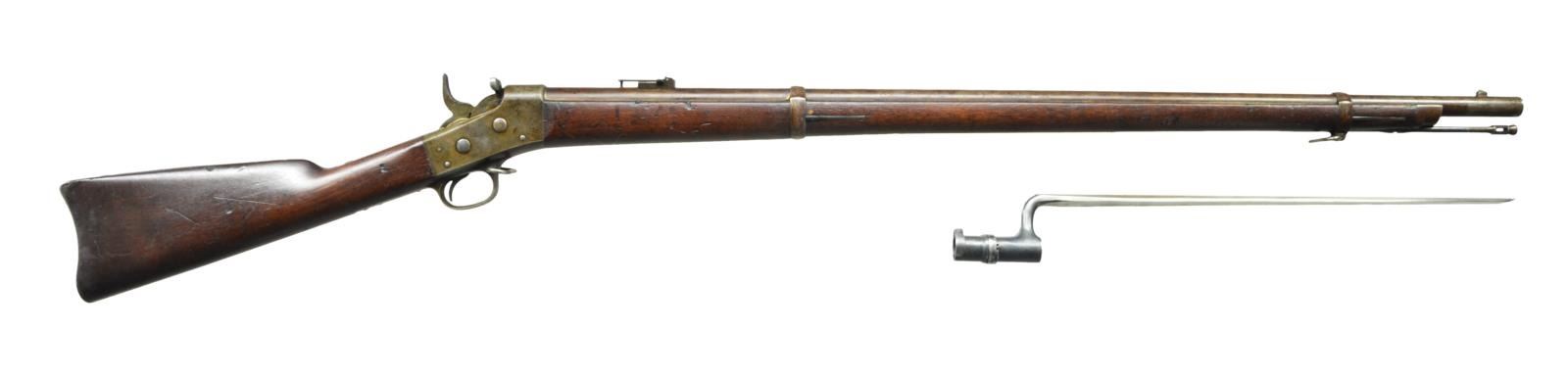 Cal. 50-70. NSN. Bbl. 36". Fixed front & folding ladder adjustable rear sights. Two piece stock w/ two Bbl. bands; front band has a sling swivel. Bbl. in the white w/ case colored frame & tangs. Left stock flat w/ oval cartouche w/ Erskine Allen’s initials. Unit marked “B2/11” on top of buttplate & “6” on left side buttstock. UNATTACHED ACCESSORIES: Ramrod & “US” marked socket bayonet. CONDITION: metal has a brown patina w/ discoloration & light corrosion. Frame retains faint traces & whispers of case color; but is mostly a gray patina. Stock set has numerous dings, dents & gouges. “ESA” cartouche is worn right side but balance is clear. Bore is good, strongly rifled, but a bit dull & shows light to perhaps moderate pitting. PROVENANCE: From the Raymond Darida Estate. (01-22220/CW). ANTIQUE. $800-1200.