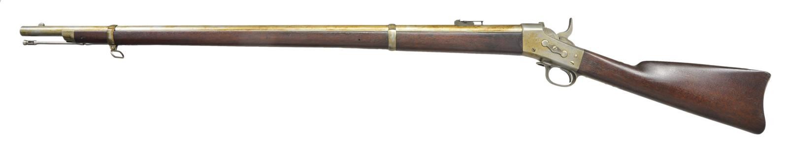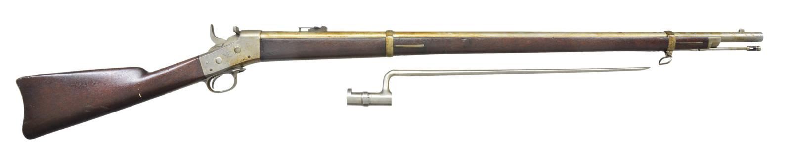 Cal. 50-70. NSN. Bbl. 36". Fixed front & folding ladder adjustable rear sights. Two piece stock w/ two Bbl. bands; front band has a sling swivel. Bbl. in the white w/ case colored frame & tangs. Left stock flat has clear “ESA” cartouche. UNATTACHED ACCESSORIES: Ramrod & “US” marked socket bayonet cleaned to bare metal w/ fine scattered pitting. CONDITION: metal is in the white w/ dried grease & discoloration. Frame has been cleaned to bare metal. Stock set has a light added coat of finish over scattered light dings, dents & bruises. Bore is very good, bright & strongly rifled. PROVENANCE: From the Raymond Darida Estate. (01-22221/CW). ANTIQUE. $800-1,200.