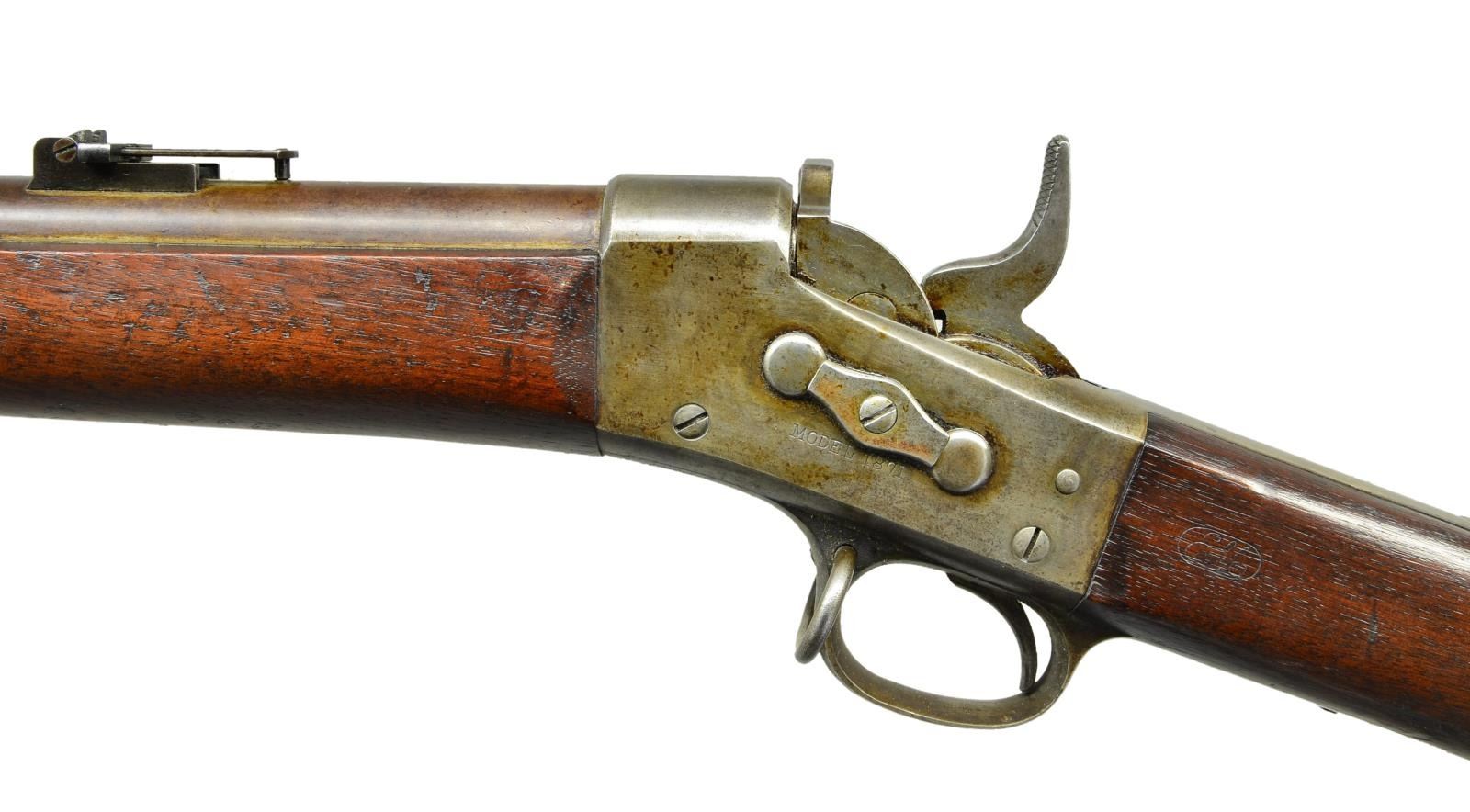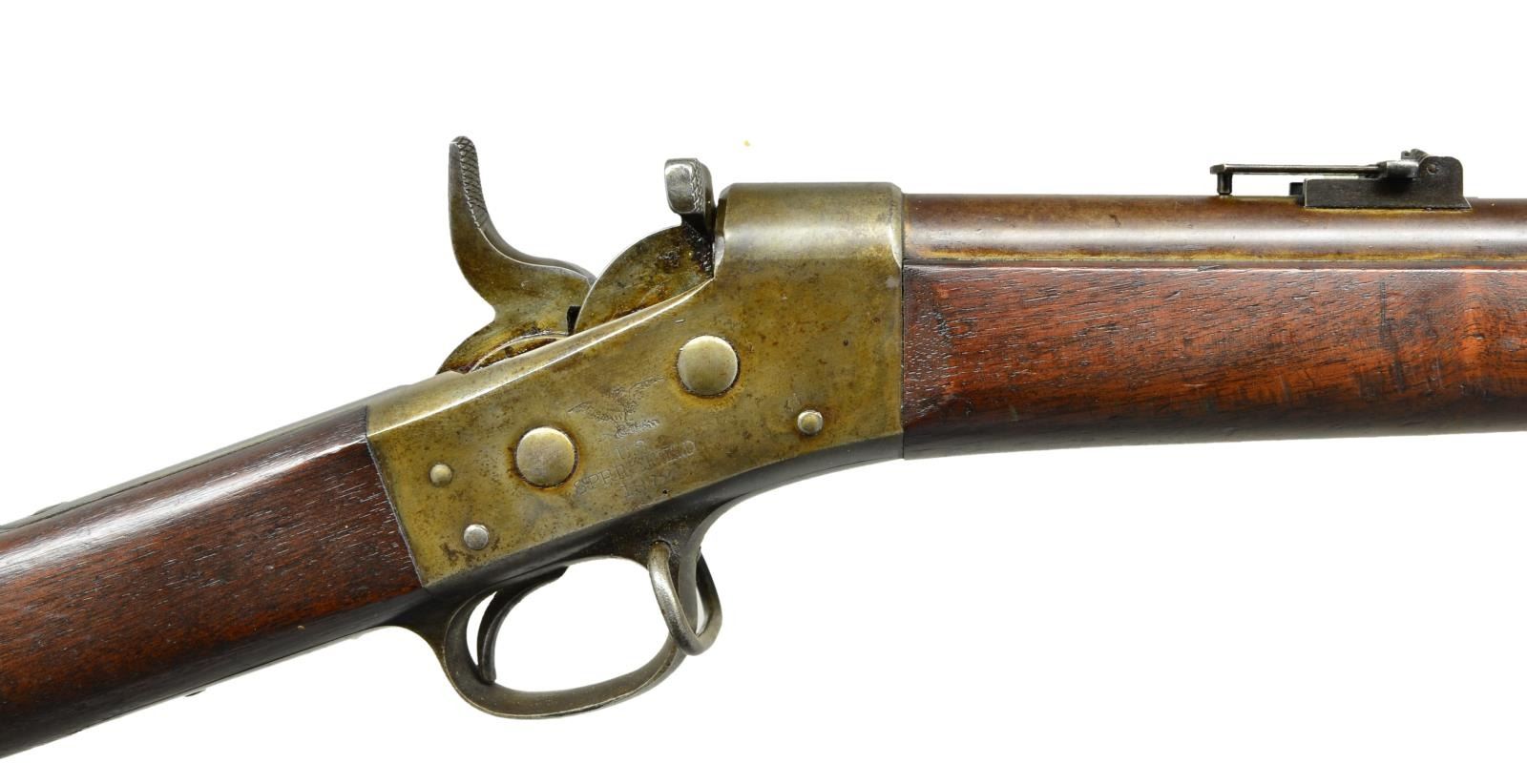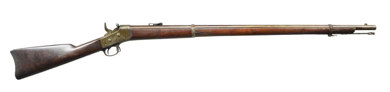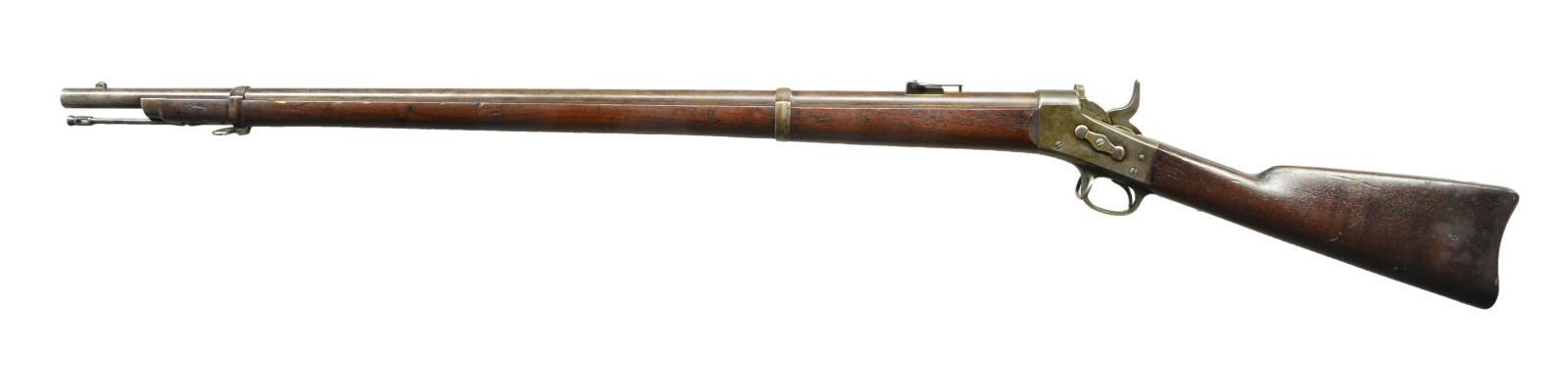 Cal. 50-70. NSN. Bbl. 36". Fixed front & folding ladder adjustable rear sights. Two piece stock w/ two Bbl. bands; front band has a sling swivel. Bbl. in the white w/ case colored frame & tangs. Left stock flat has clear “ESA” cartouche. UNATTACHED ACCESSORIES: Ramrod. CONDITION: metal is a brown/gray patina. Frame has a few very faint traces of case color w/ balance a blue/gray patina. Stock set has scattered marks, dents & shallow gouges. Bore is good, w/ strong rifling, a bit dull & w/ light scattered pitting. PROVENANCE: From the Raymond Darida Estate. (01-22223/CW). ANTIQUE. $700-$1,000.