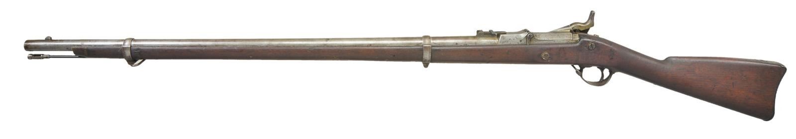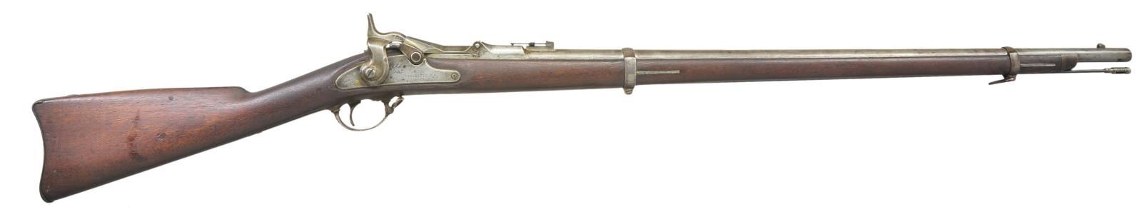 Cal. 50-70. S# 21866. Bbl. 32 1/2” w/ graduated leaf rear sight. 1869 dated high arch breech block. 1863 dated Springfield lock. 2 band fastened walnut stock w/ iron fittings & slotted tip iron ramrod. Total of 51,389 mfg. 1868-1872. CONDITION: metal has a light gray brown patina. Heavily sanded stock has dark refinish showing dents & marks. Bore retains sound rifling showing some light pitting. (01-23138/DS). ANTIQUE. $600-900.