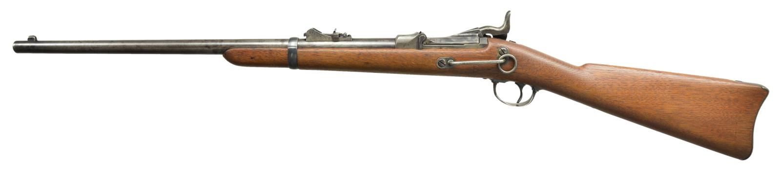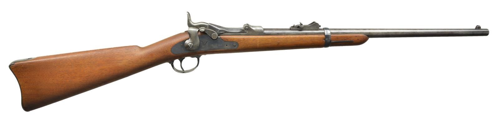 Cal. 45-70. S# 182036. Bbl. 22" with pinned blade front sight and model 1879 graduated carbine rear sight. Low arch model 1873 marked breach block. Springfield marked lock. Band fastened carbine stock with trapdoor carbine buttplate having saddle ring and bar on left side. Stock has weak illegible cartouche. CONDITION: metal is fading to gray. Sanded and refinished stock shows a few marks. Bright bore retains strong rifling. (01-22044/DS). ANTIQUE. $800-1,200.