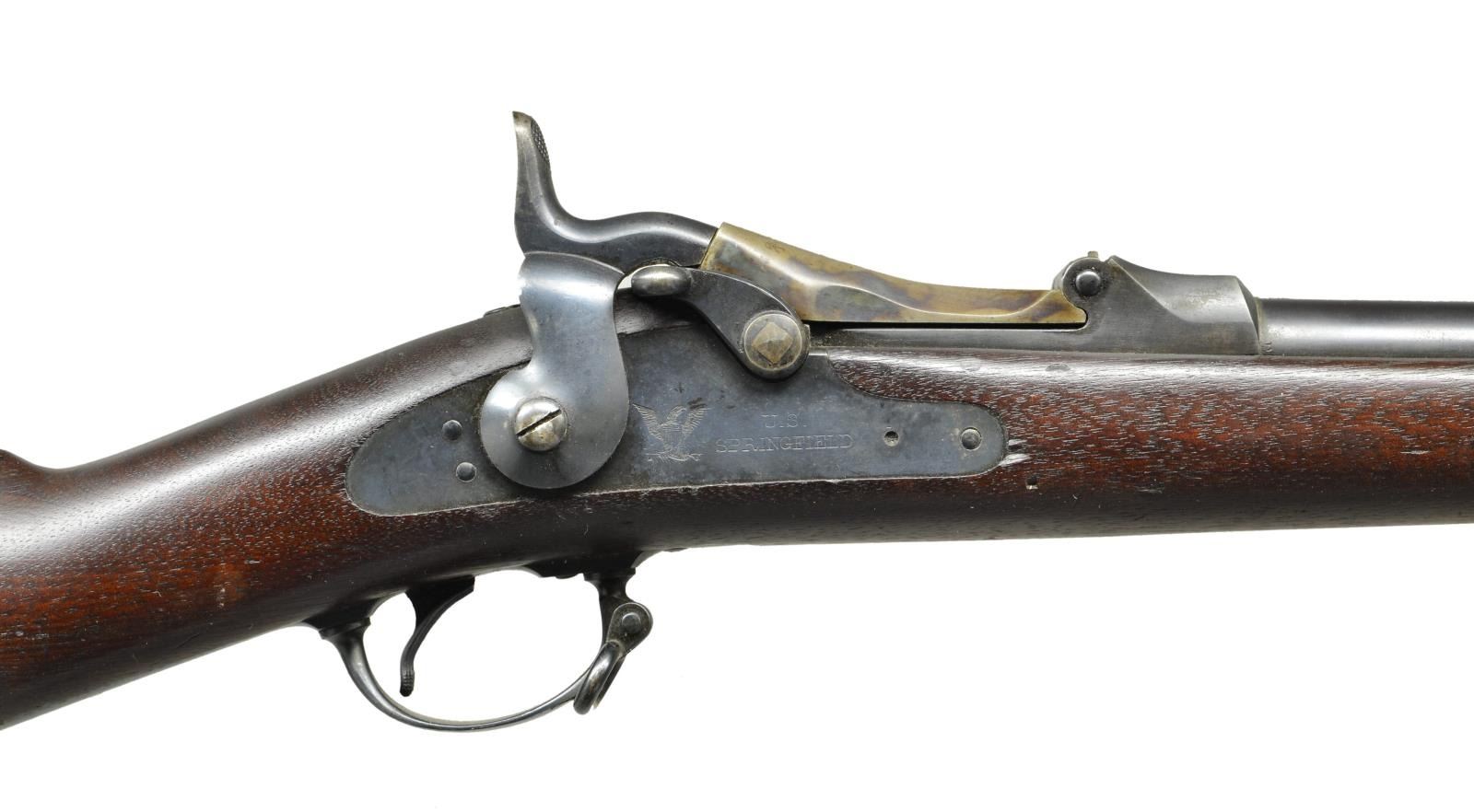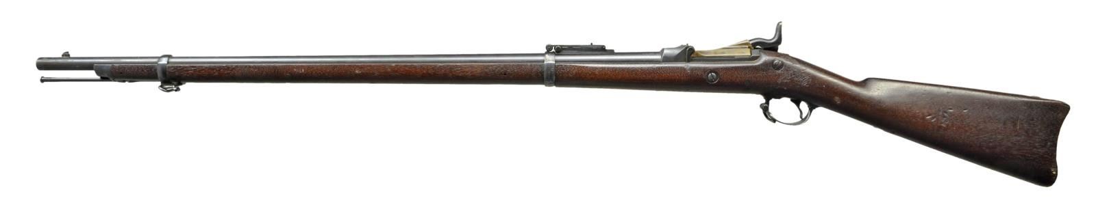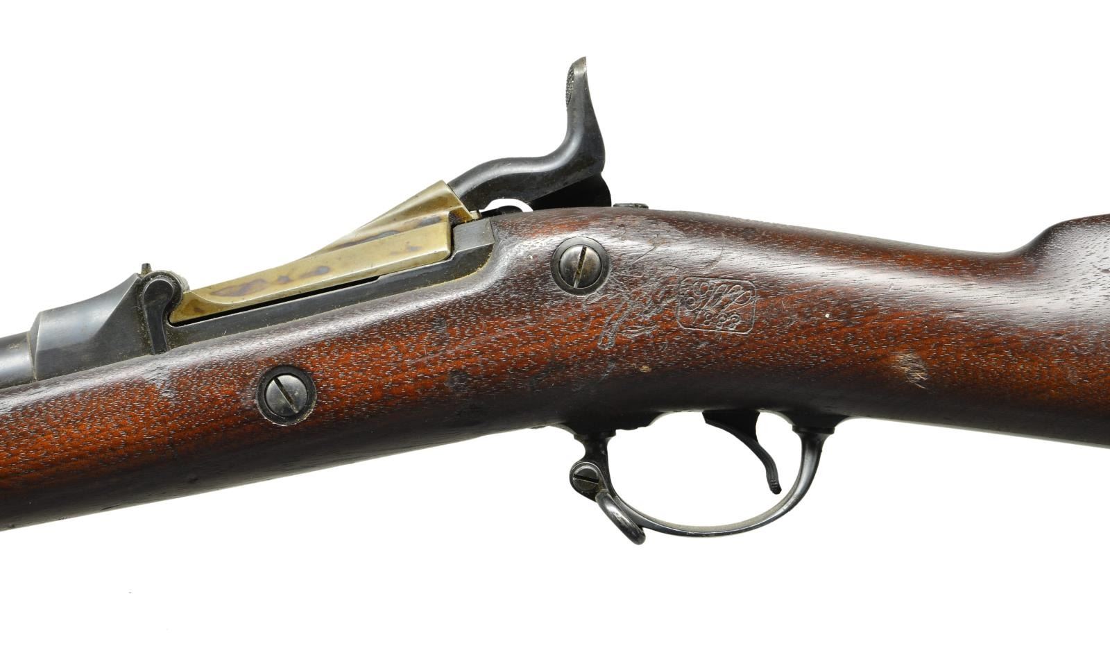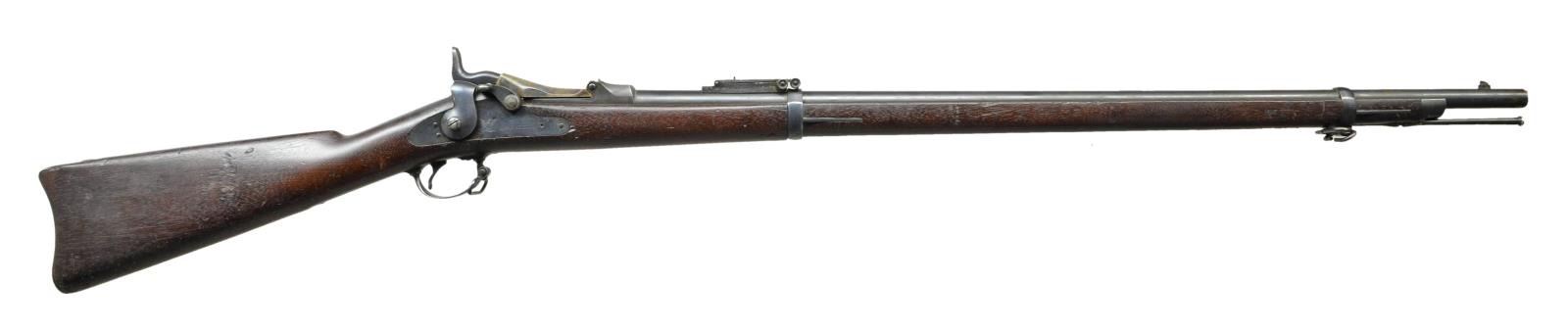 RIFLE. Cal. 45-70. S# 423060. Bbl. 32 5/8" with pinned blade front sight and Buffington rear sight. Case colored low arch 1884 dated breach block. Springfield marked lock. 2 band fastened walnut stock with sharp 1888 dated cartouche on left ear. Toeline is marked W over circle P. Buttplate has electric pencil marked social security number. Slotted tipped button ramrod. CONDITION: very fine. Bbl. lock and fittings retain 90% dull lightly faded original blue. Breach block and tang retain 90% nicely visible case colors. Original wood finish with good markings show scattered scratches, dents and marks. Very good bright bore retains strong rifling. (01-22041/DS). ANTIQUE. $1,000-1,500.