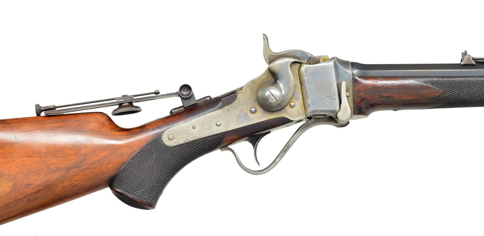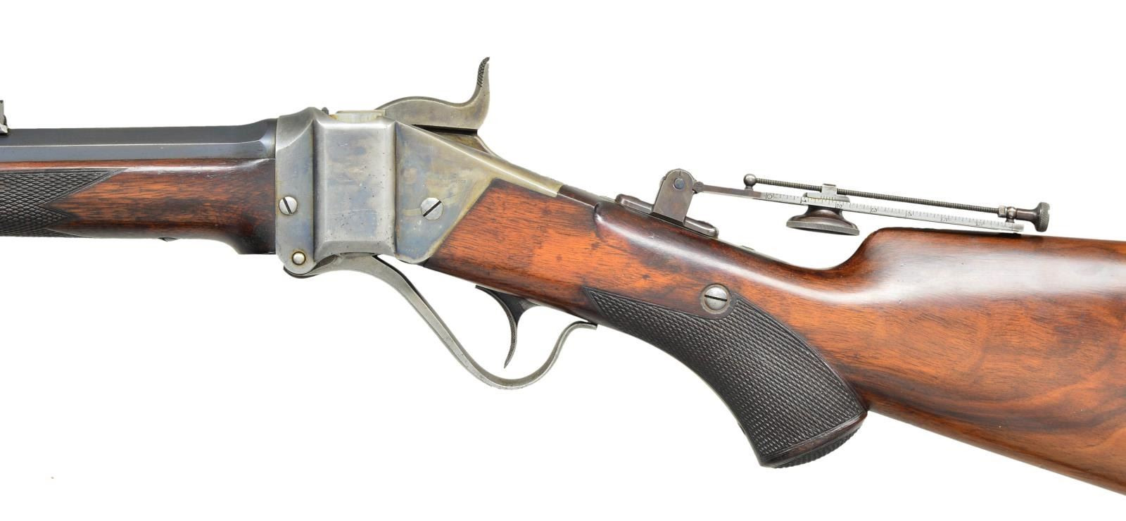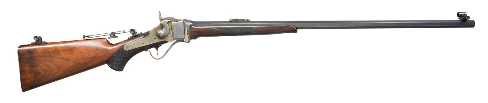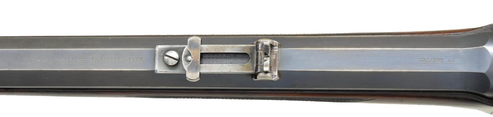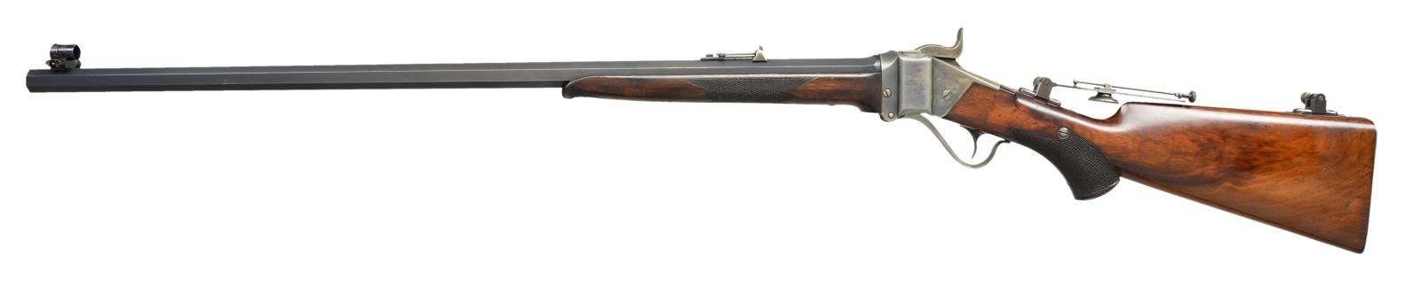 TARGET RIFLE. Cal. 44-77 Bottleneck. S# 157305. Bbl. 30 inch octagon with Bridgeport address and “Old Reliable” marking. Left flat is stamped “08”. Wind gauge front sight, Lawrence patent folding leaf rear sight and long range Vernier tang sight. Blue finish with case colored action. Schnabel tipped walnut forearm has wraparound point pattern checkering with an additional heart shaped panel tip. Pistol grip stock has checkered wrist with additional checkering on bottom of grip. Stock has additional base for Vernier sight on comb. Checkered steel shotgun butt plate. CONDITION: fine. Bbl. retains over 70% lightly faded blue showing edge wear. Action retains 60% case colors showing carry wear. Original wood finish shows light wear with scattered scratches and marks. Bright bore retains strong rifling. (01-21903/DS). ANTIQUE. $8,000-12,000.